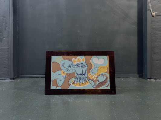 Set of 6 Teak and Blue Upholstered Dining Chairs