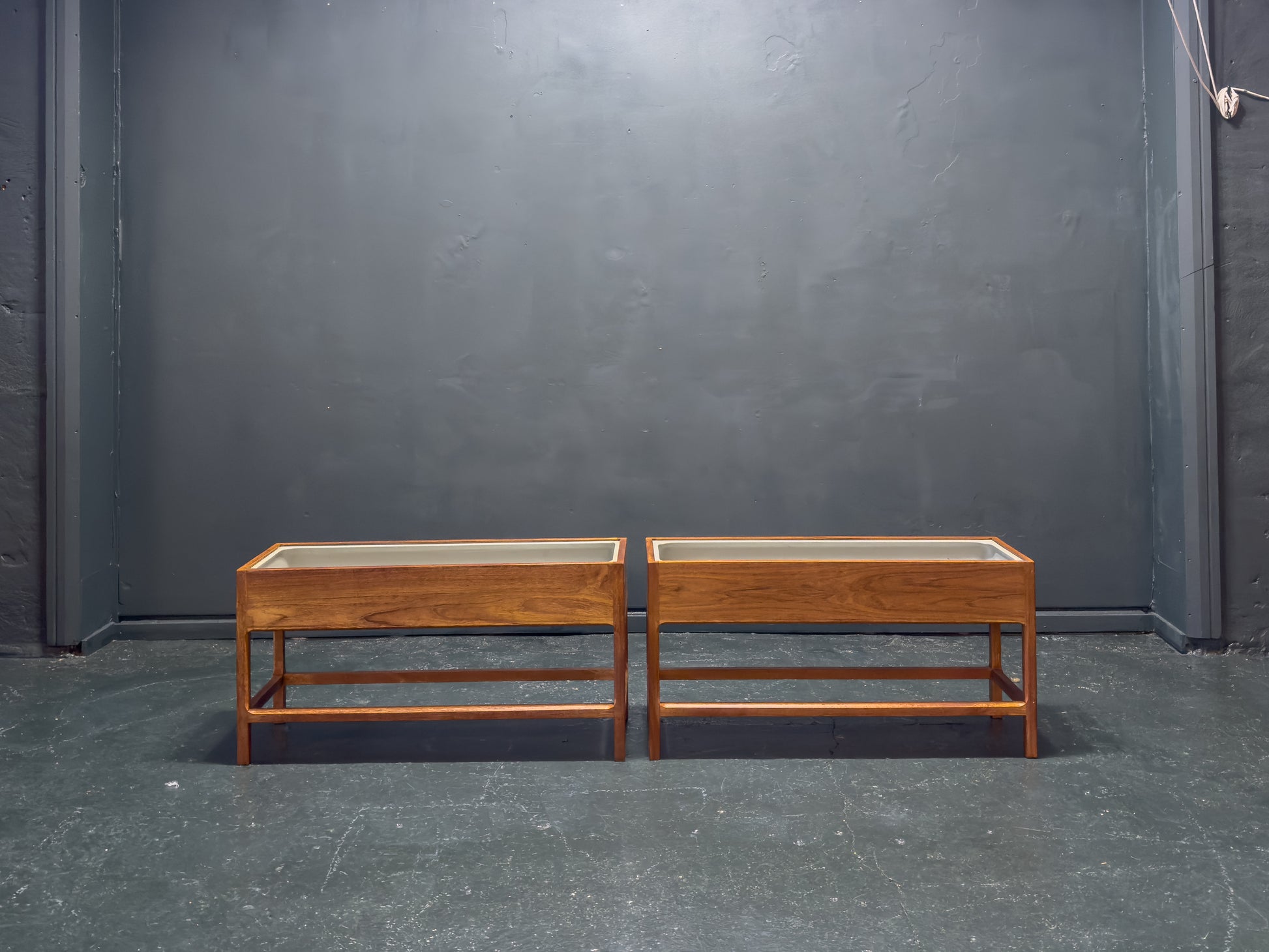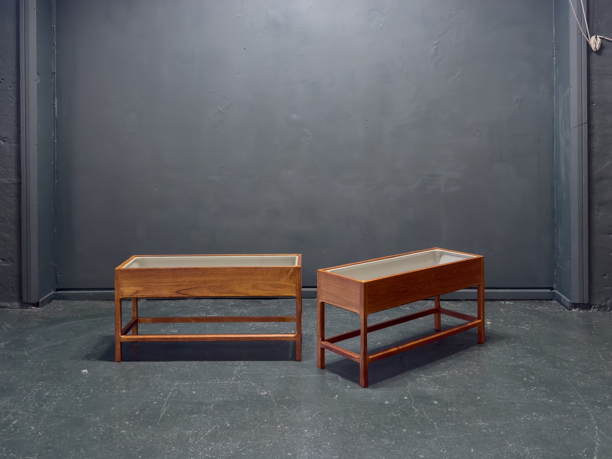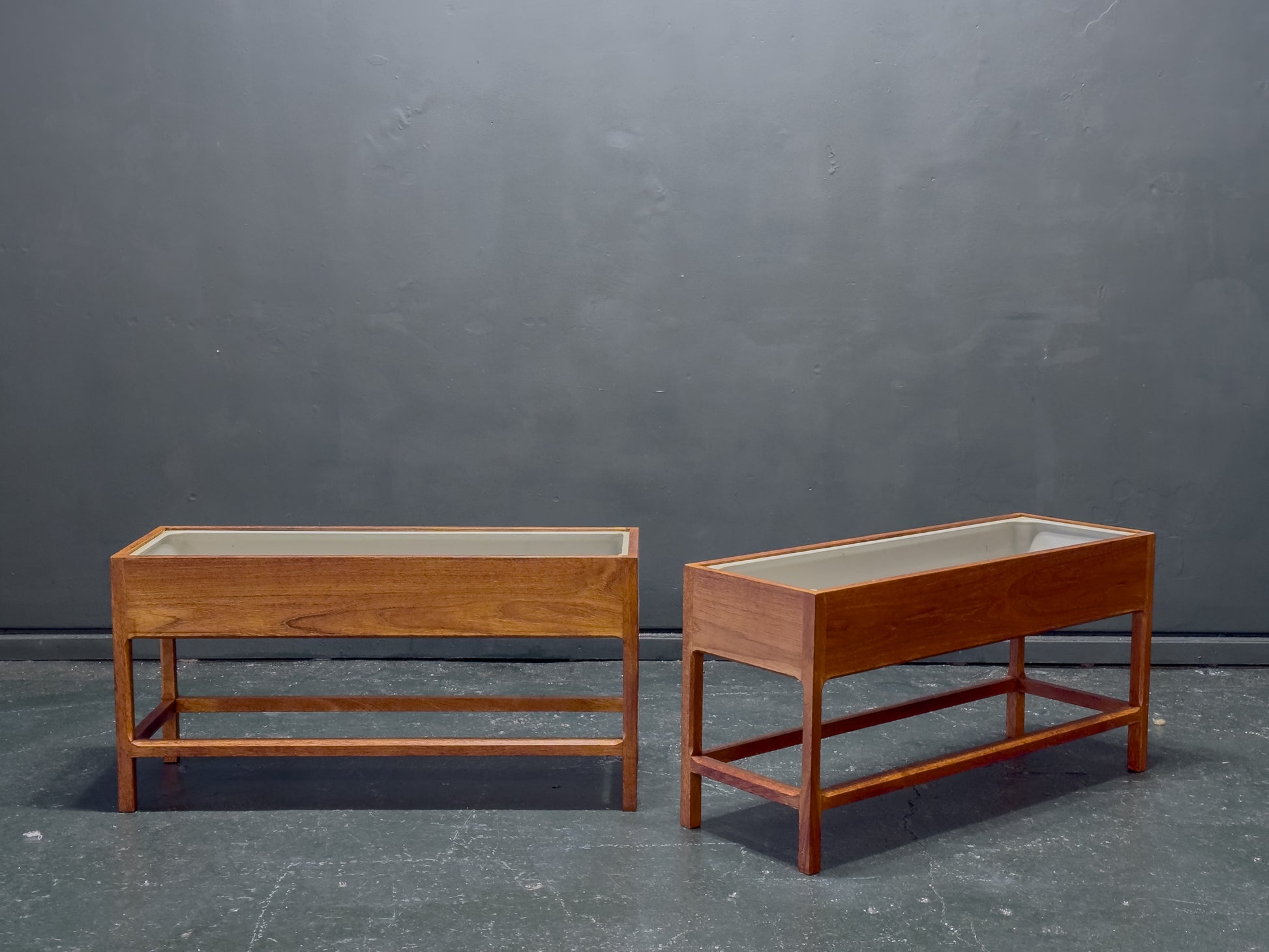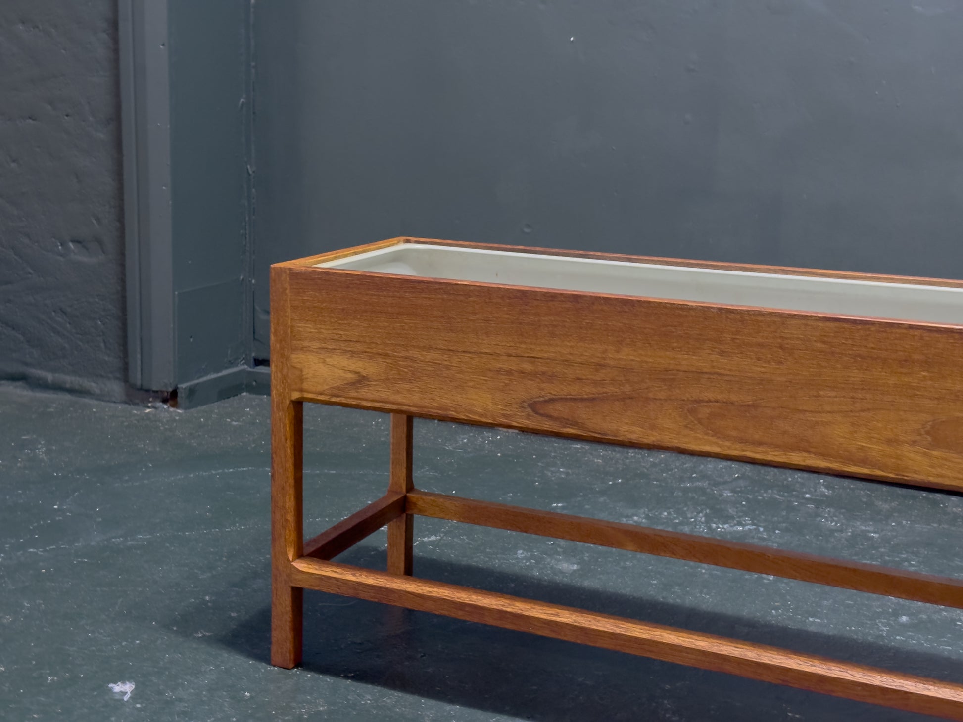 The joinery features precision mitered corners, ensuring seamless transitions across the planter box, elevated on a four-point solid teak base characterized by Kristiansen’s signature tapered "cigar" legs.