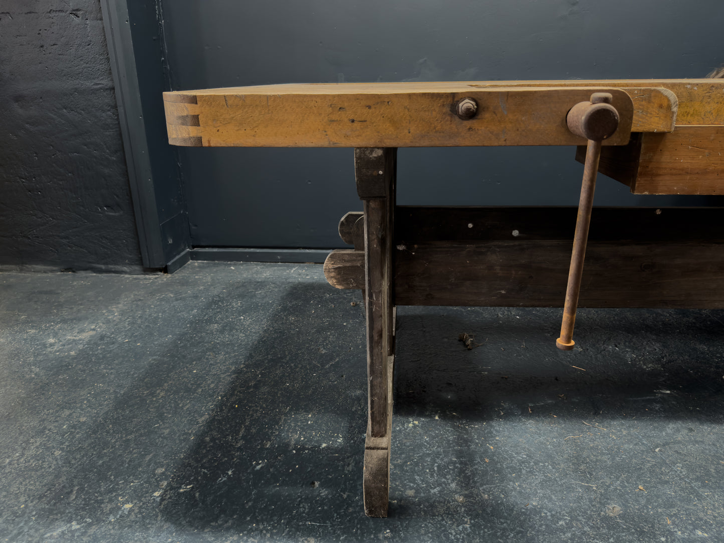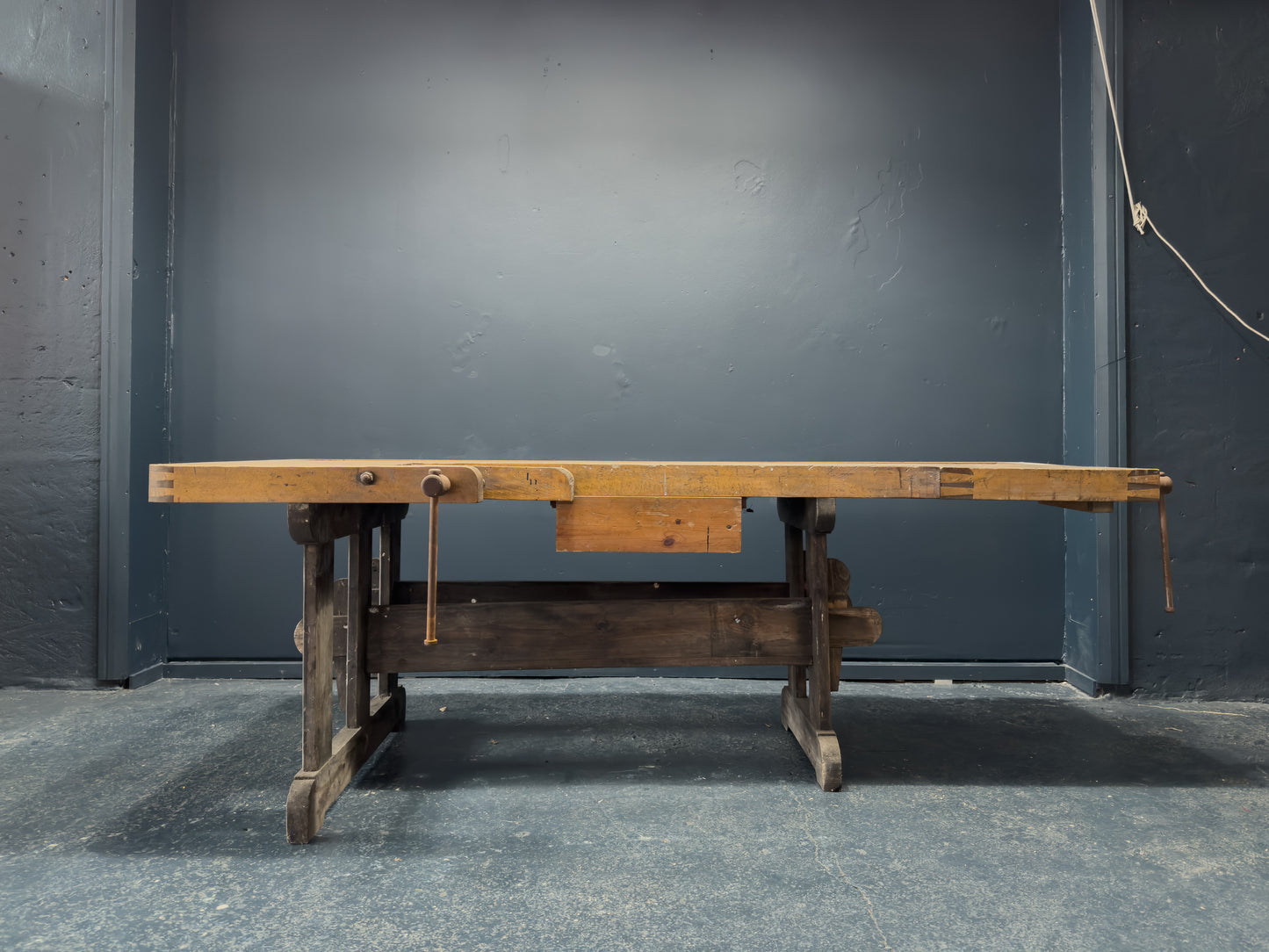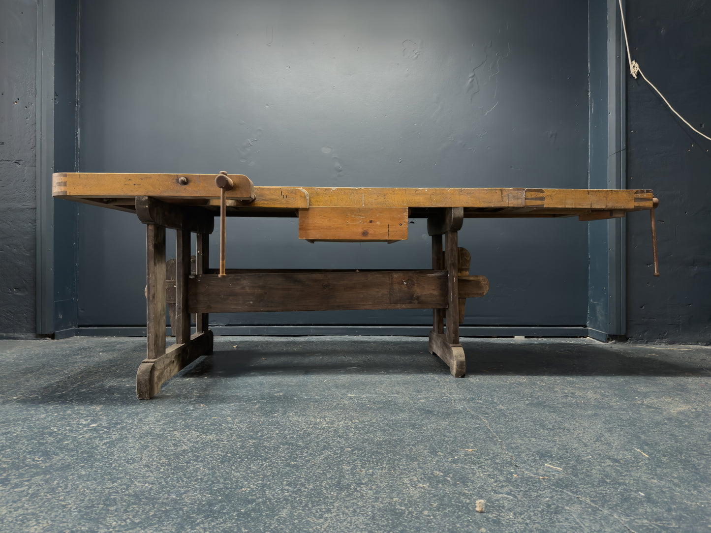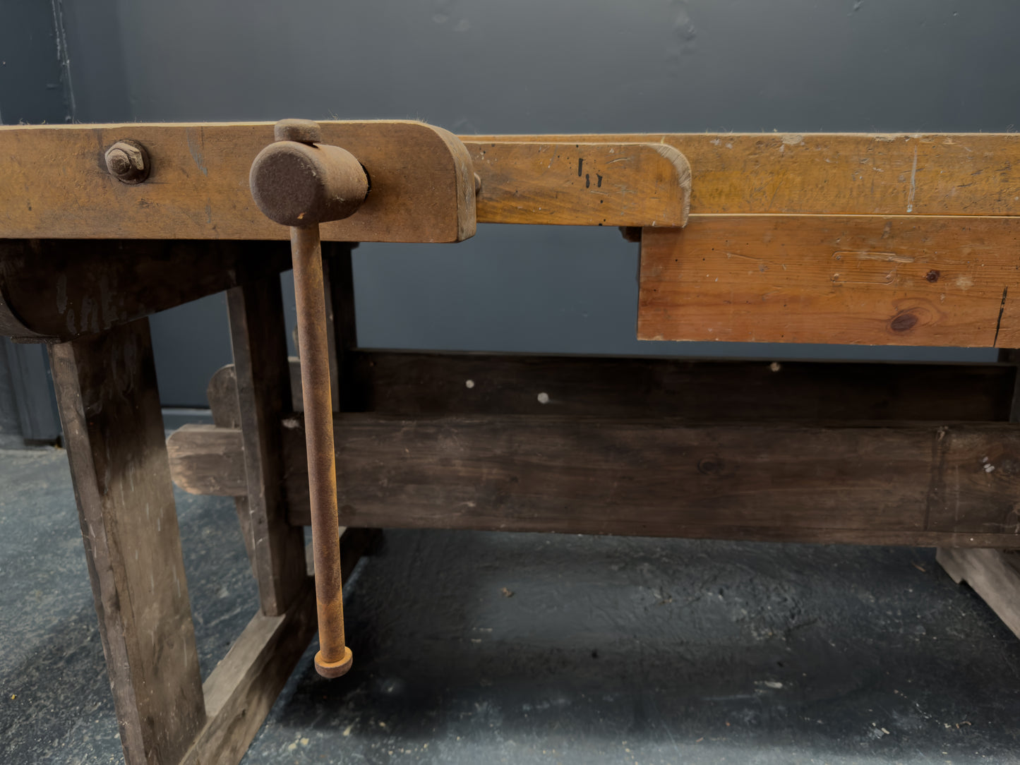 This very large classic solid workbench is made from a wonderful solid oak. Beautifully constructed, it is full of character and history. Featuring all its original functioning mechanisms and stunning exposed joinery, this piece is practical while also retaining its beauty and elegance that oozes from the craftsmanship and natural materials.