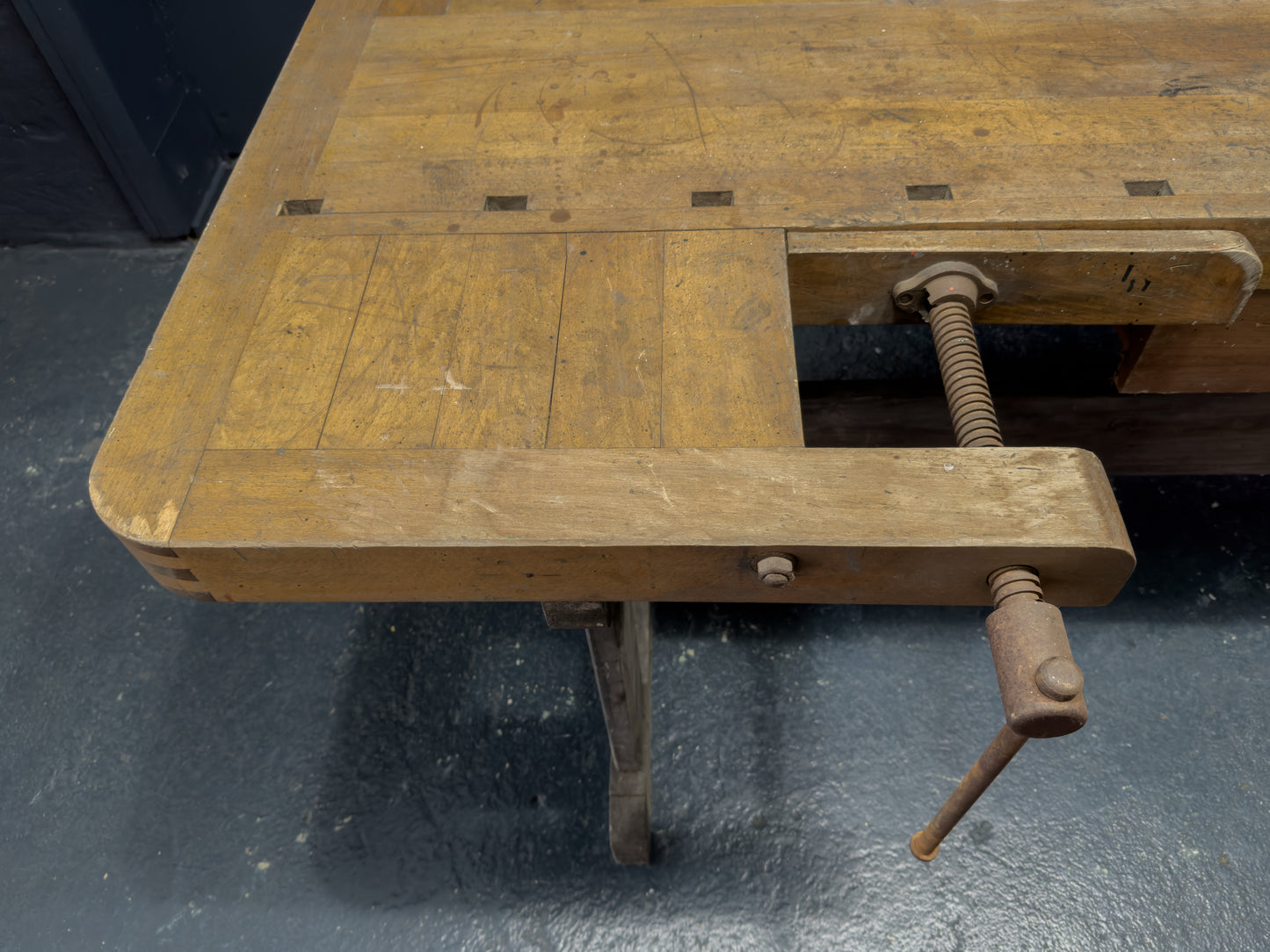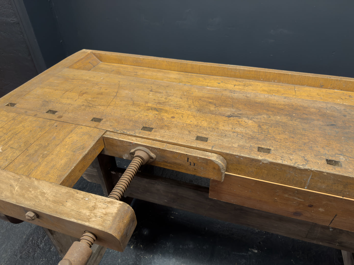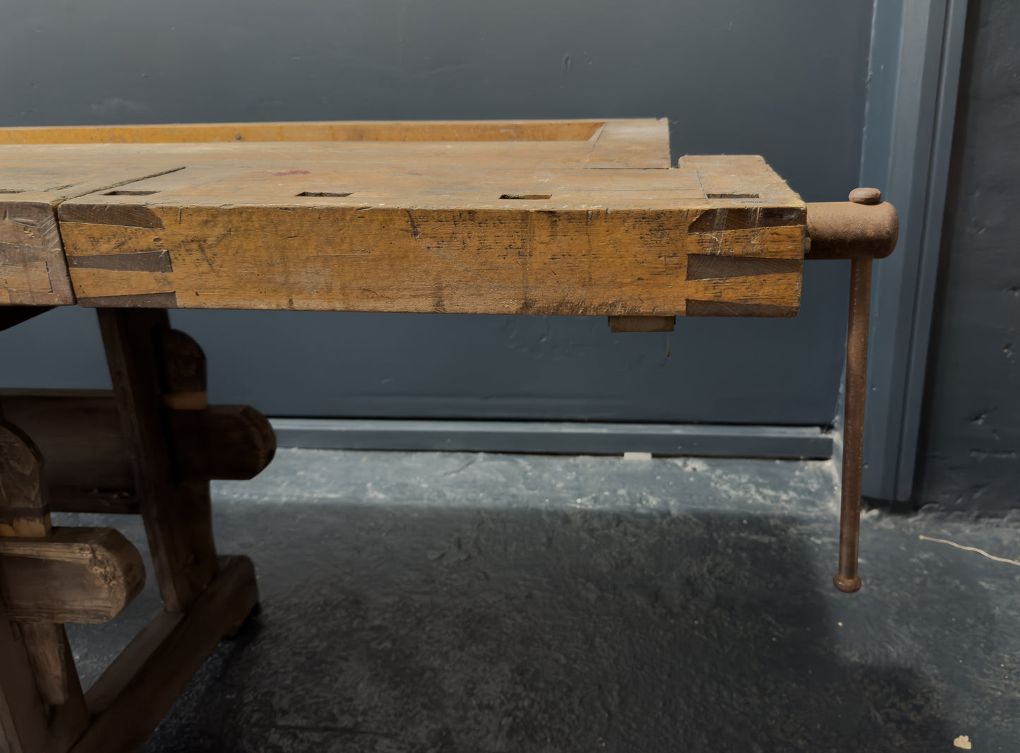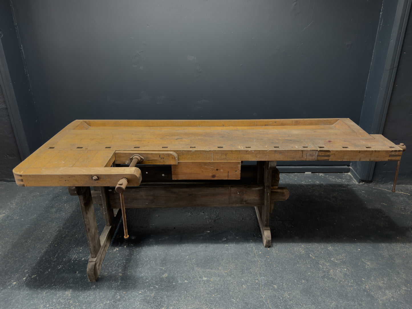 This very large classic solid workbench is made from a wonderful solid oak. Beautifully constructed, it is full of character and history. Featuring all its original functioning mechanisms and stunning exposed joinery, this piece is practical while also retaining its beauty and elegance that oozes from the craftsmanship and natural materials.
