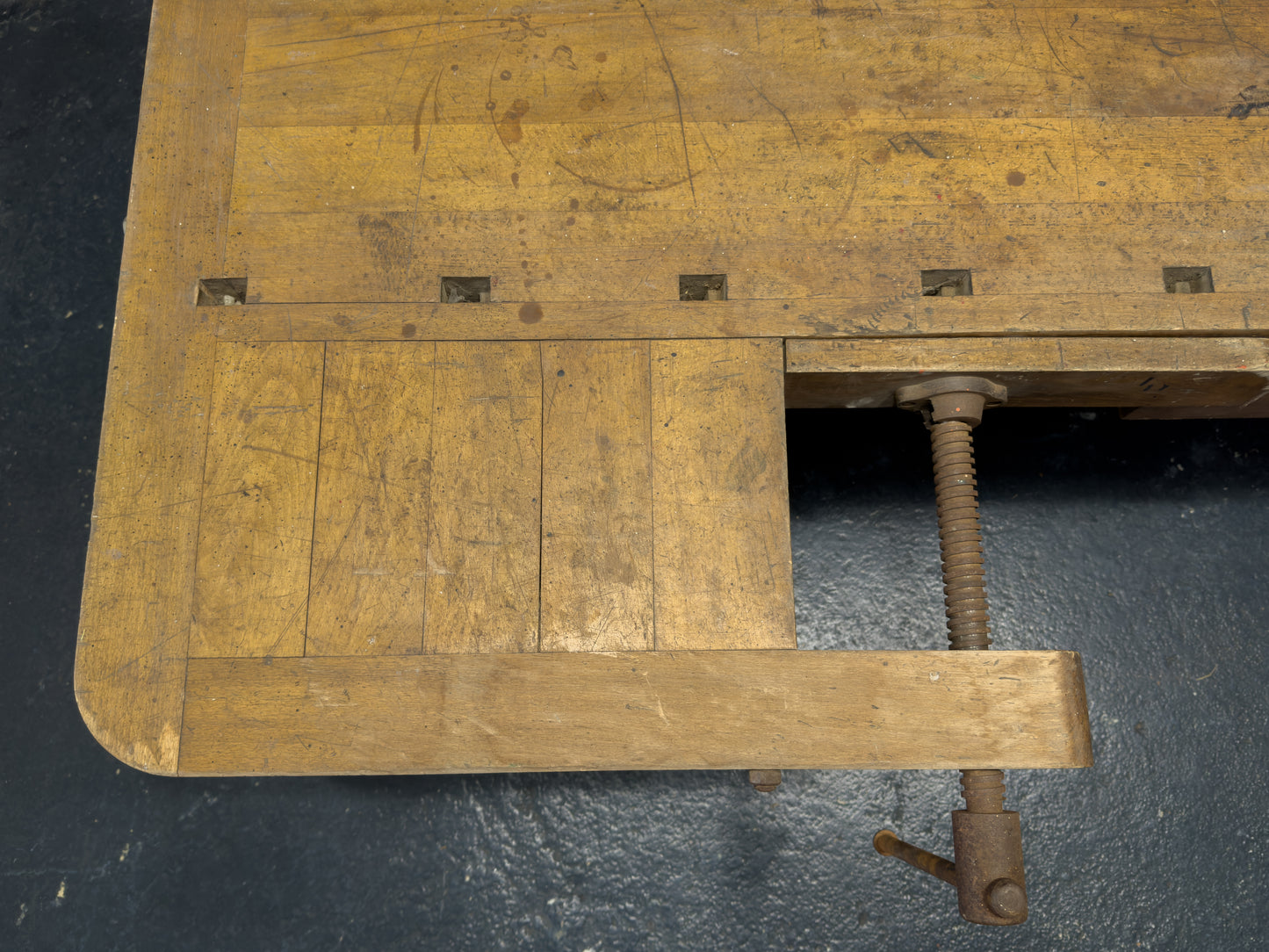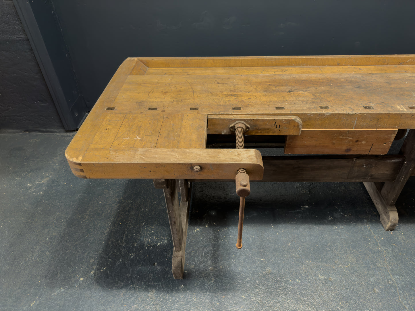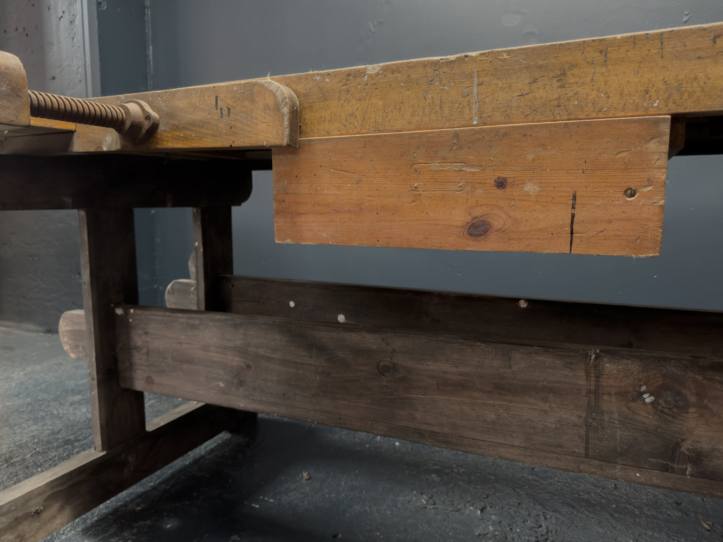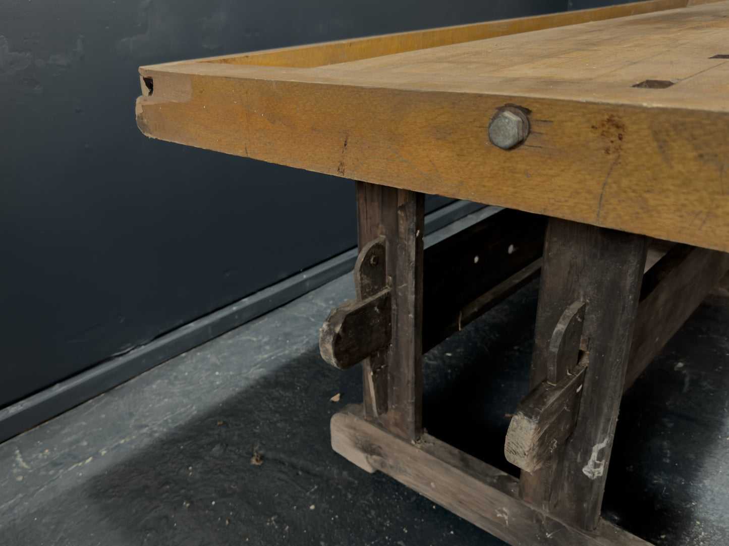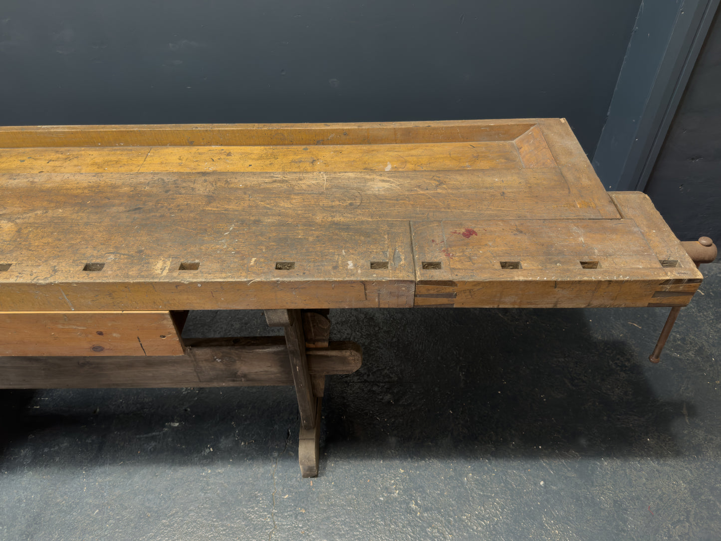 This very large classic solid workbench is made from a wonderful solid oak. Beautifully constructed, it is full of character and history. Featuring all its original functioning mechanisms and stunning exposed joinery, this piece is practical while also retaining its beauty and elegance that oozes from the craftsmanship and natural materials.