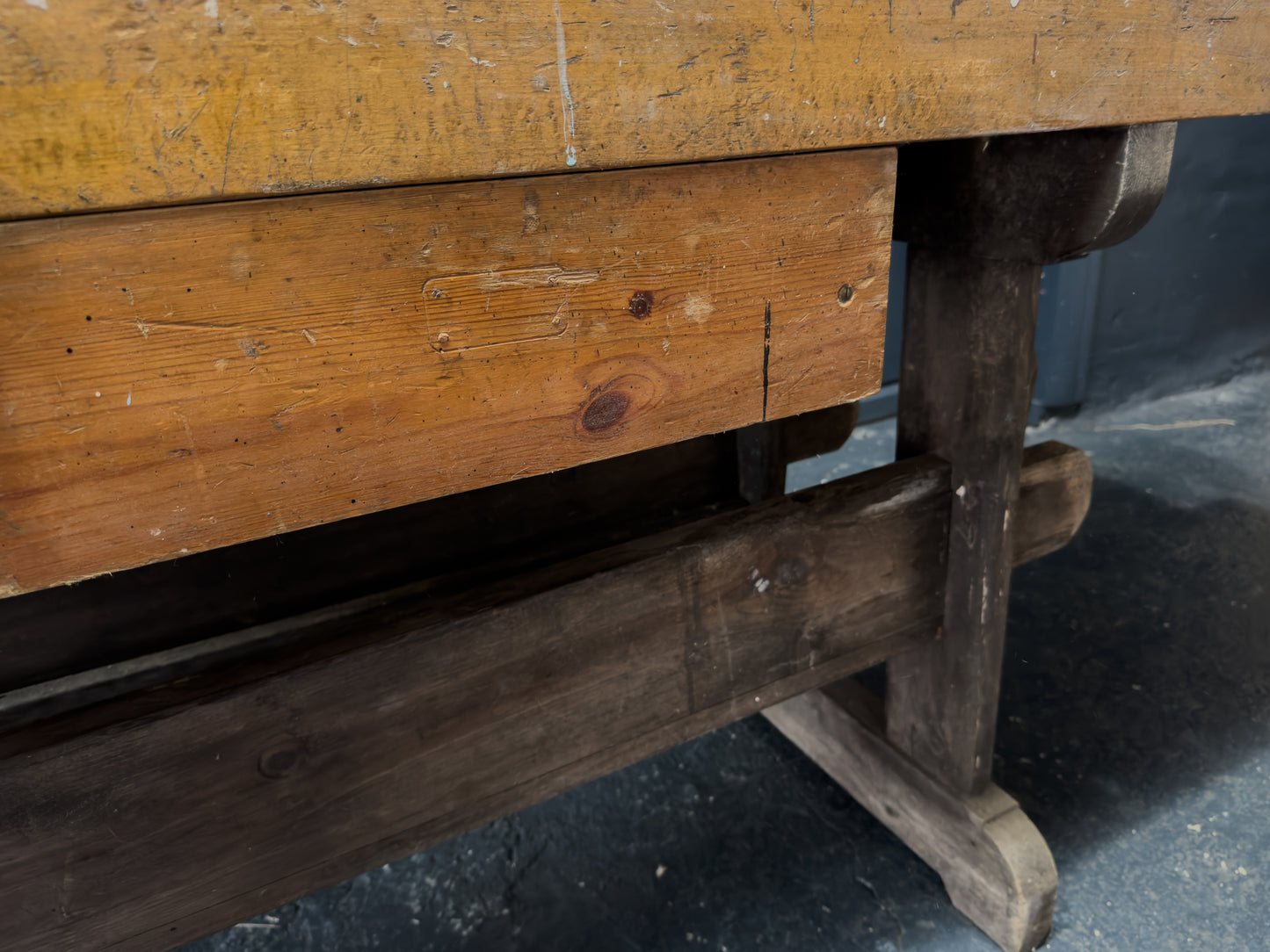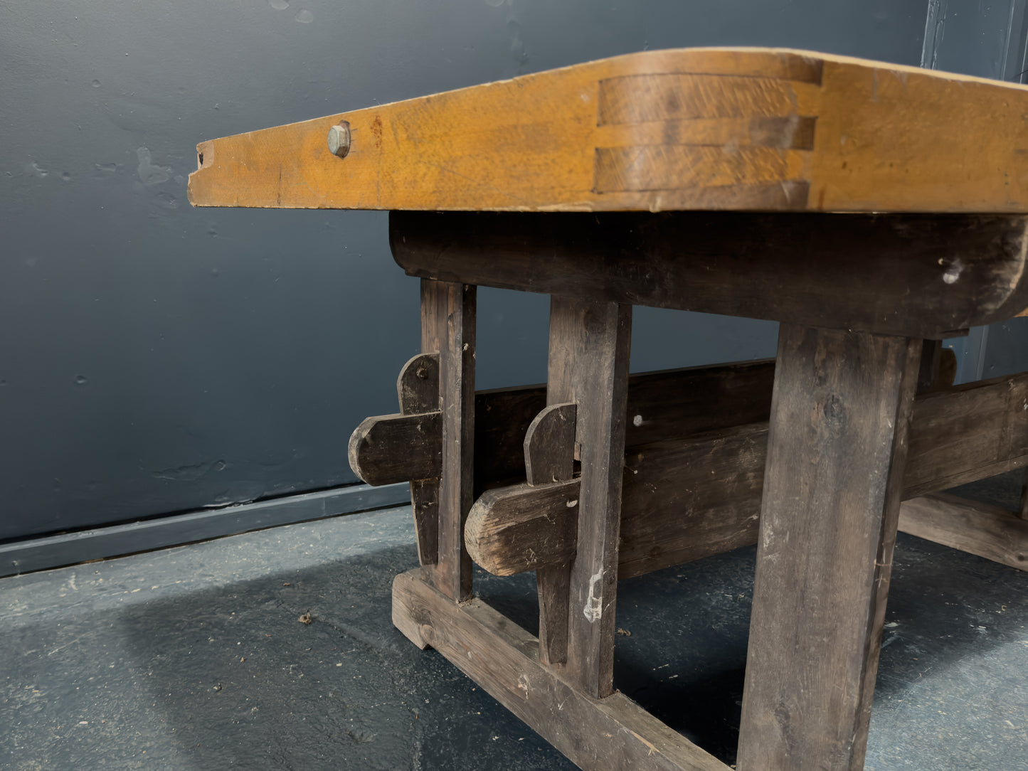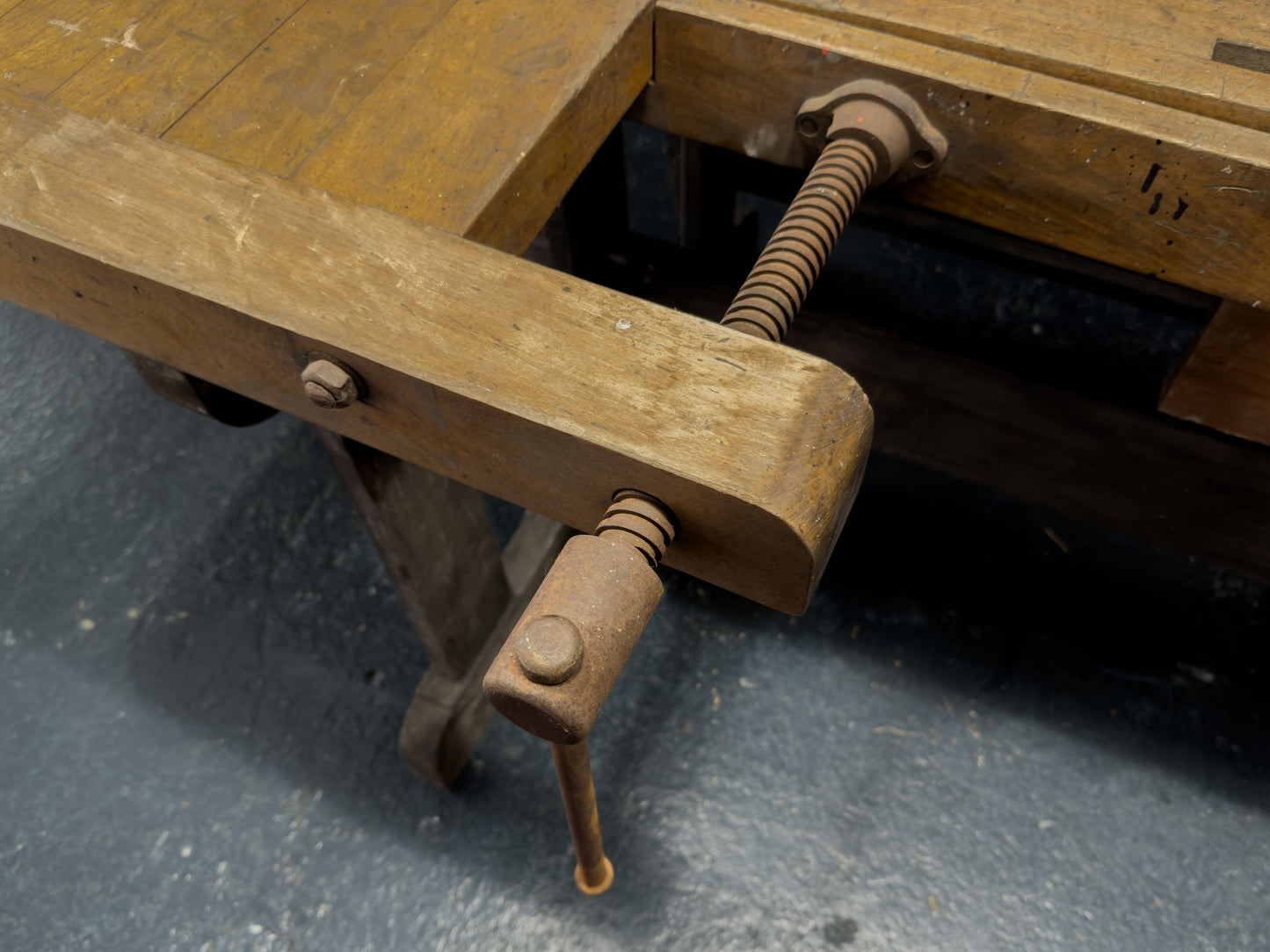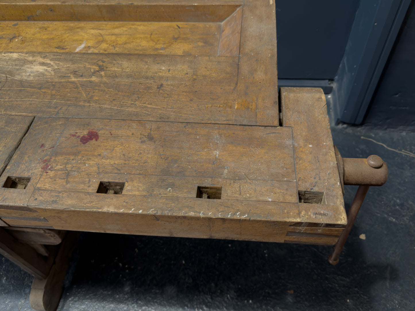 This very large classic solid workbench is made from a wonderful solid oak. Beautifully constructed, it is full of character and history. Featuring all its original functioning mechanisms and stunning exposed joinery, this piece is practical while also retaining its beauty and elegance that oozes from the craftsmanship and natural materials.