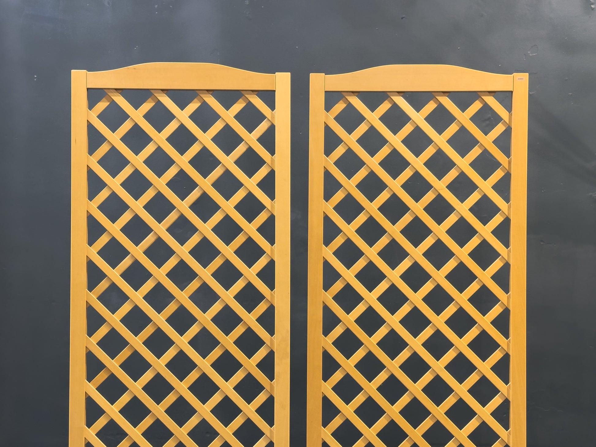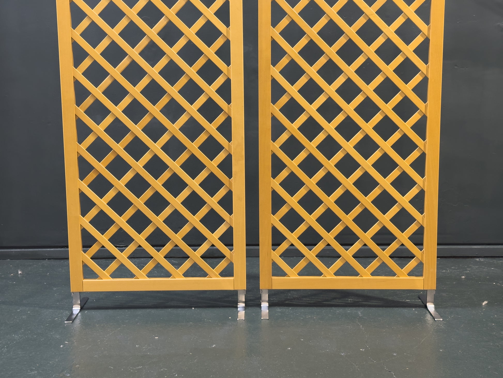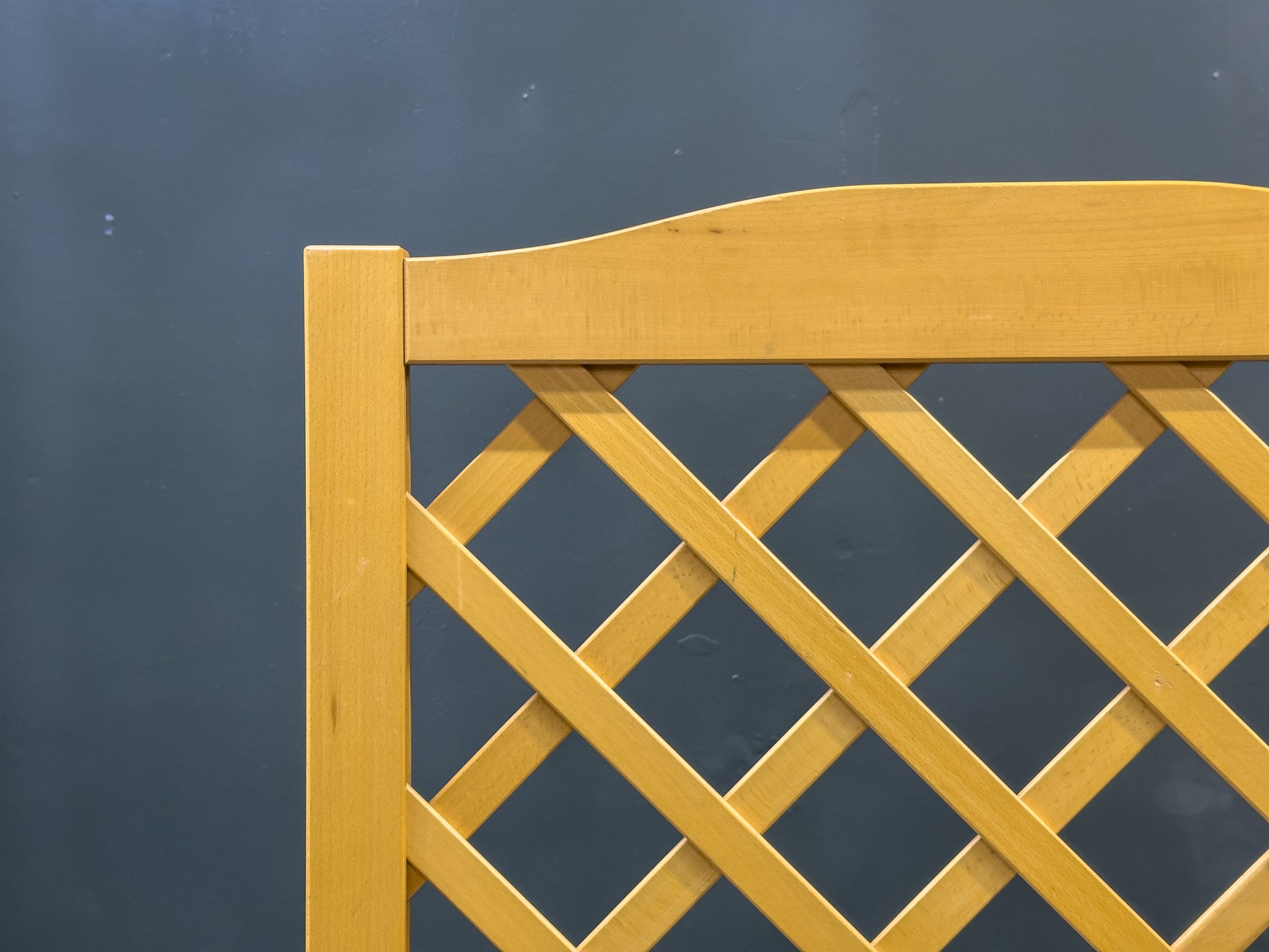 A refined beech and chrome screen featuring a clean, architectural lattice design that balances warmth and modernity. Formed from solid beech, the panels display a light, natural tone and crisp geometric cross-pattern, allowing light to pass through while still providing a sense of separation and privacy.