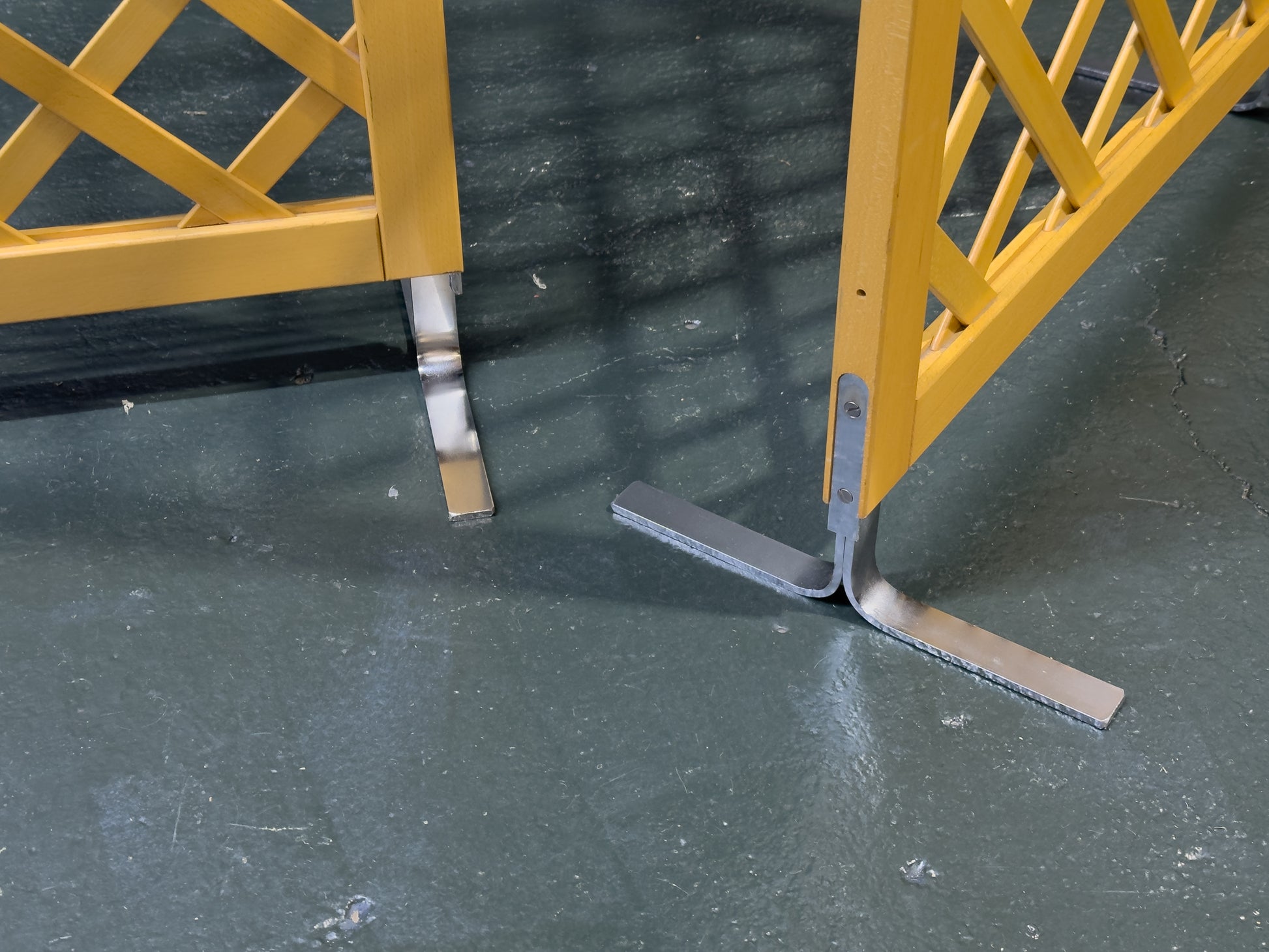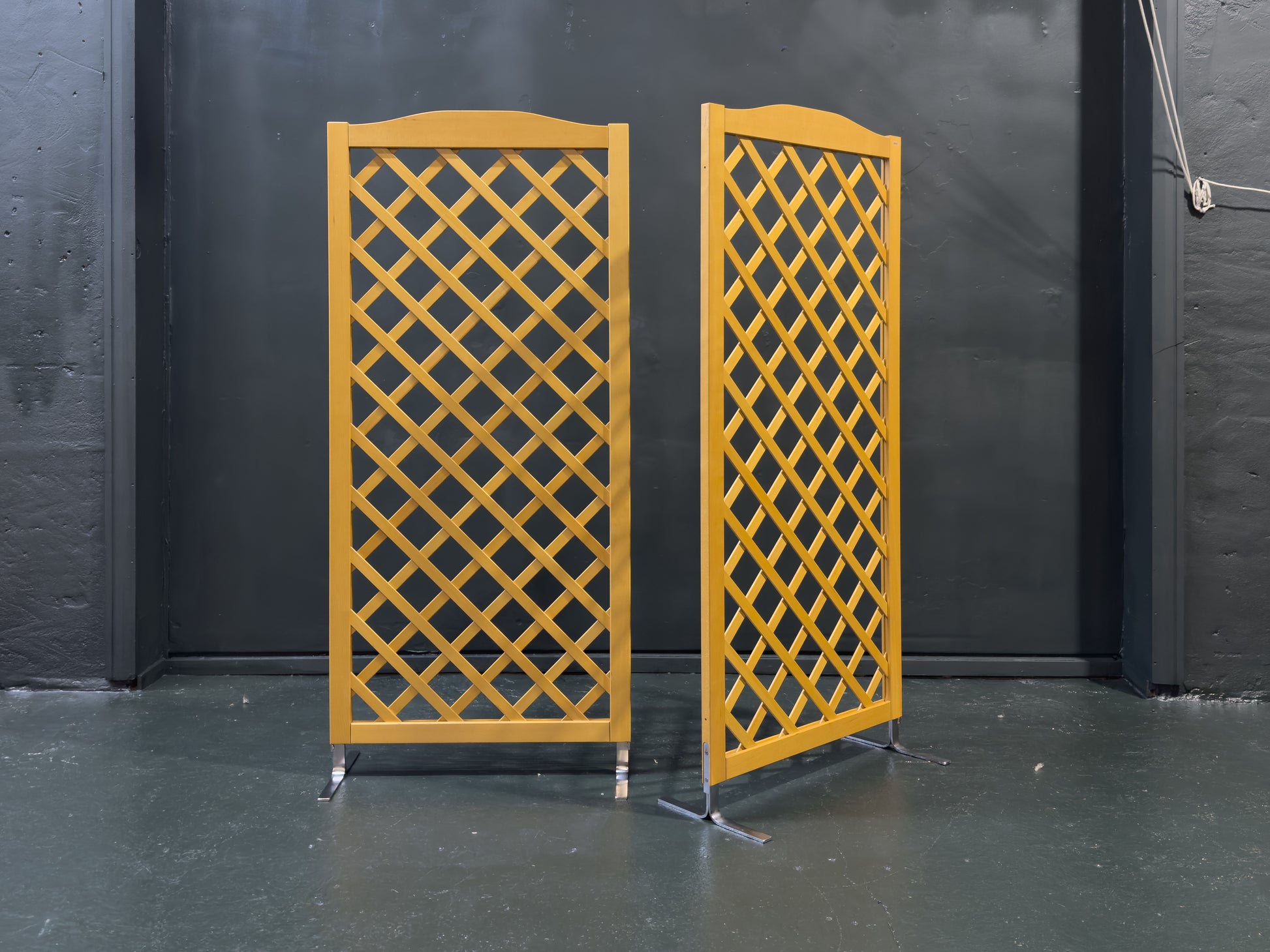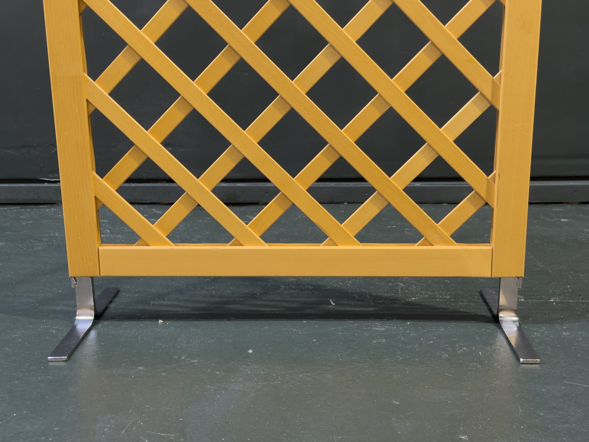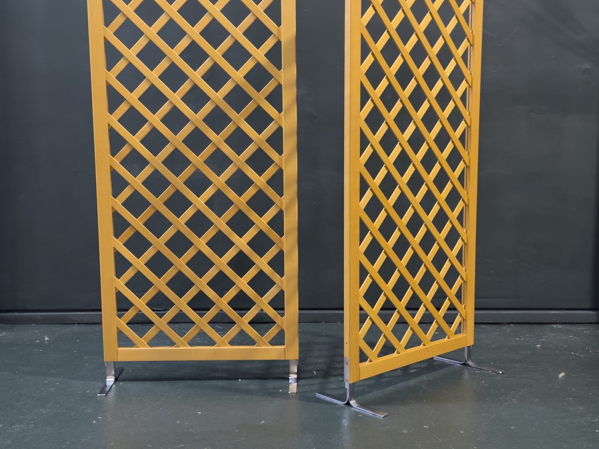 Each section is neatly framed and supported by polished chrome feet, which introduce a sleek industrial accent and give the screen a subtle floating effect Ideal as a room divider, backdrop, or decorative partition, this beech and chrome screen is both practical and sculptural — offering structure, transparency, and understated visual interest.