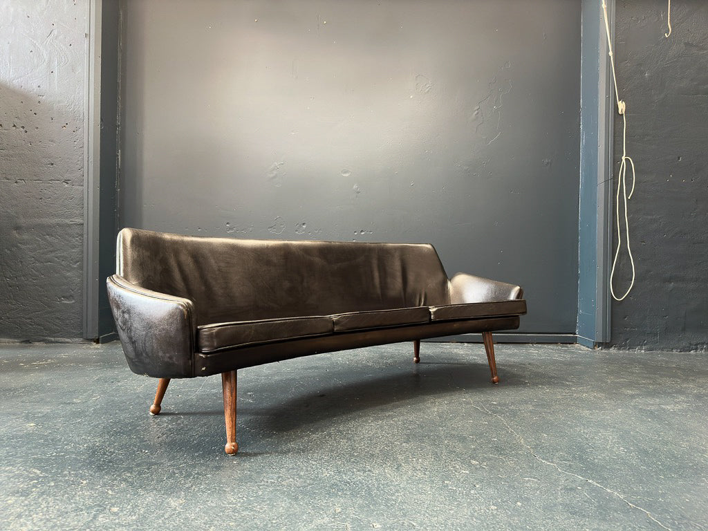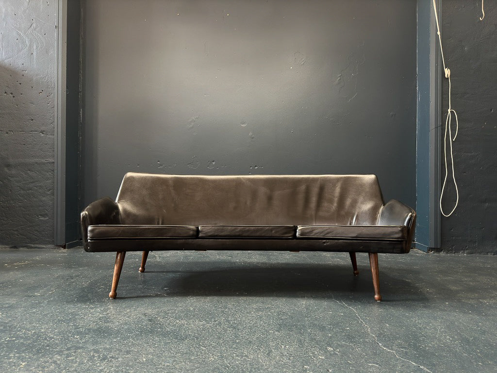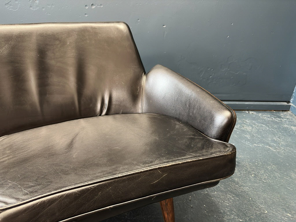 The sleek and minimalist sofa made in Denmark from the 1960's is a bold and chic statement piece for any room. Its slimline and compact shape elevates the piece's design creating a contemporary and luxurious feel. The classic black leather upholstery pairs perfectly with the beautifully crafted rosewood feet, the curvature of the frame is reminiscent of the unique tapered legs of this piece.
