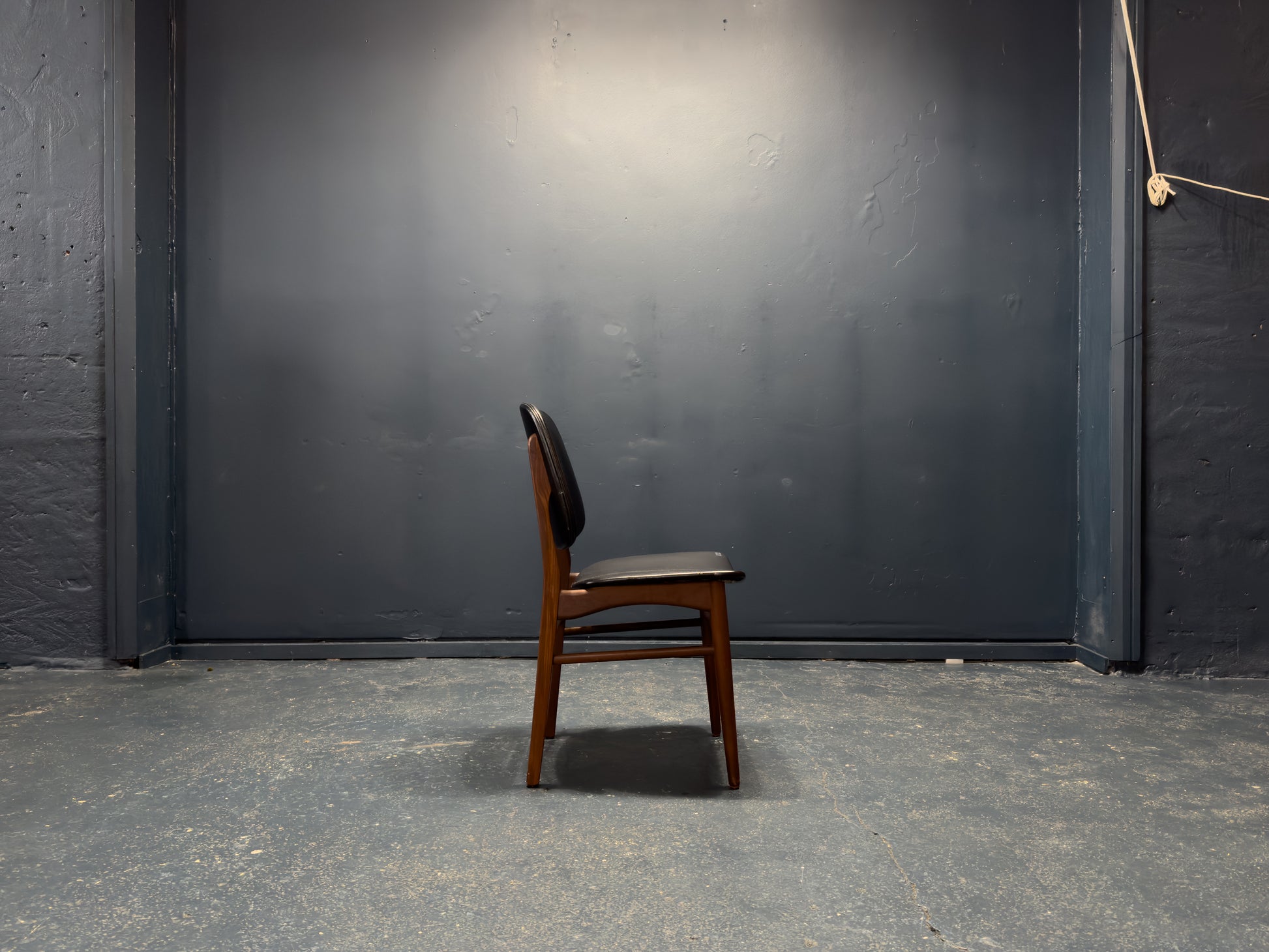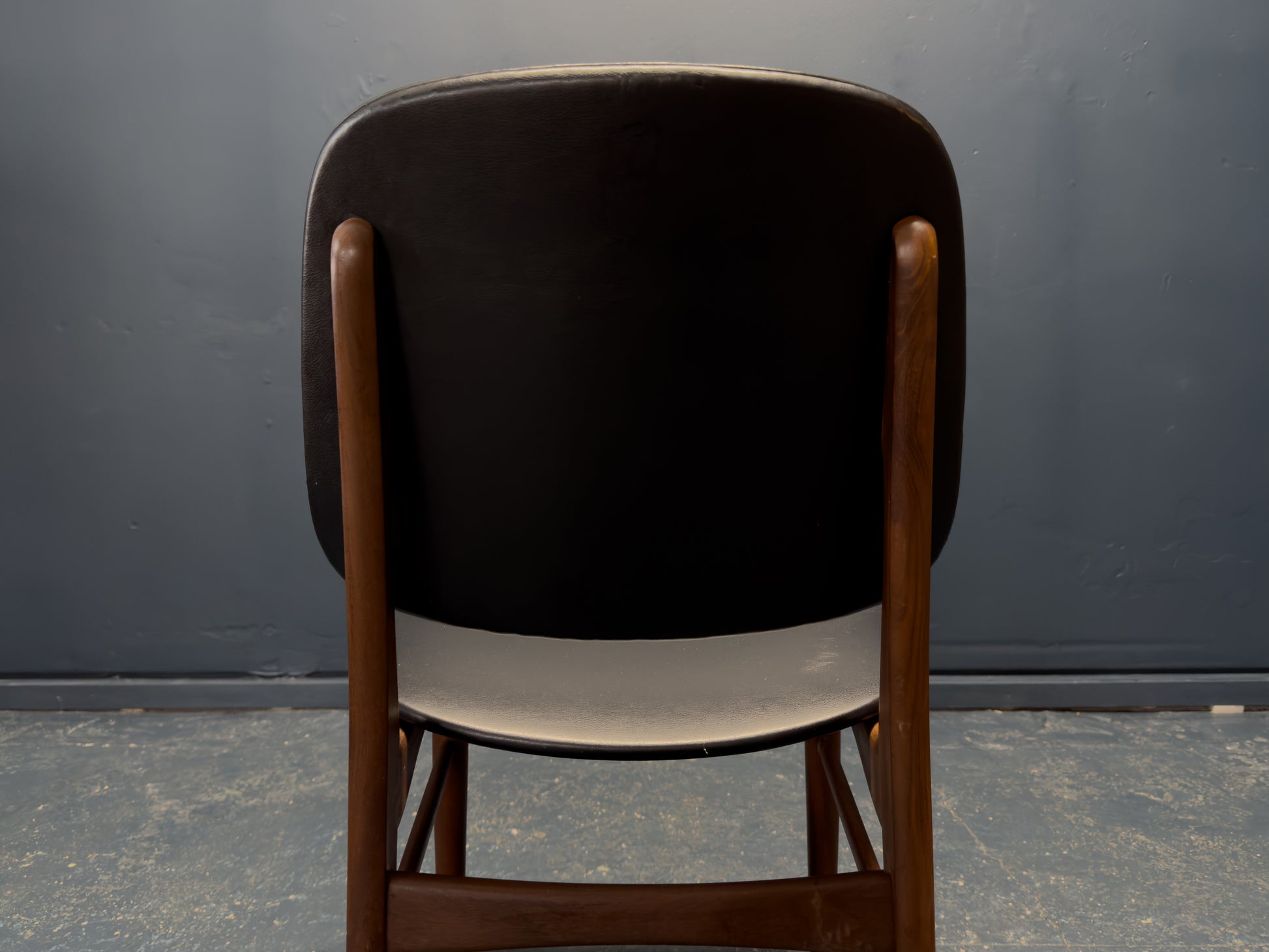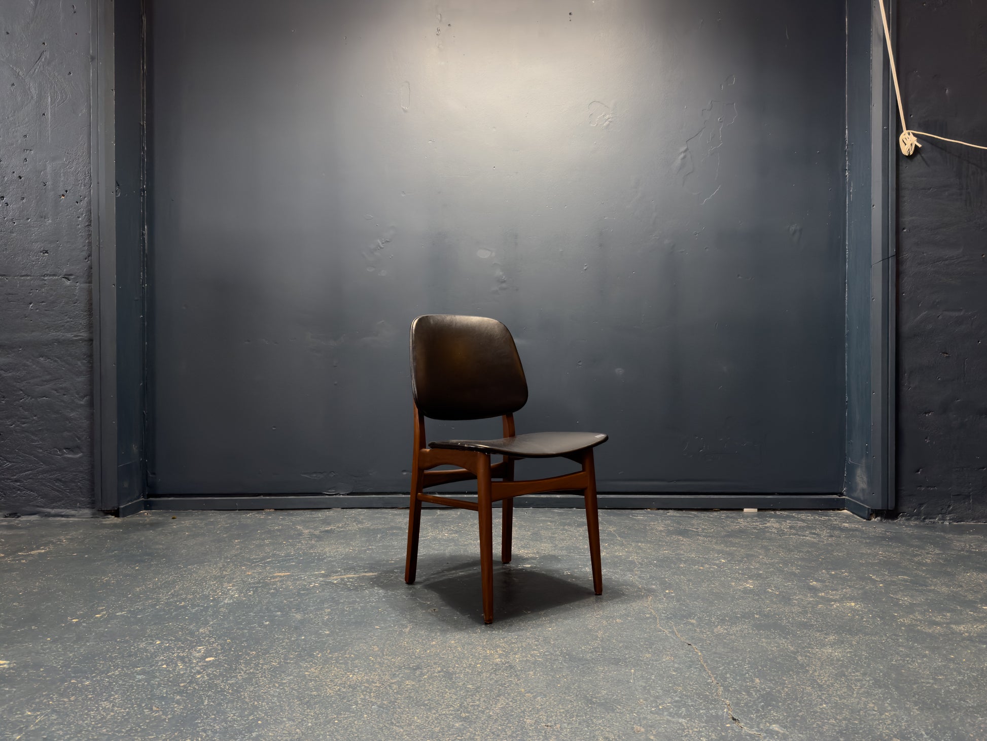 This mid-century modern leather and teak chair is a refined blend of sleek design and organic warmth. Featuring a smooth, black leather seat and curved backrest, the upholstery exudes a sophisticated elegance. The gently contoured shape follows the natural lines of the body, making it as ergonomic as it is stylish.