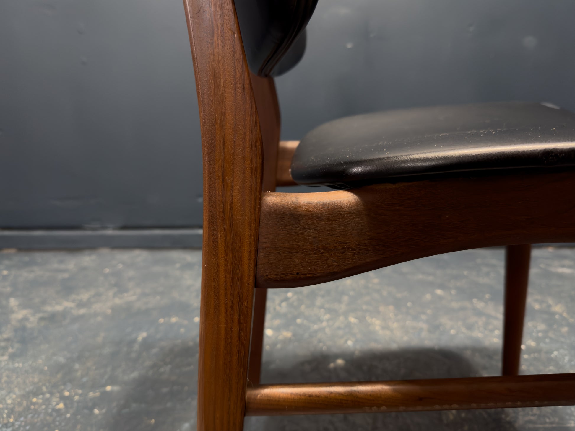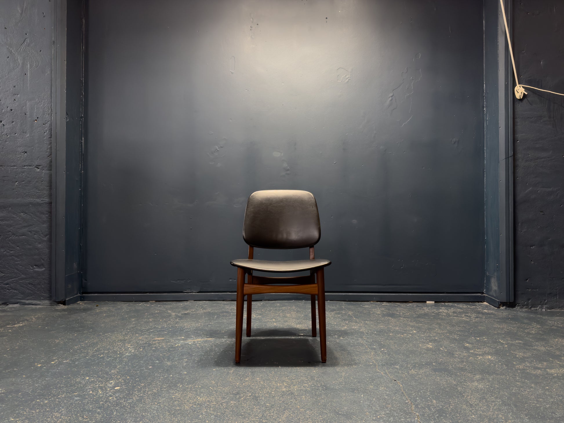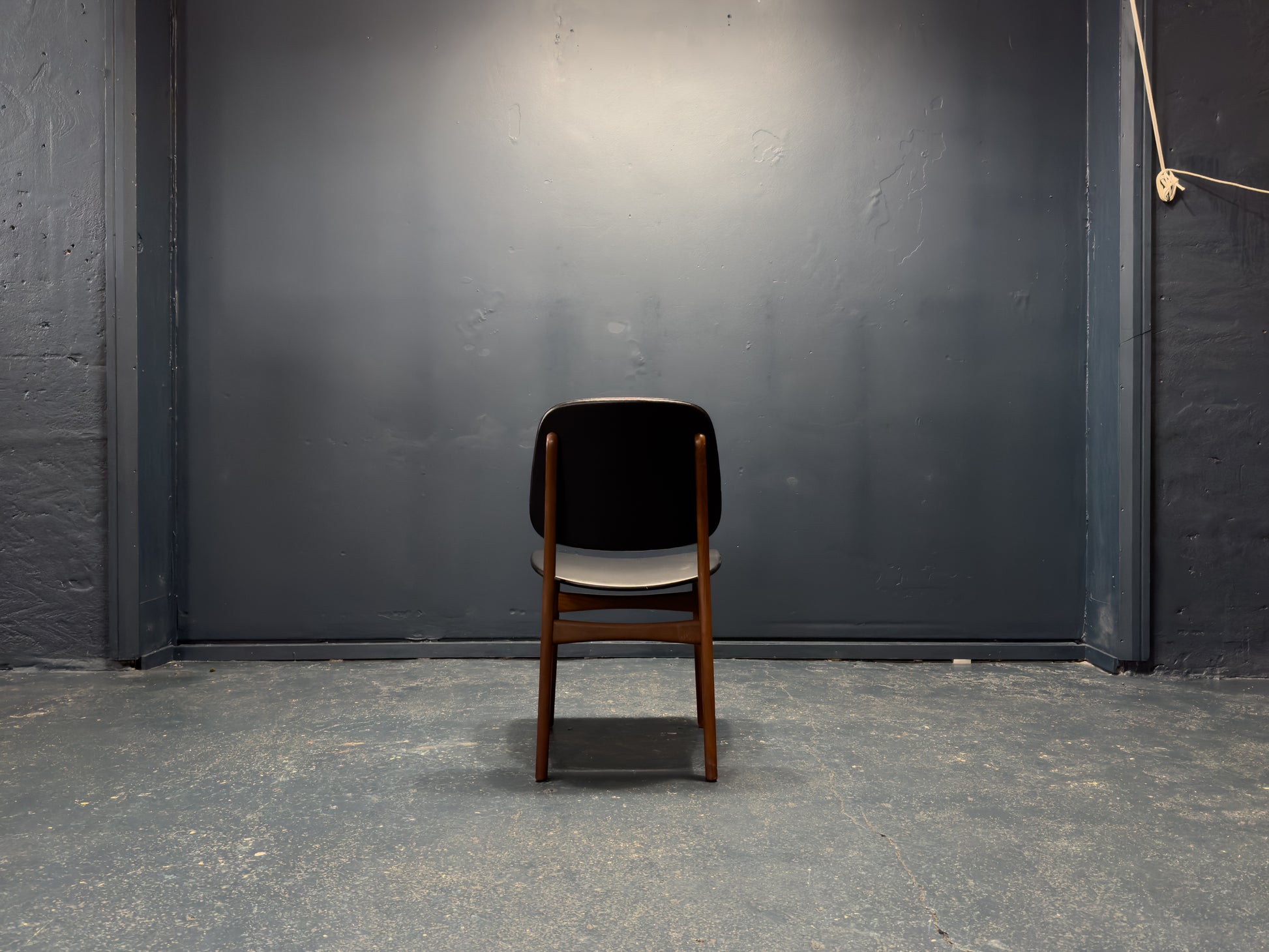 This mid-century modern leather and teak chair is a refined blend of sleek design and organic warmth. Featuring a smooth, black leather seat and curved backrest, the upholstery exudes a sophisticated elegance. The gently contoured shape follows the natural lines of the body, making it as ergonomic as it is stylish.