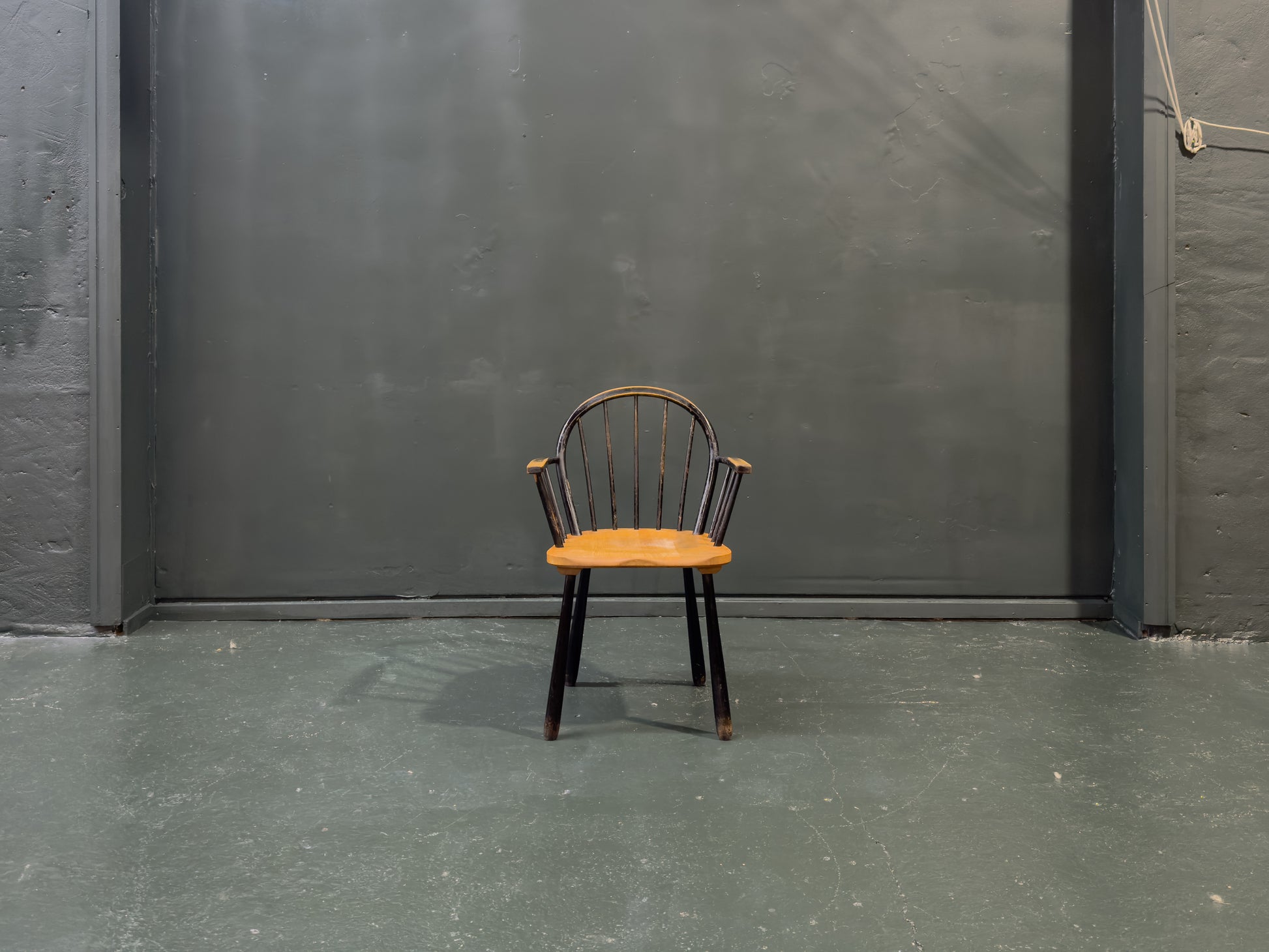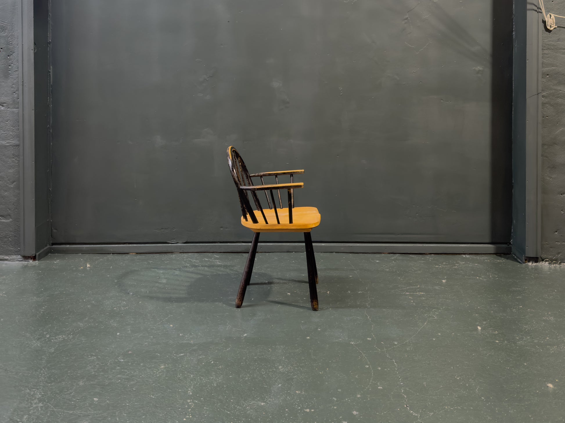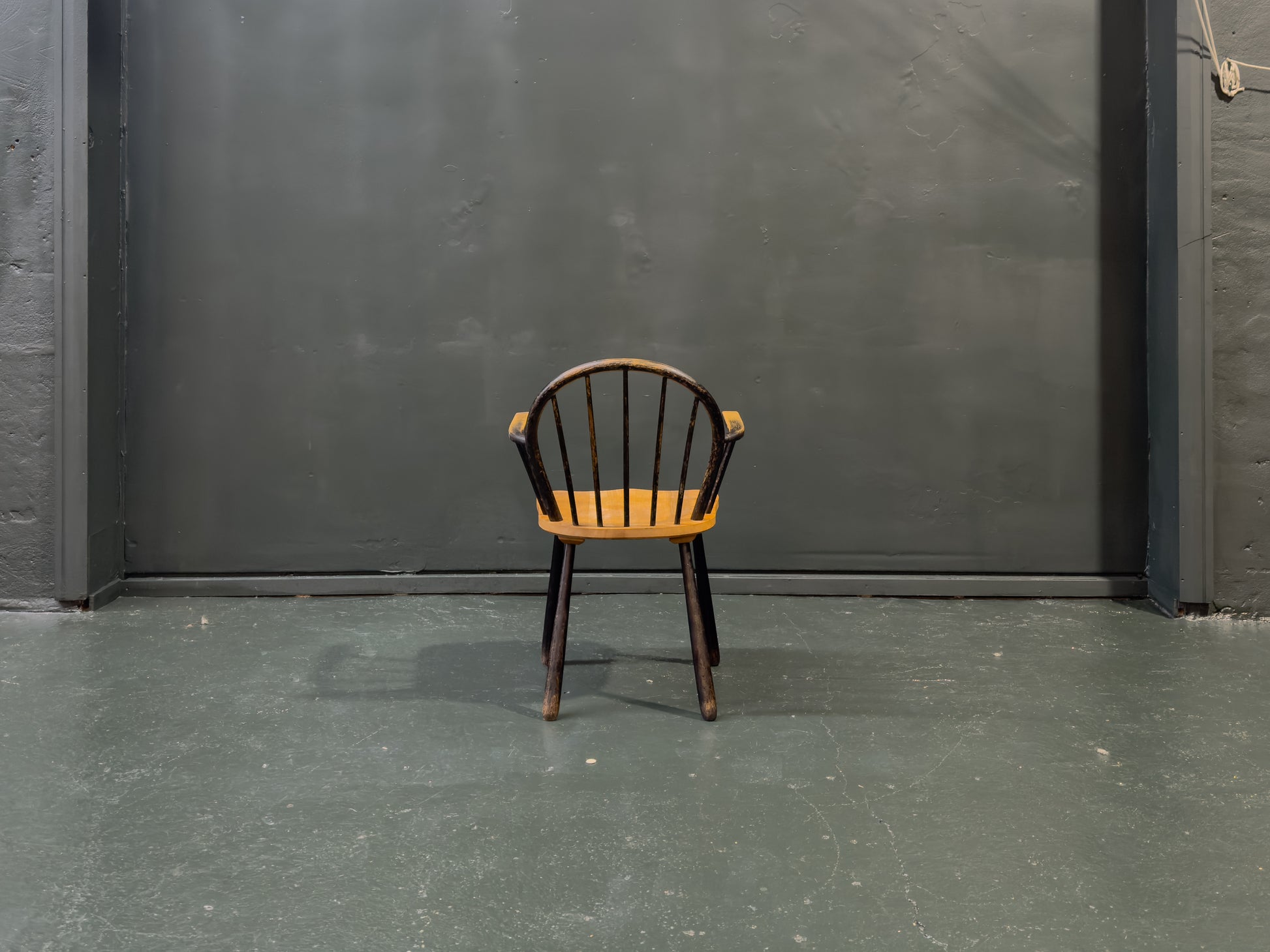 Short, straight arm supports extend forward from the back structure, adding a geometric counterpoint to the arc. The seat is shaped with softened edges and a gentle taper toward the rear, visually anchoring the composition. Splayed legs set at outward angles create a stable base and reinforce the chair’s dynamic stance. The contrast between the dark-stained frame and lighter wooden seat highlights the chair’s construction lines and emphasises its handcrafted character.