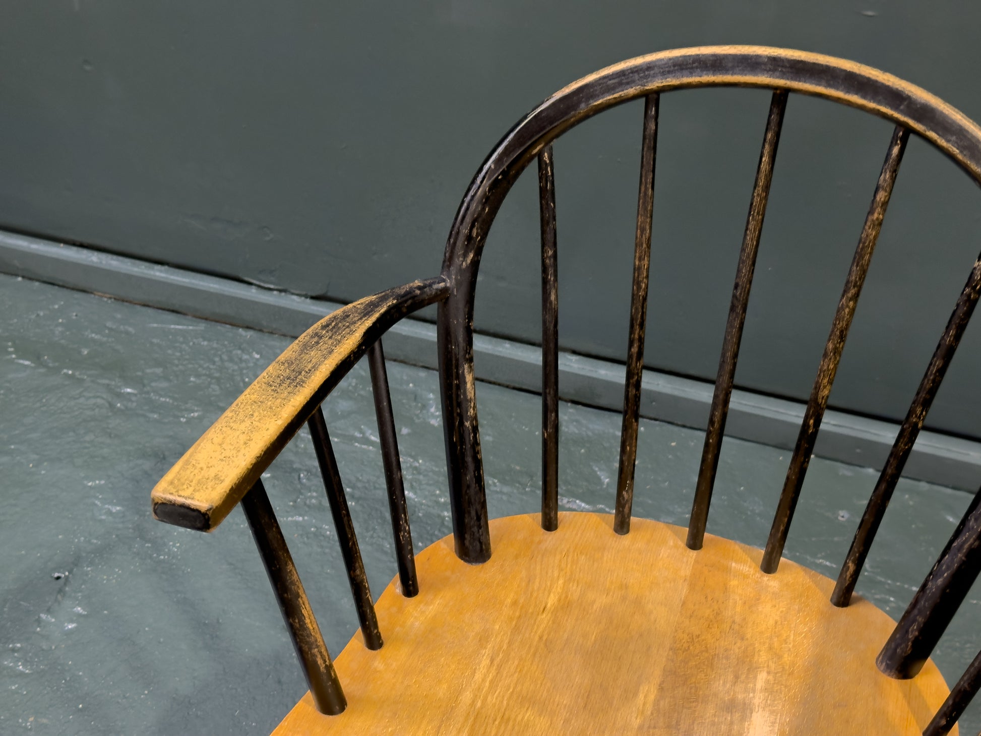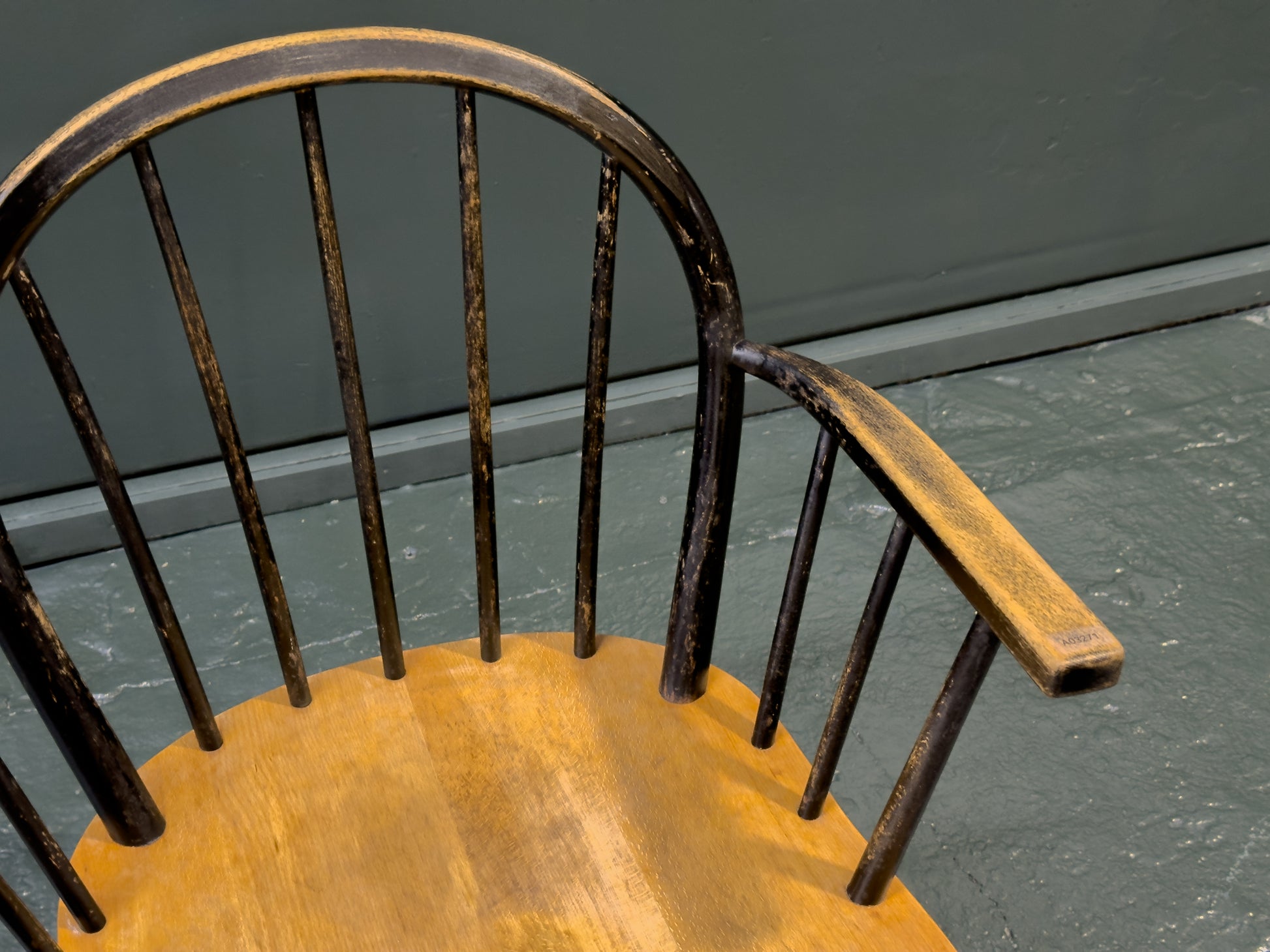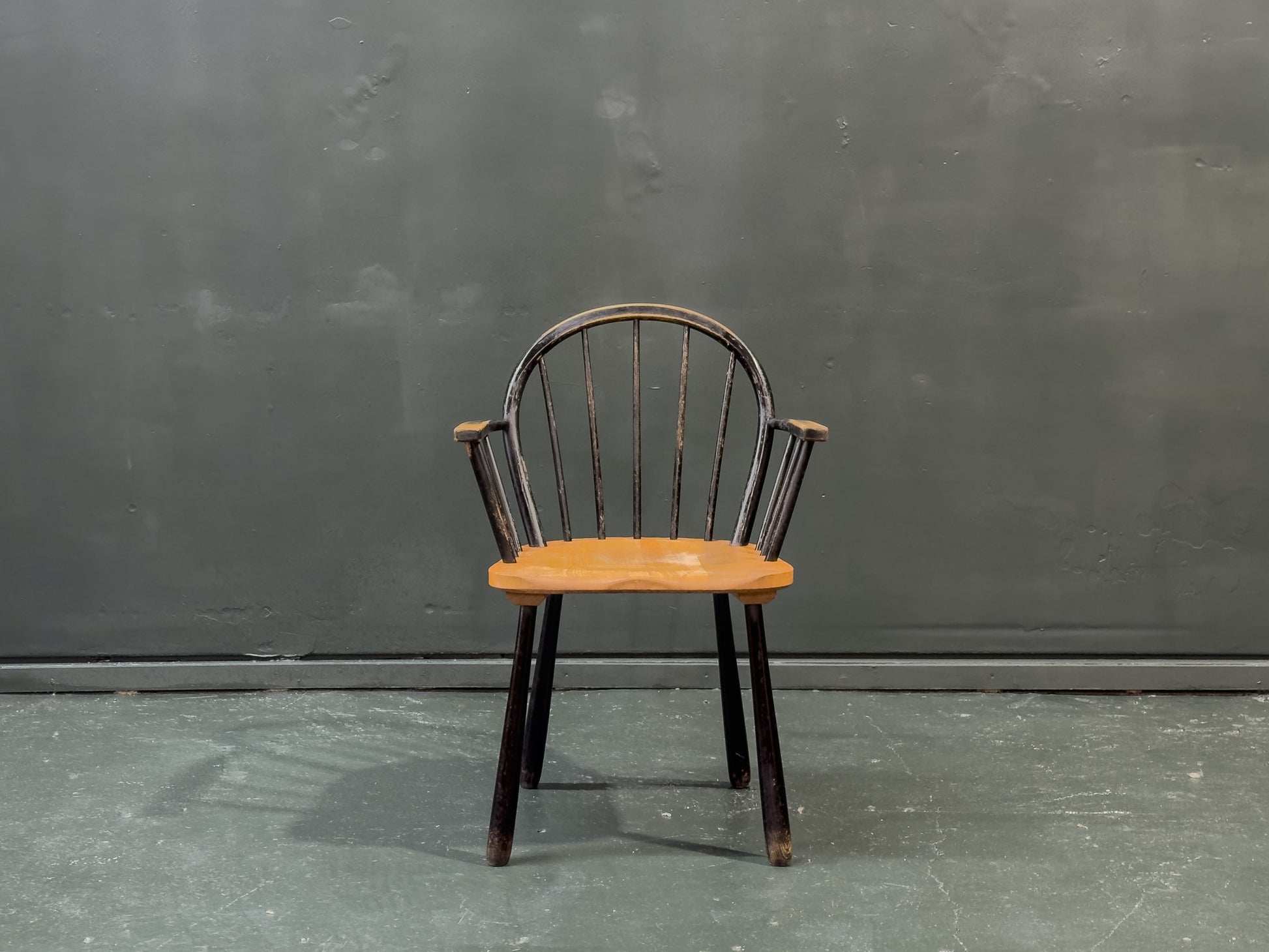 Short, straight arm supports extend forward from the back structure, adding a geometric counterpoint to the arc. The seat is shaped with softened edges and a gentle taper toward the rear, visually anchoring the composition. Splayed legs set at outward angles create a stable base and reinforce the chair’s dynamic stance. The contrast between the dark-stained frame and lighter wooden seat highlights the chair’s construction lines and emphasises its handcrafted character.