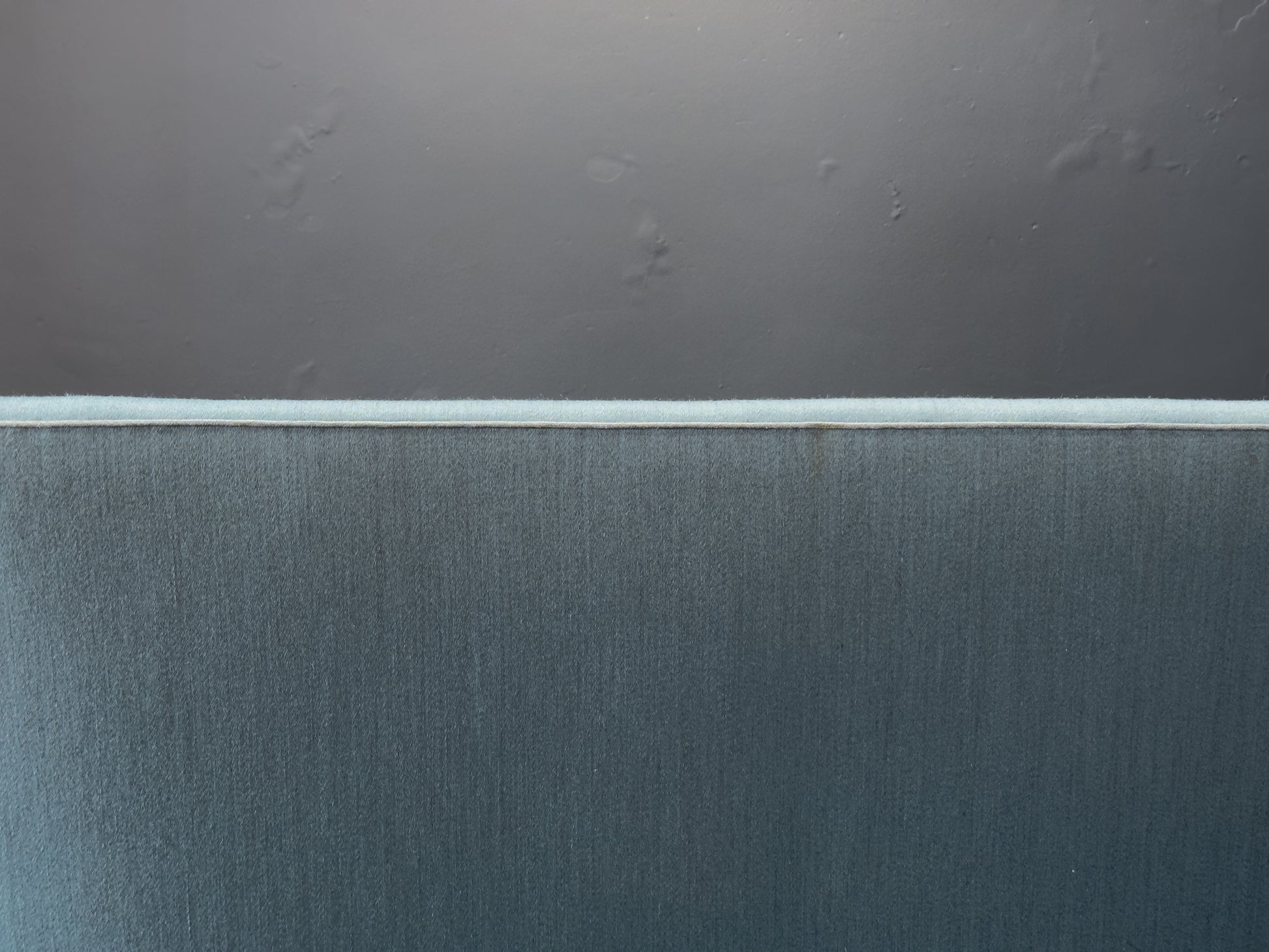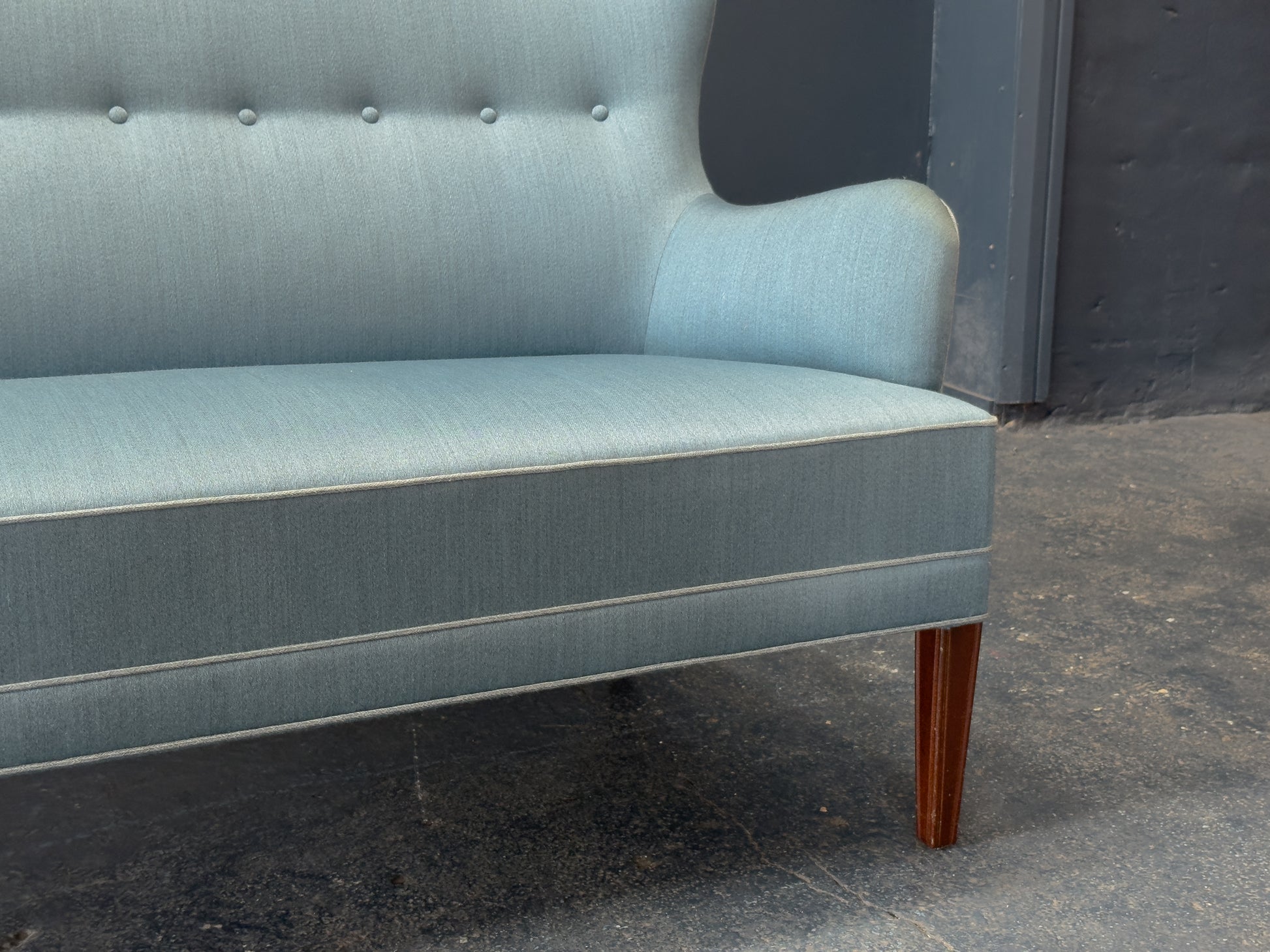 The upholstery is executed to a superb standard, with crisp edges, precise piping, and a smooth, structured finish that enhances the sofa's clean lines. The slightly tapered legs in stained wood provide a subtle contrast to the muted blue fabric, lending warmth and balance to the overall design.