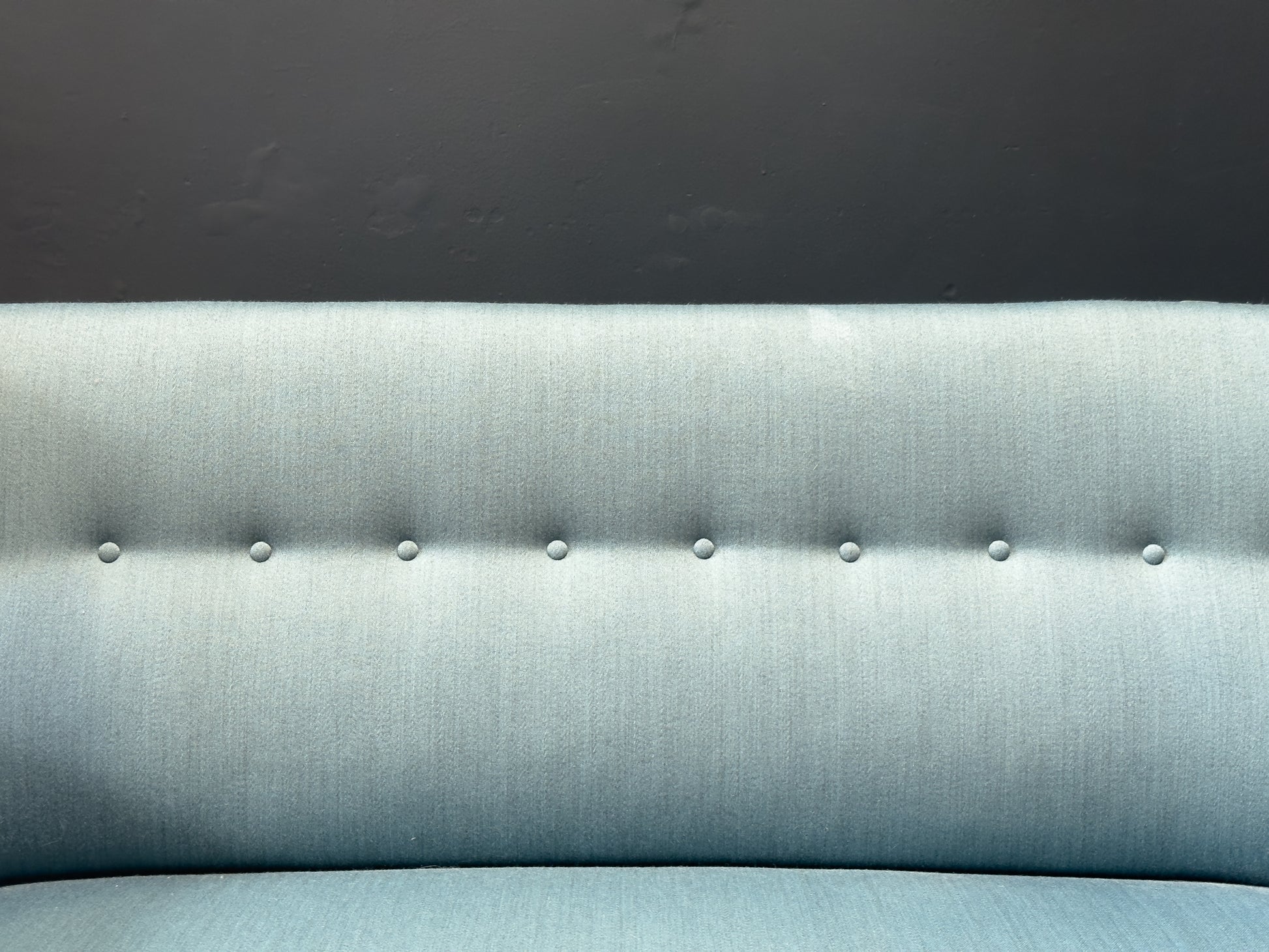 This refined blue upholstered sofa by Frits Henningsen is a beautiful example of understated mid-century elegance. The sofa features a gently curved high backrest with subtle button tufting that adds a tailored, sculptural quality to the silhouette. The gracefully sloped armrests flow seamlessly into the back, creating a soft and enveloping form.