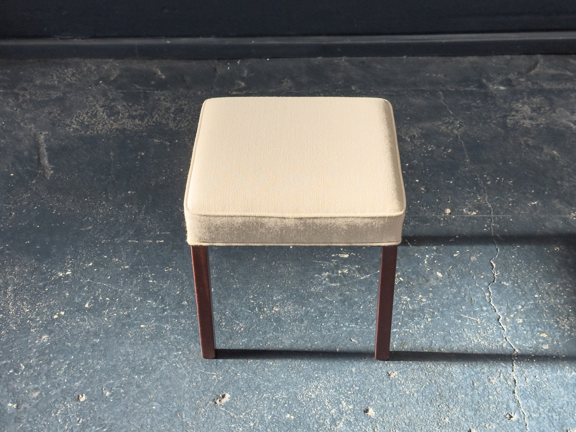 This elegant upholstered stool is a fine example of simplicity elevated through craftsmanship. The square seat is generously cushioned and finished in a soft, neutral-toned fabric that lends both comfort and versatility, making it easy to pair with a wide range of interiors. The clean-lined base, crafted from solid wood, provides a warm contrast to the upholstery, with straight legs that emphasise balance and restraint.
