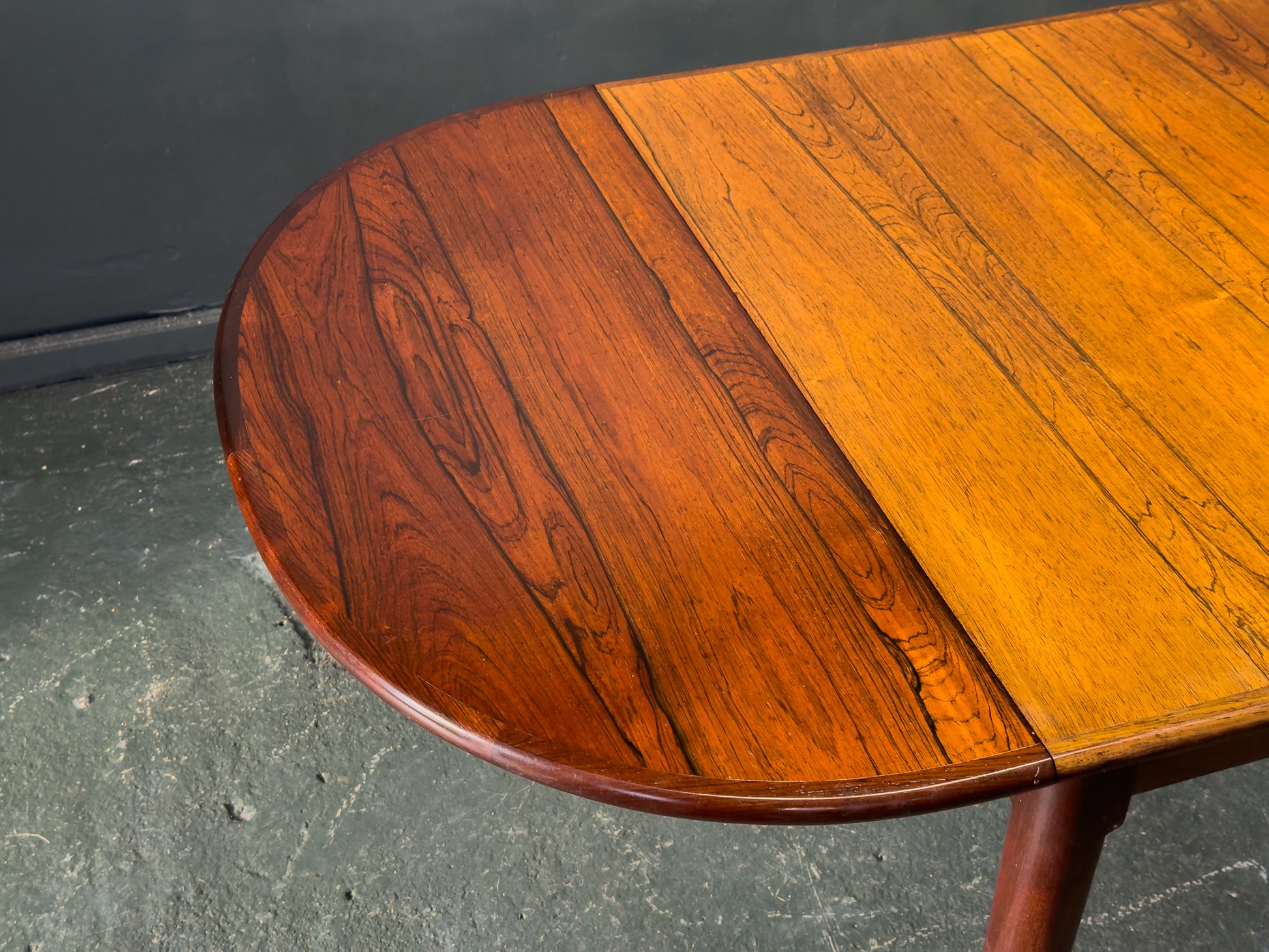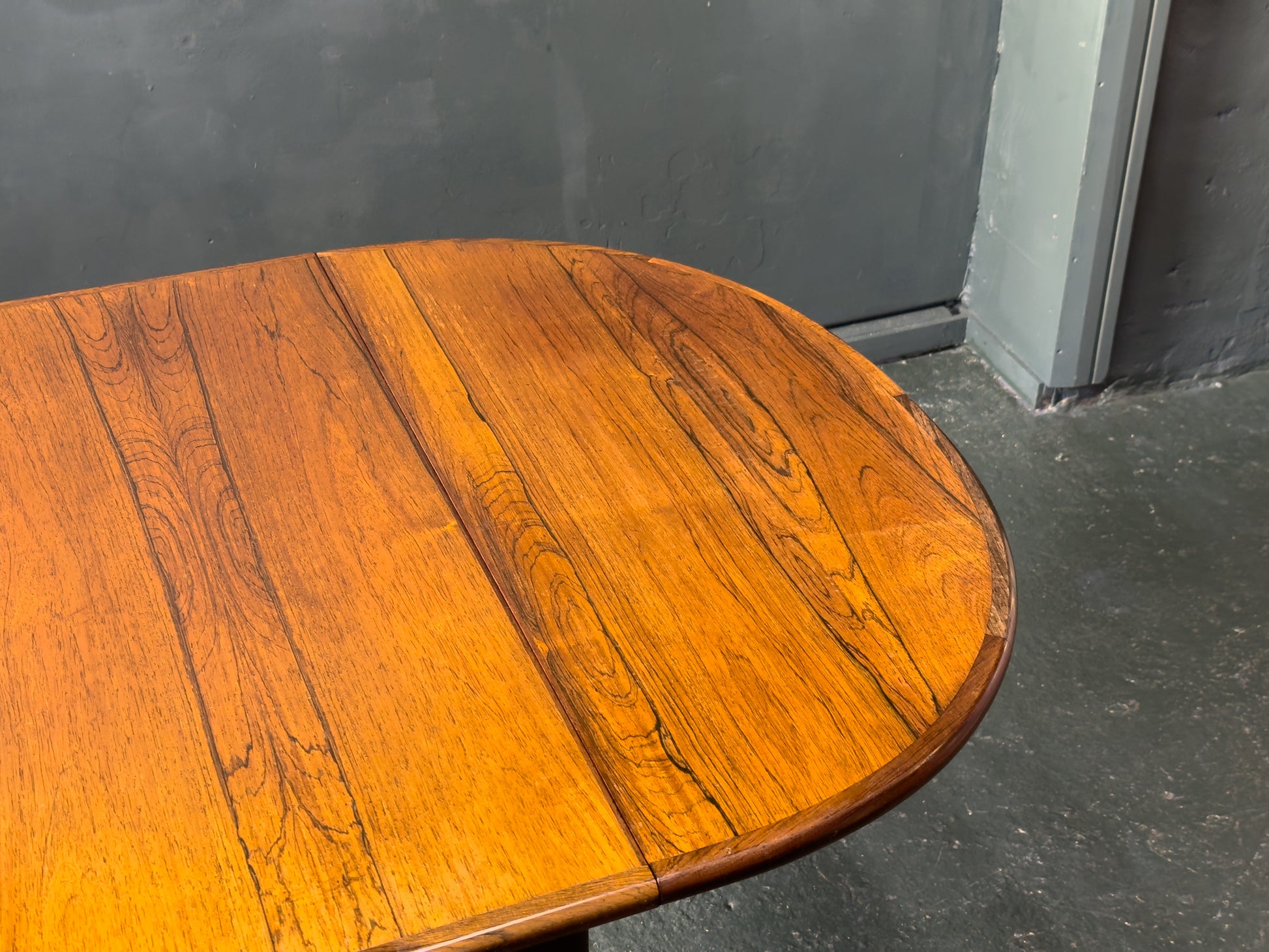 This exquisite Arne Vodder dropleaf table, produced by the renowned Sibast Furniture, represents the pinnacle of Danish Modern cabinetry. A masterclass in organic form and versatile engineering, this piece is defined by the vibrant Rosewood, which showcases a dramatic, swirling grain that flows with unbroken continuity across the top and leaves.