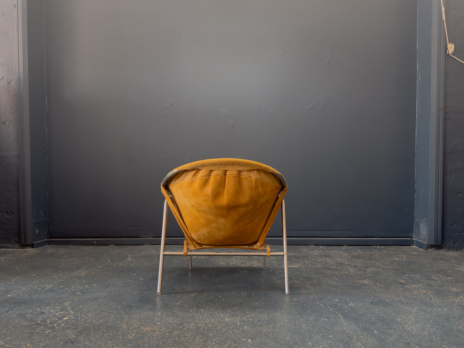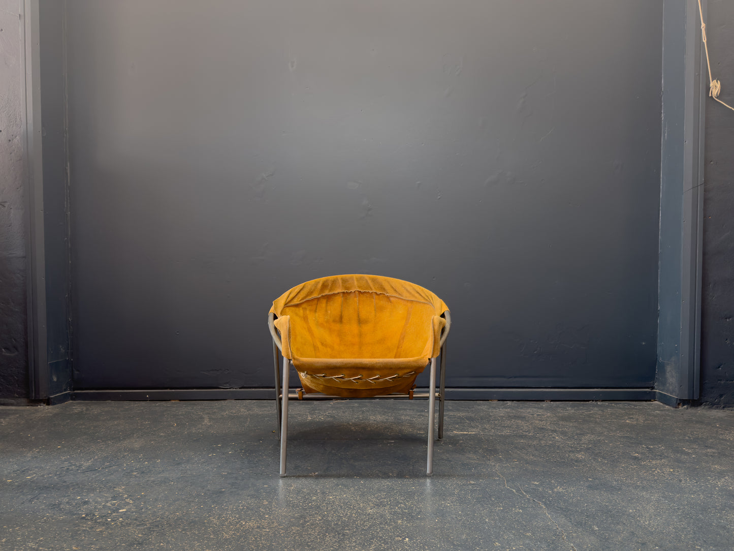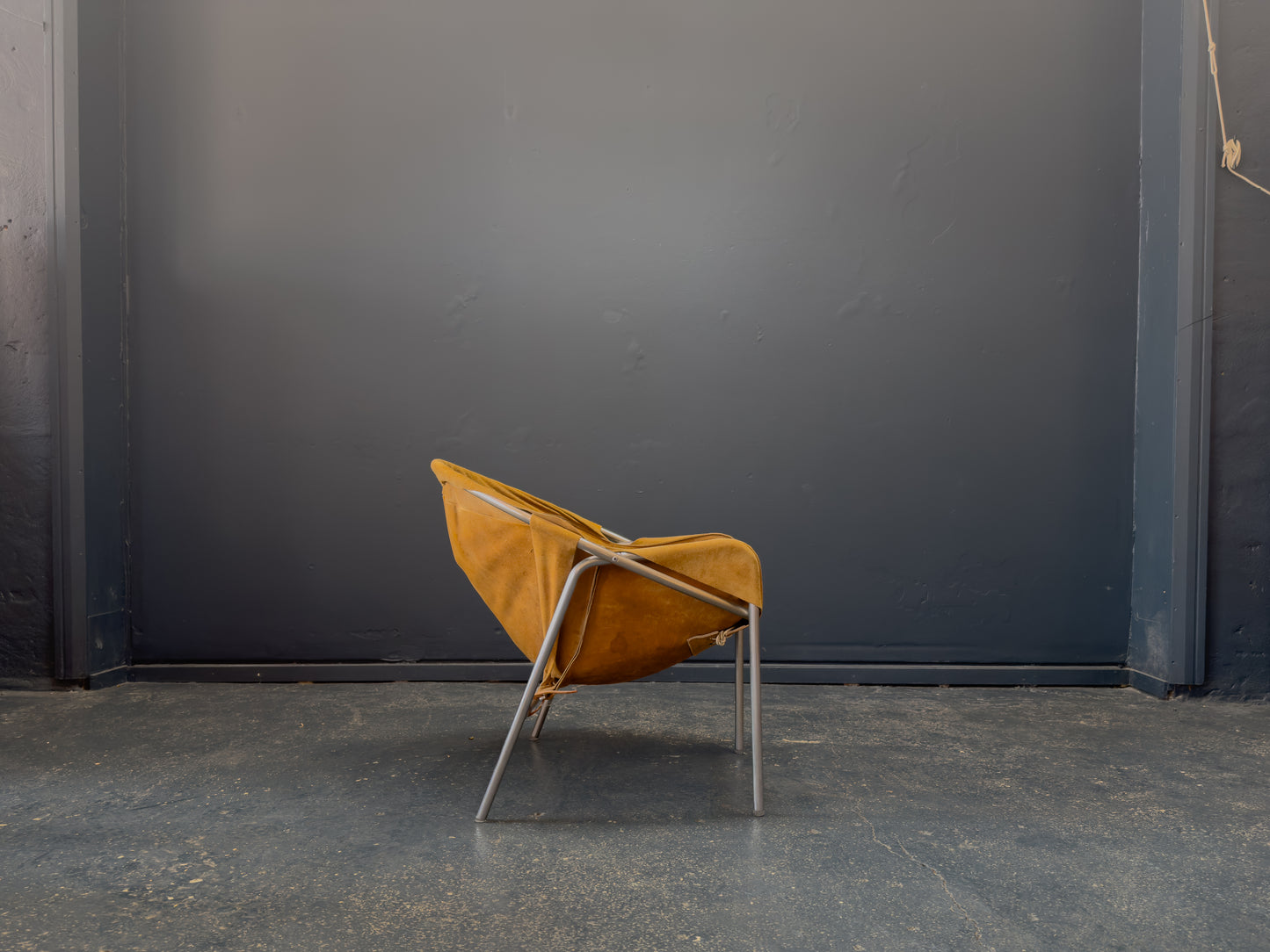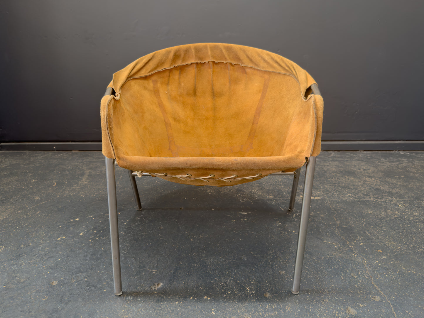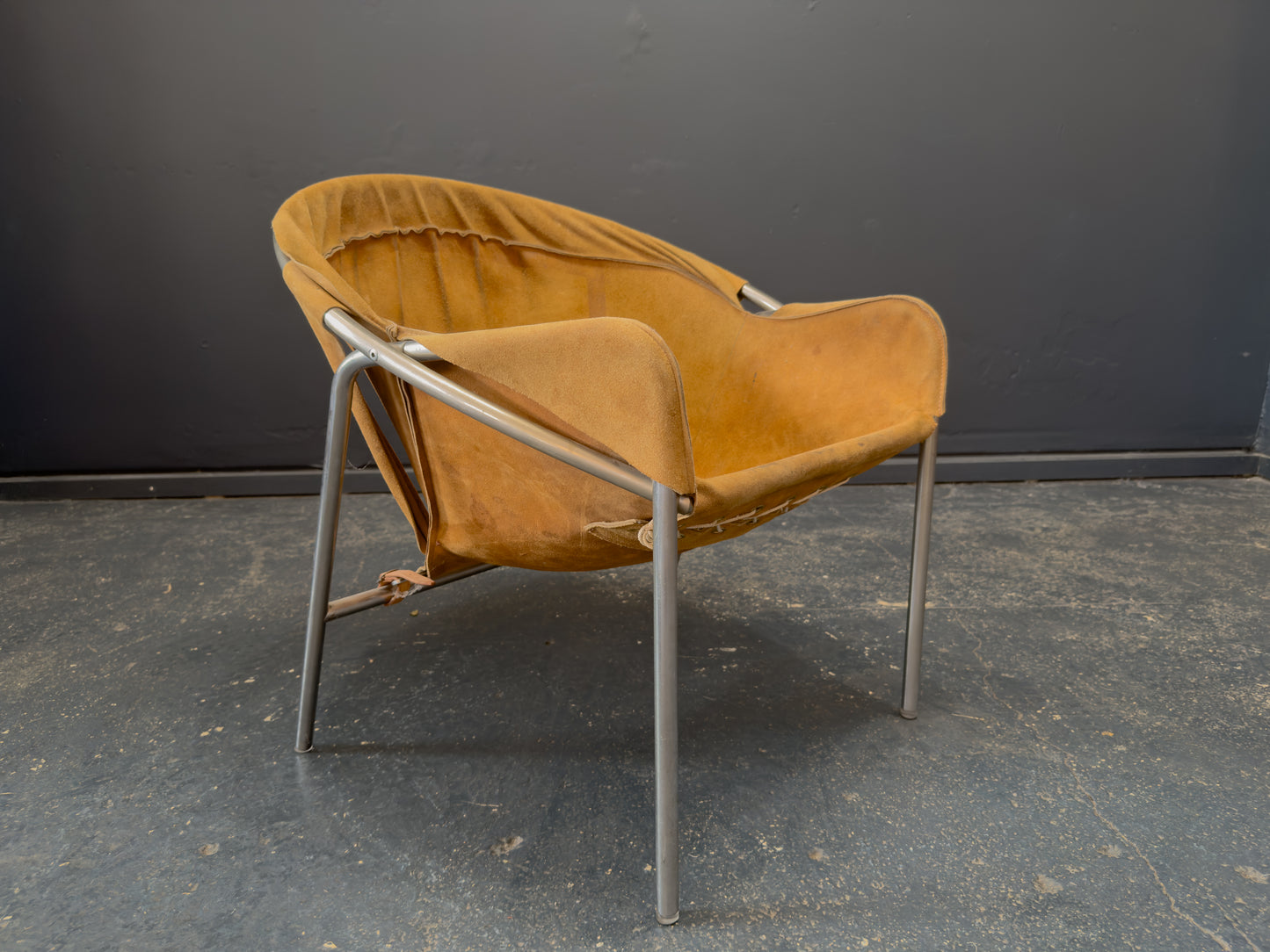 The chair’s seat is formed from a single, sweeping piece of suede leather, suspended within a tubular steel frame in a sling-like configuration. Visible leather lacing along the sides provides both structural integrity and a tactile, handcrafted detail that elevates the design.