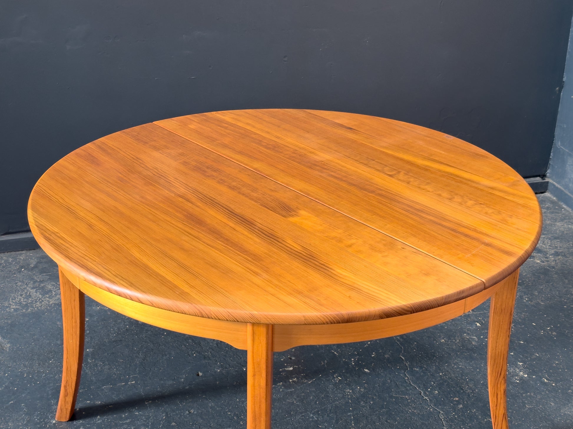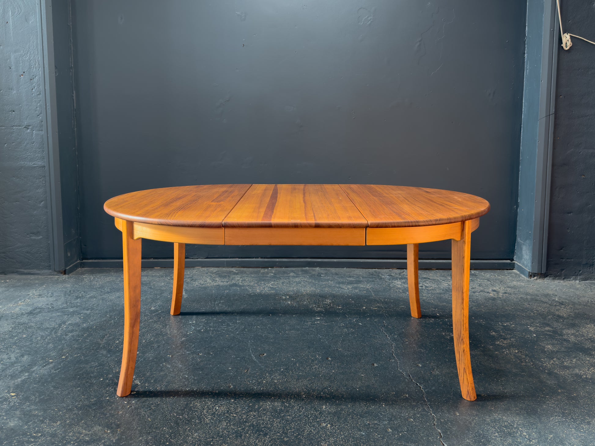 Set on gracefully curved legs, which taper delicately and flare outward with a classic silhouette. The legs evoke a quiet sense of movement and balance, adding a refined, almost sculptural quality to the overall design. This wonderful table seats four, with external leaves that enable it to extend to seat six and eight.