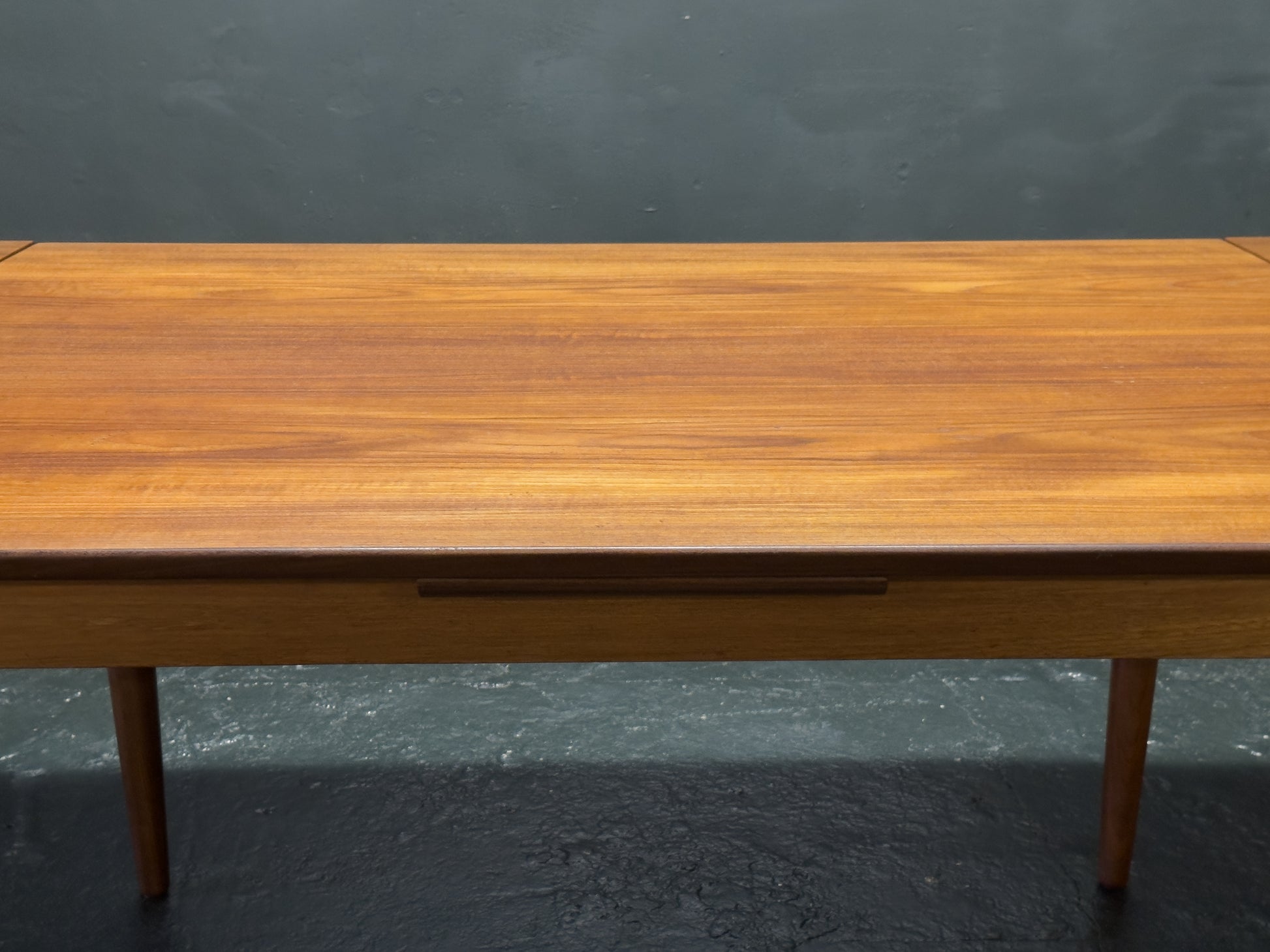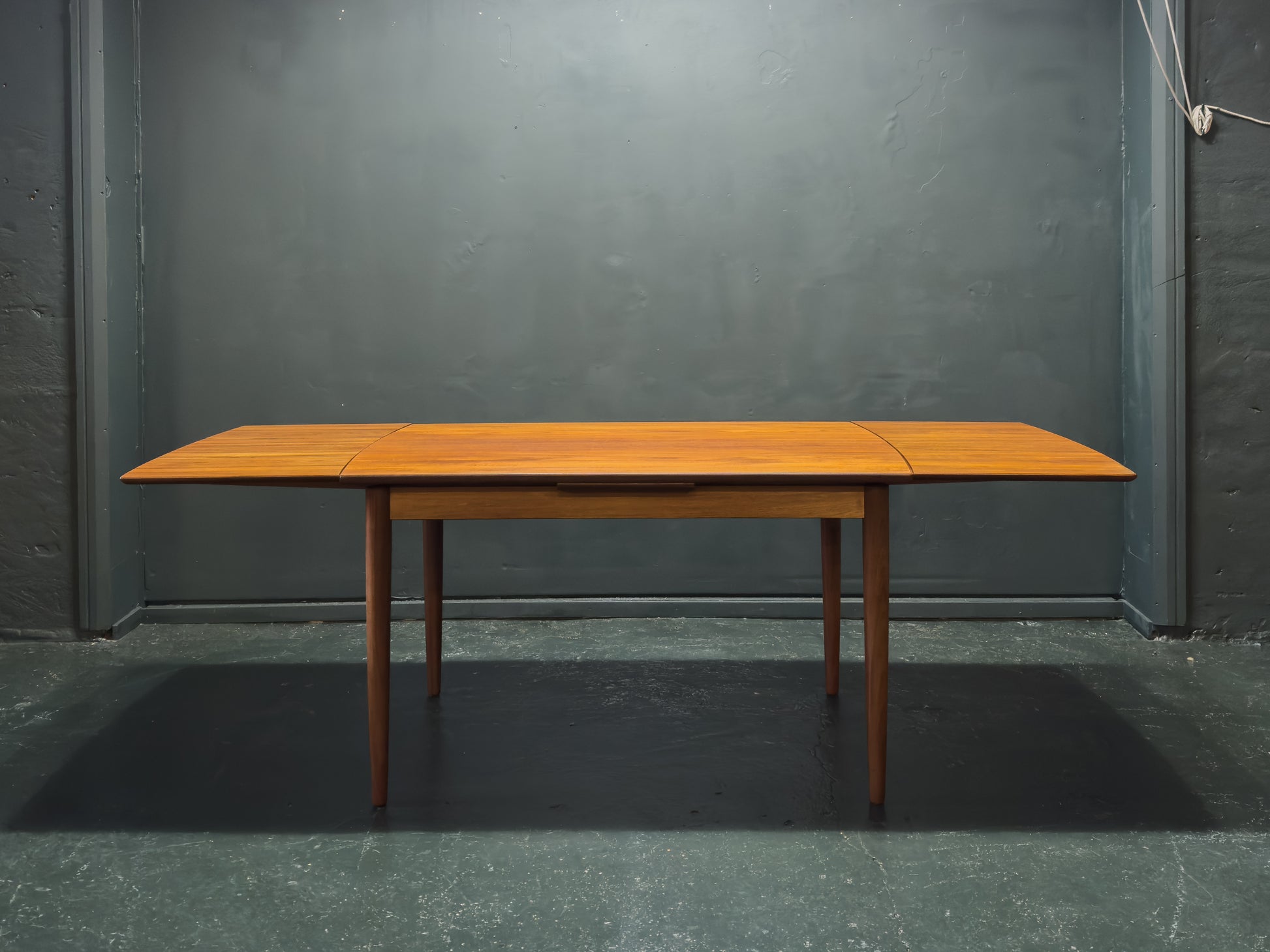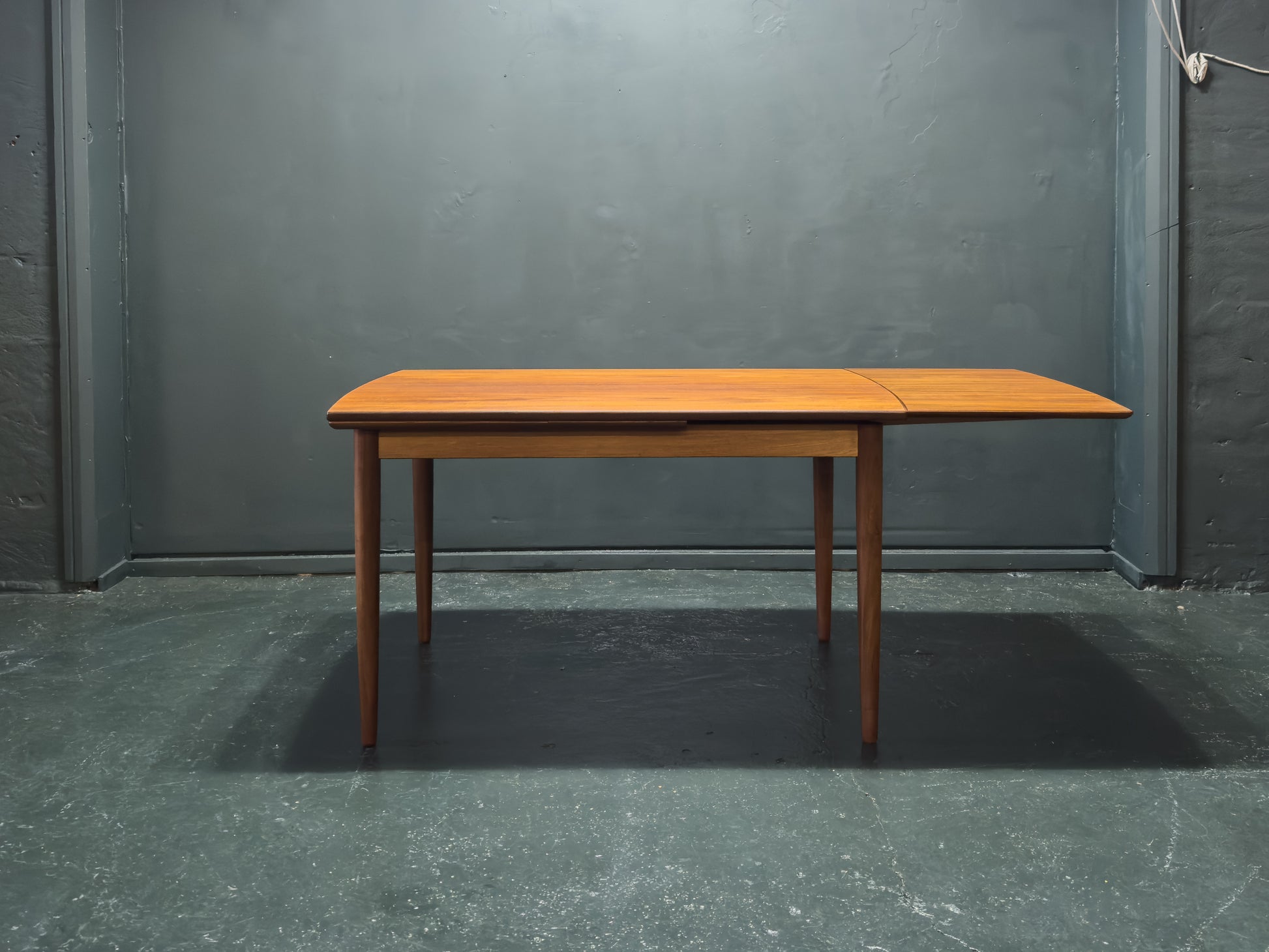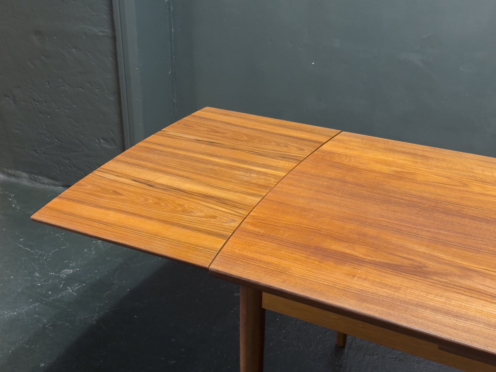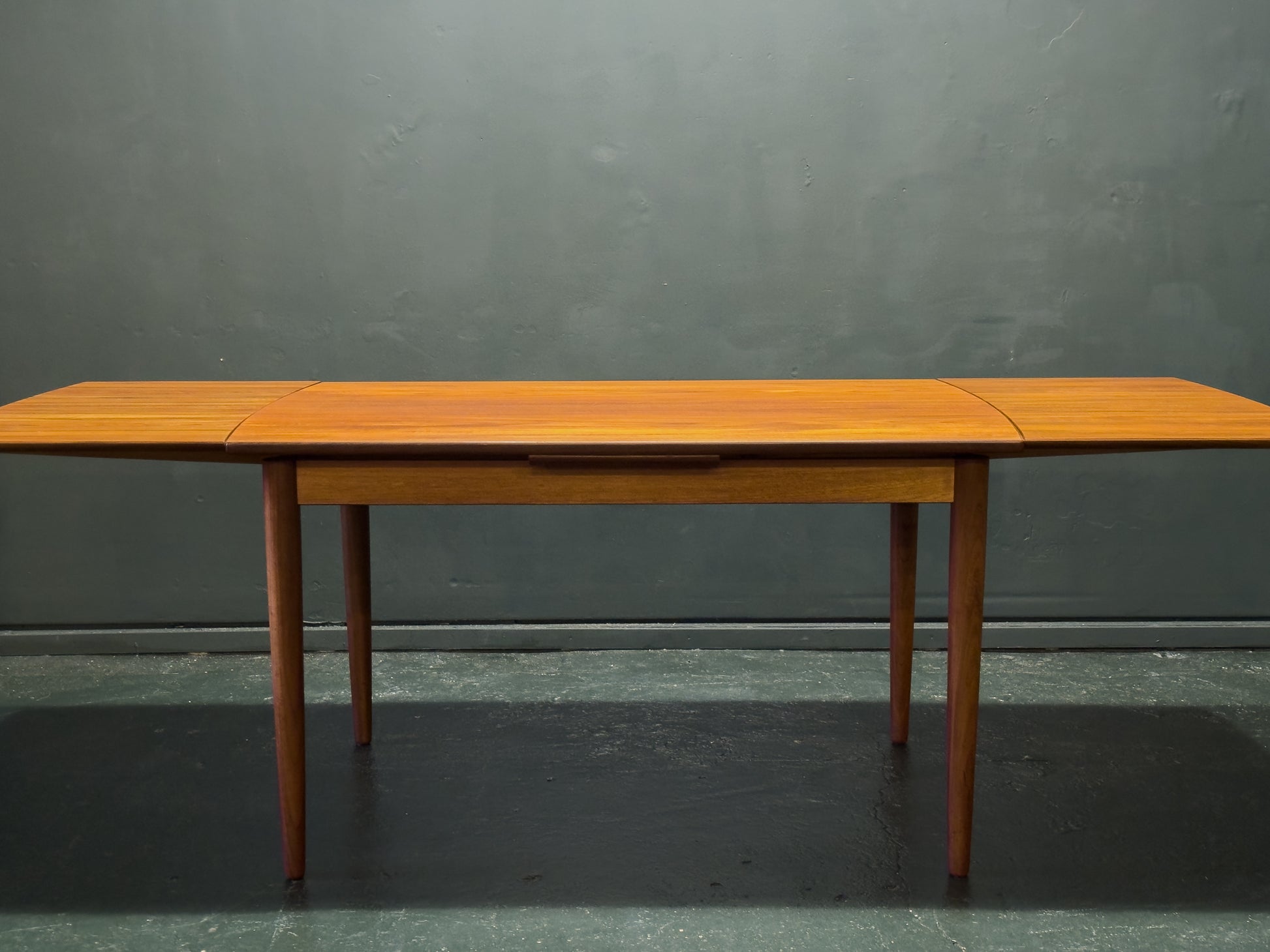 Perfect for both everyday use and entertaining, this versatile extending teak dining table is a finely crafted piece that combines understated elegance with functional innovation. Constructed from richly toned teak, the table features a refined rectangular top with softly rounded edges and a subtle lip, supported by gently tapering legs that add a graceful, mid-century modern character.