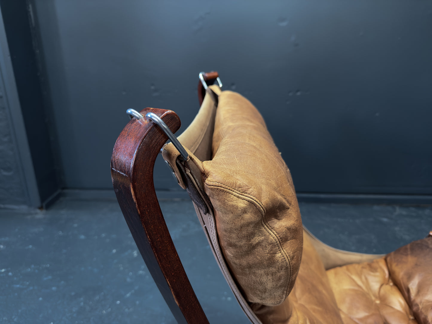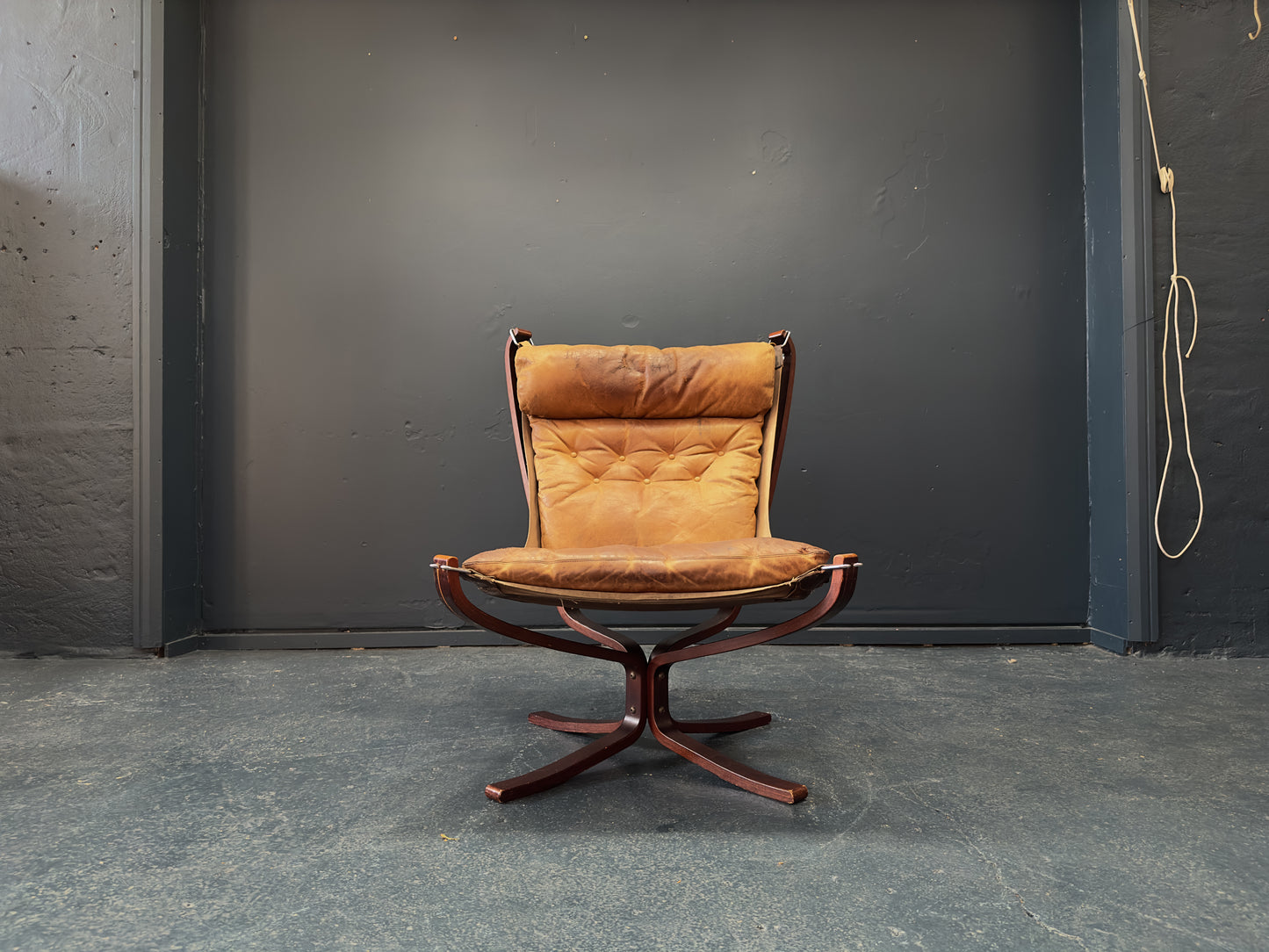 A later version of the original 1970s Falcon Chair designed by Norwegian interior architect Sigurd Ressell. Upholstered in light brown patinated leather and maintaining the original armless shape, the sturdy beech base is stained to emulate rosewood.