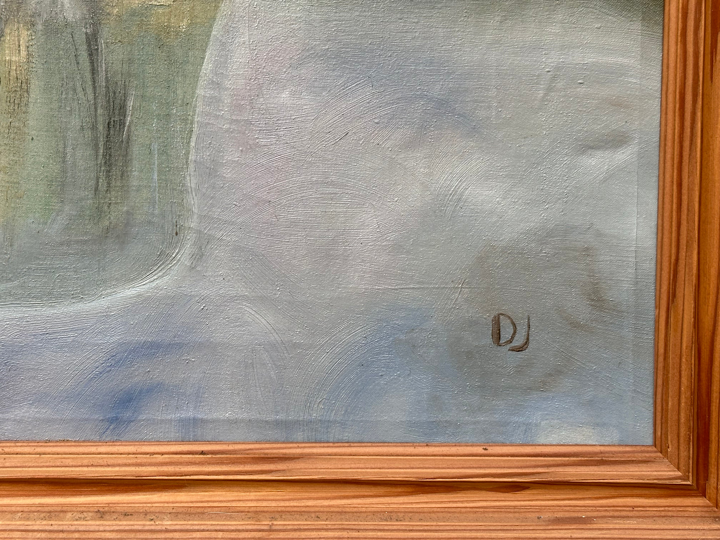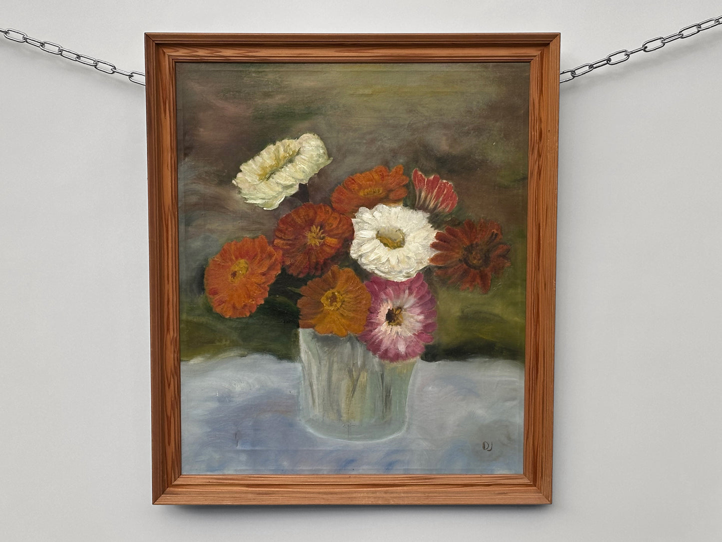 This sweet still-life oil painting depicts a bunch of gerberas in a glass vase, the warm tones of the red and orange petals compliment the earthy green background. The use of white and a brighter pink toned colour add depth to the floral arrangement and brighten the deeper earth tones of the piece. This painting is set in a simplistic and honest slim pine frame