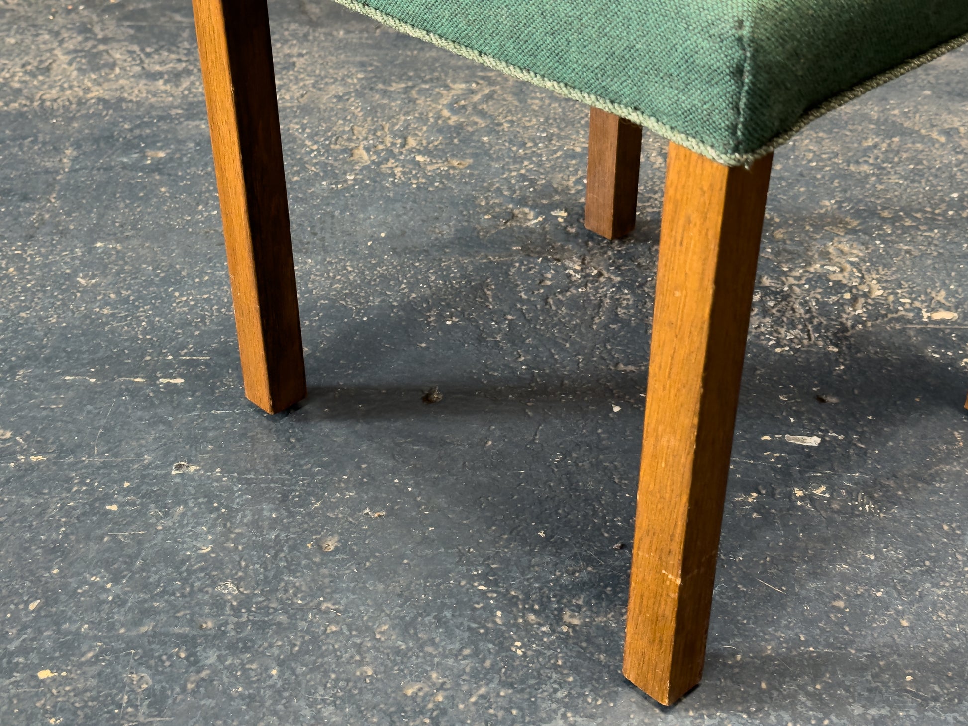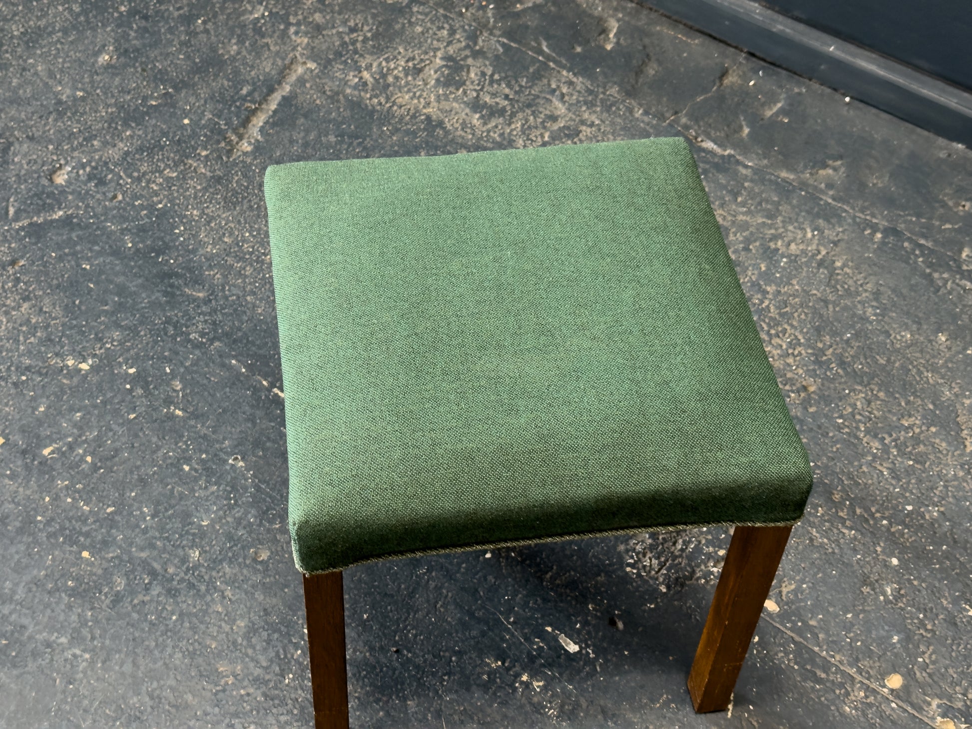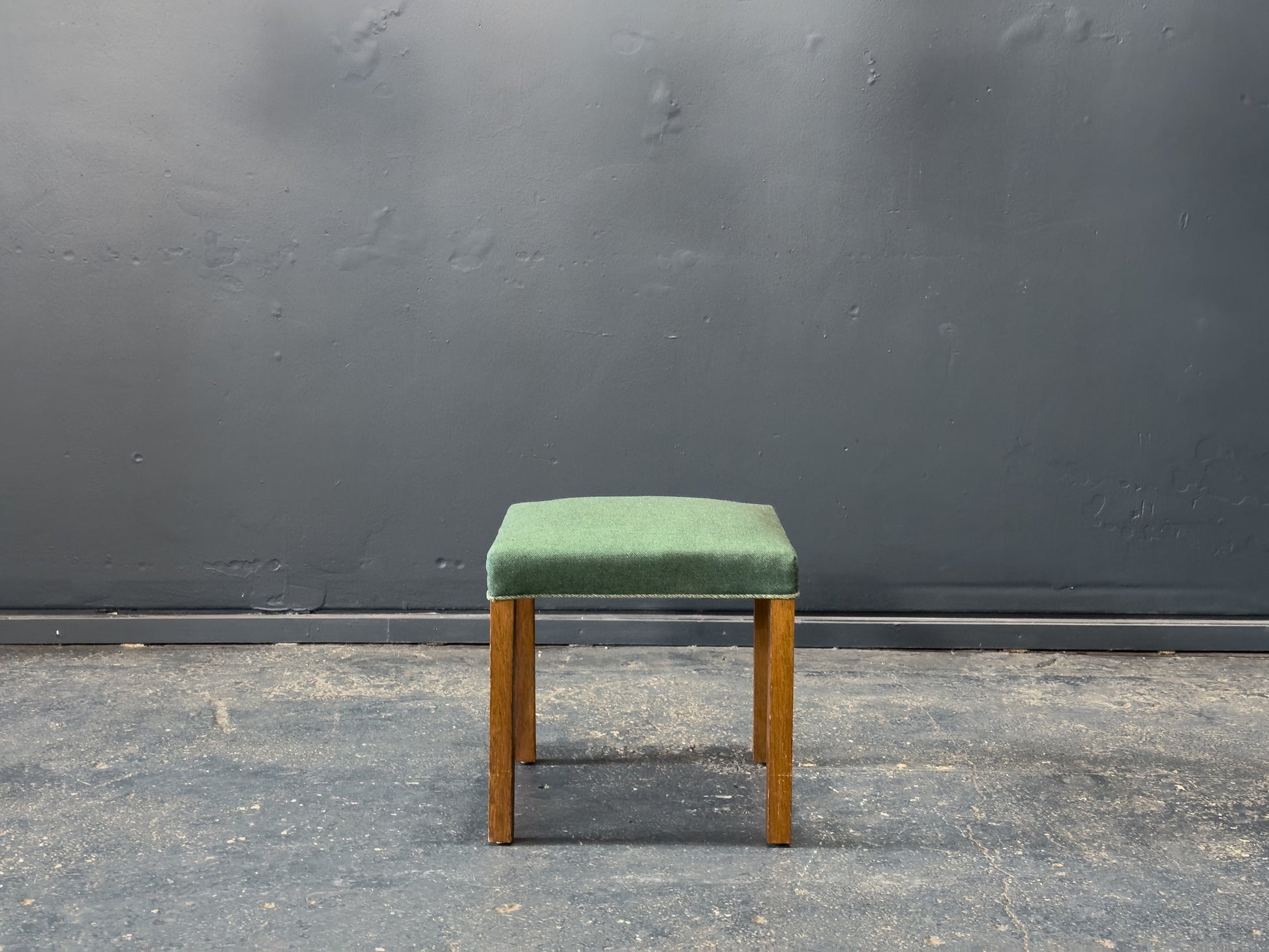 This minimalist green and oak upholstered footstool captures a true mid-century charm. The clean, squared lines of its solid oak legs provide a natural contrast to the soft, moss-green fabric seat.