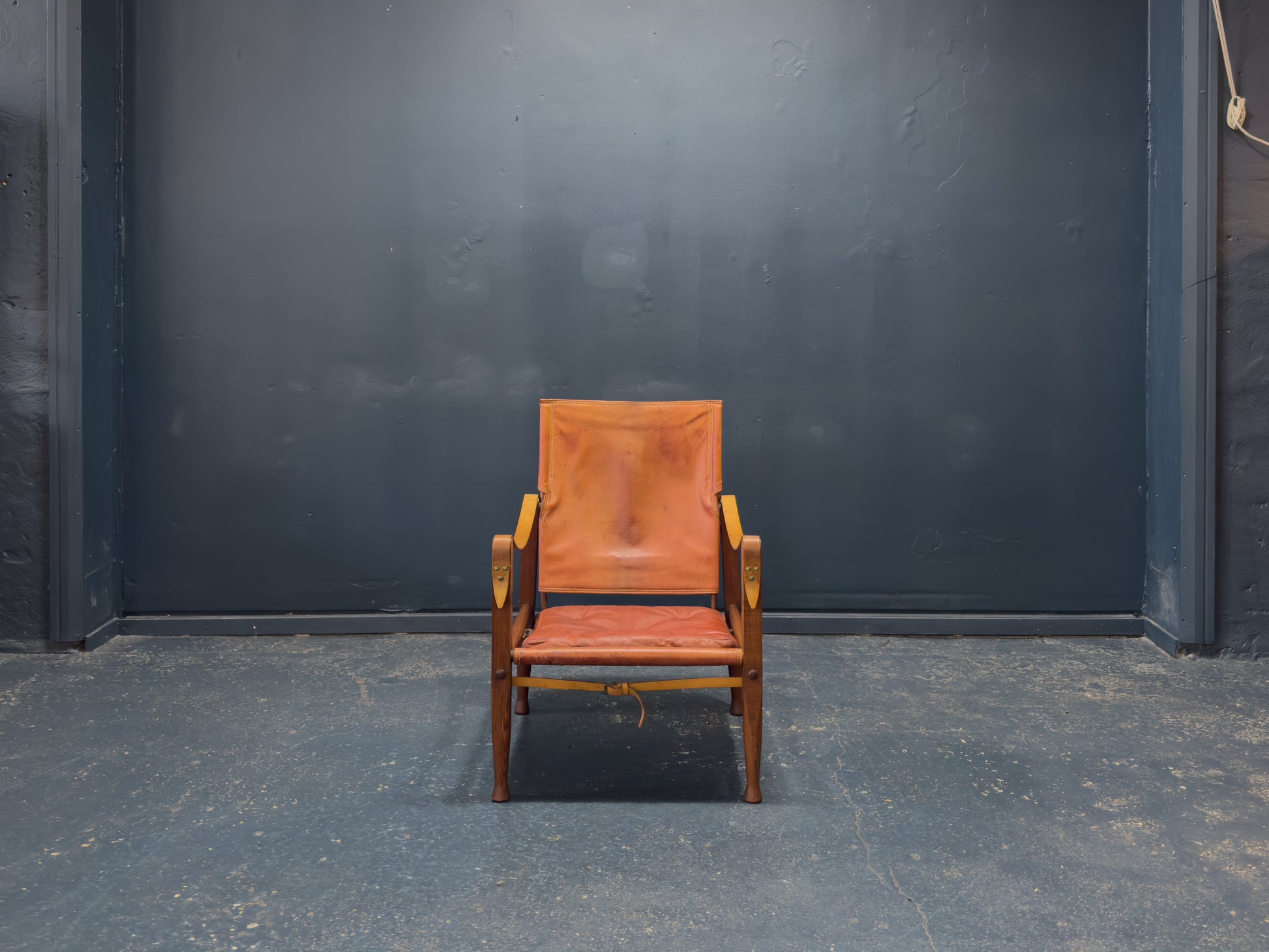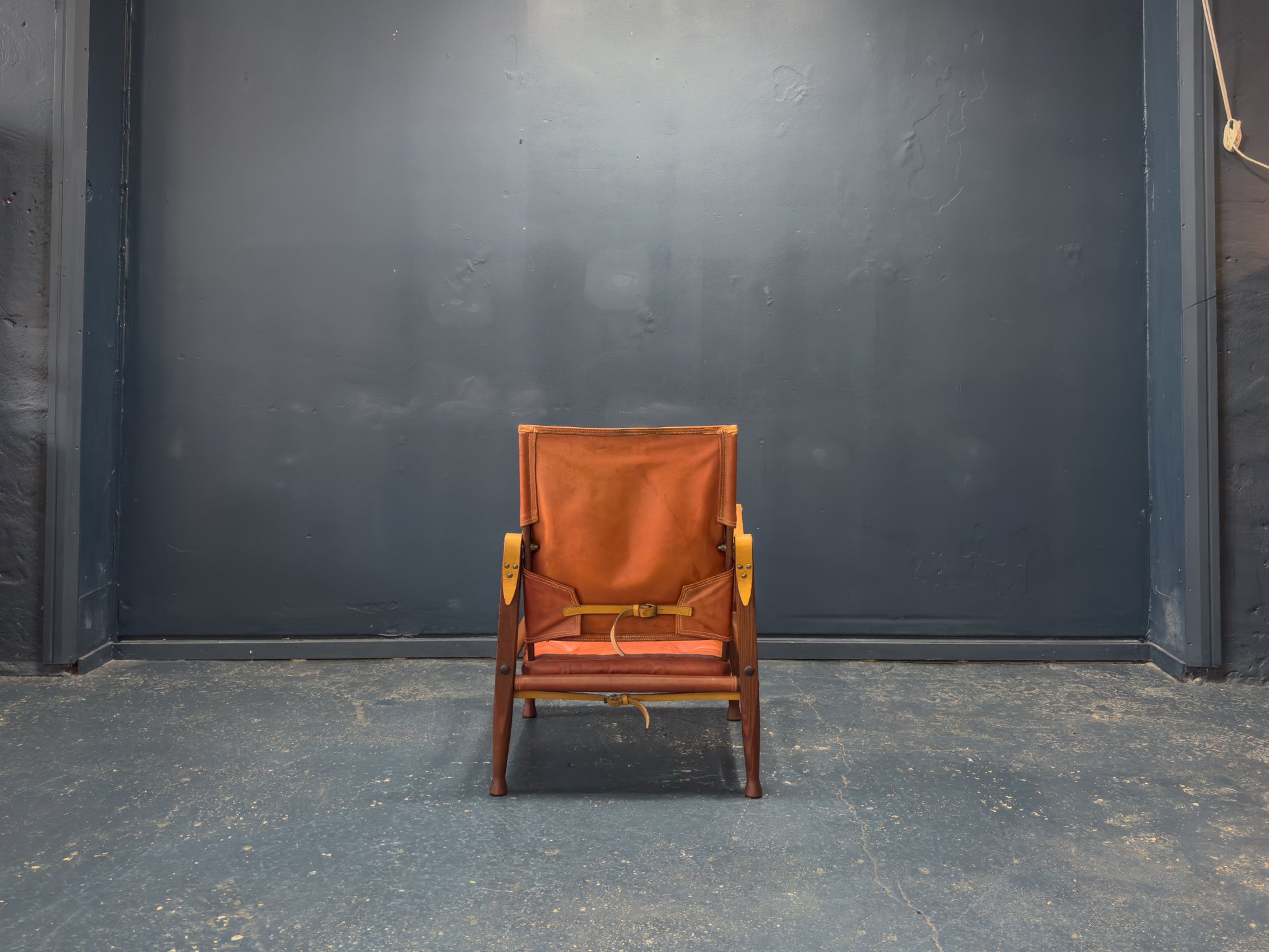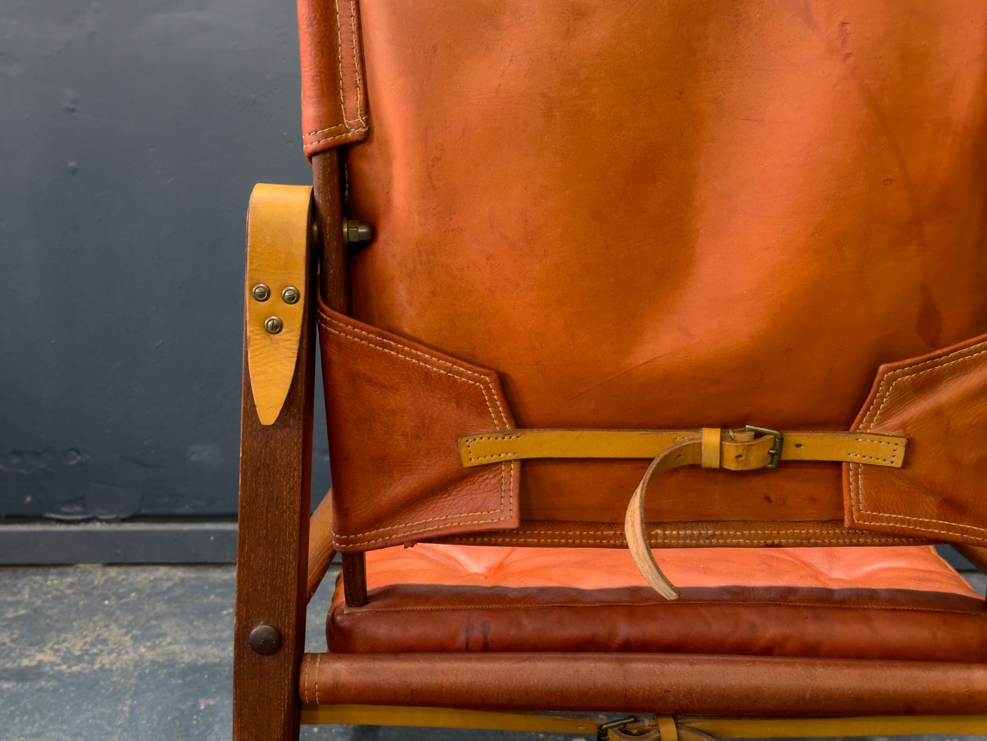 The seat and back are made from natural leather with a rich patina that enhances its warm character. Adjustable leather straps secure the backrest, adding both structural integrity and a refined utilitarian aesthetic. The floating seat design, combined with the supple leather, provides exceptional comfort while maintaining the chair’s iconic silhouette.