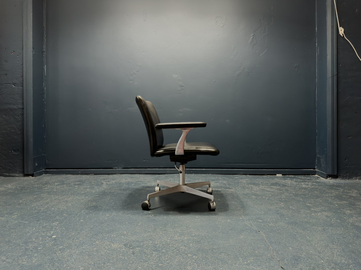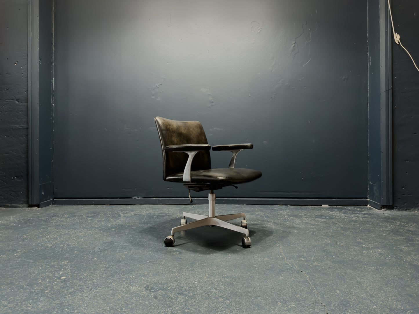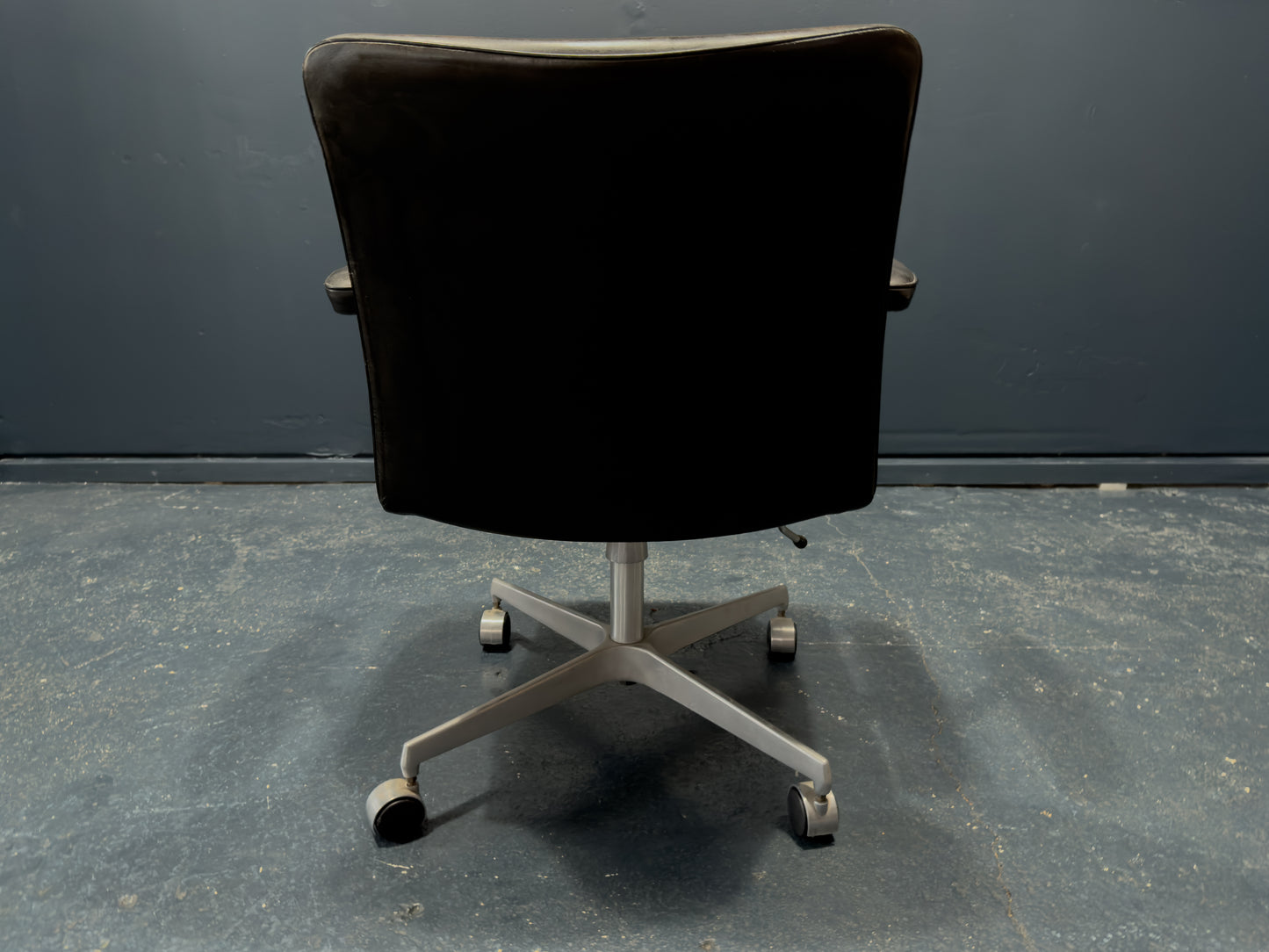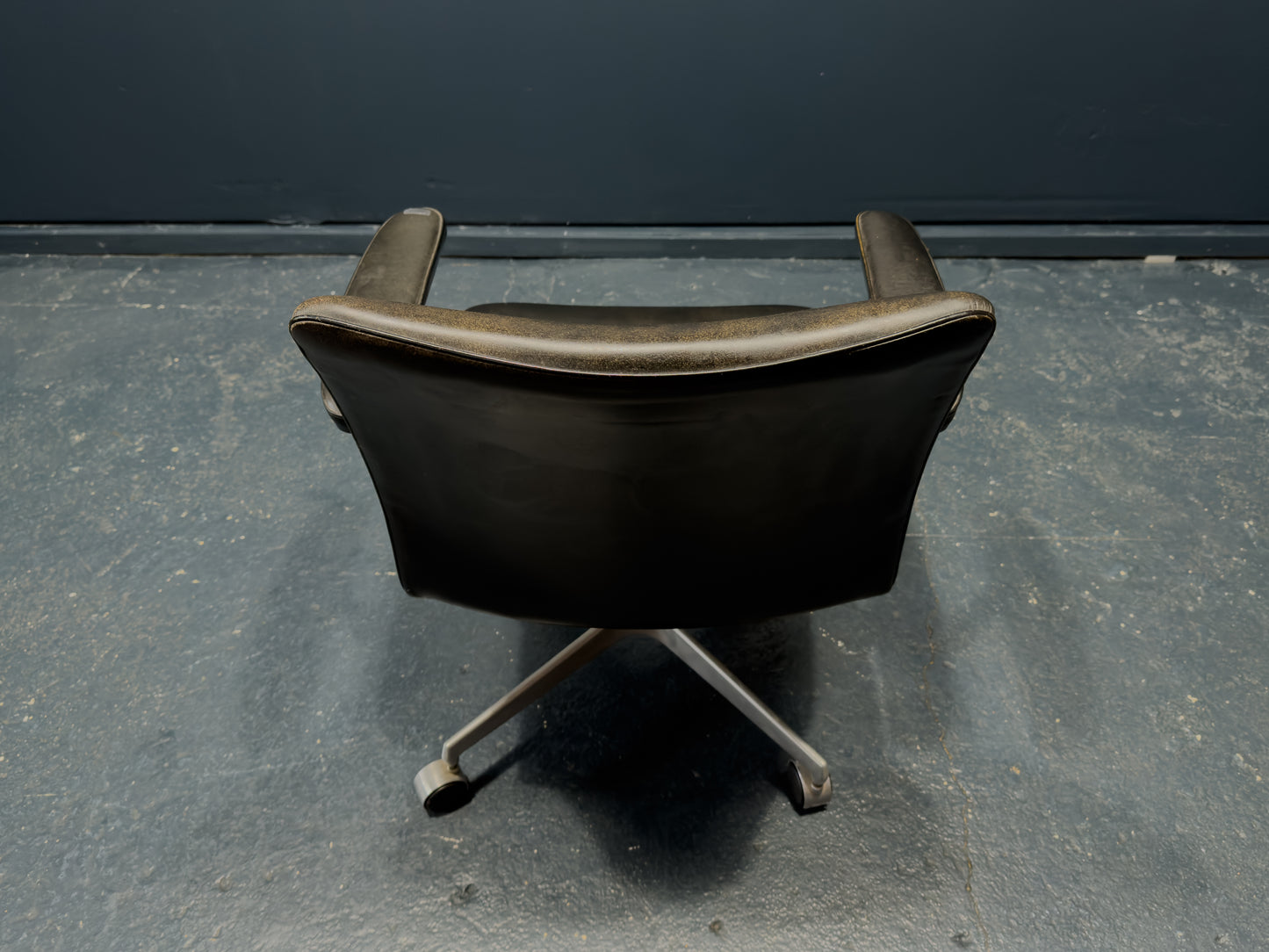 This 'Model 209' swivel chair by France and Søn was created by Danish architect and designer Finn Juhl in the 1960s. The 'Model 209' chair was part of the Diplomat and Technocrat office series created by Juhl and France and Søn. This chair features the original gorgeous patinated black leather upholstery, that is perfectly complimented by the chrome frame and hardware. The height of the chair is adjustable.