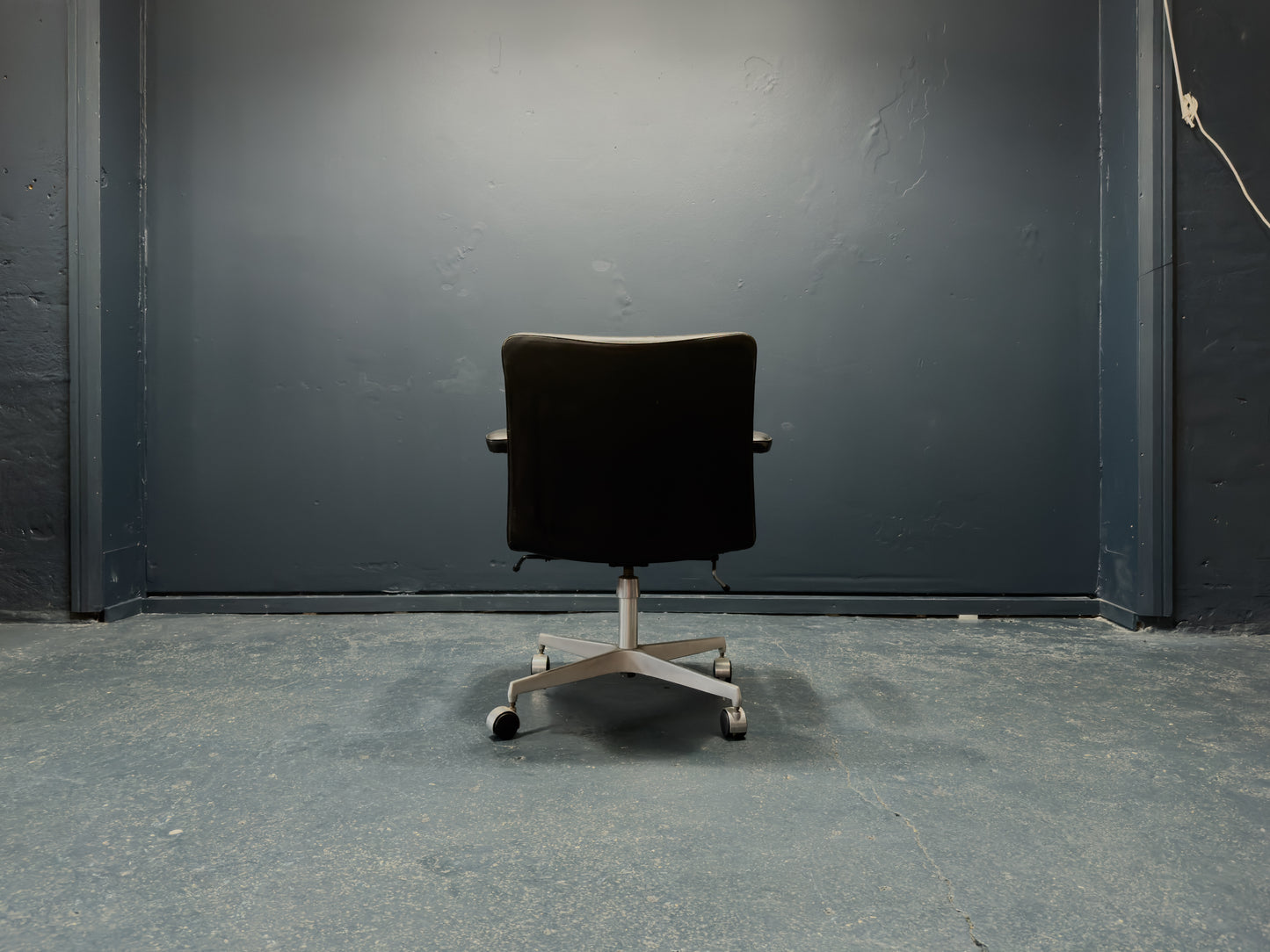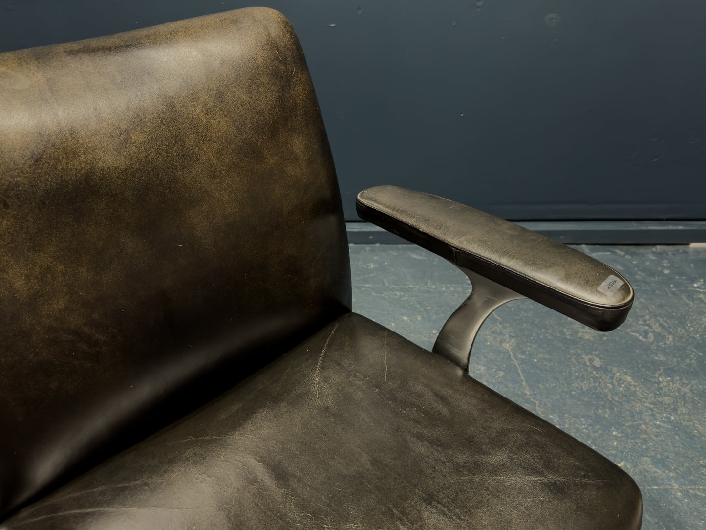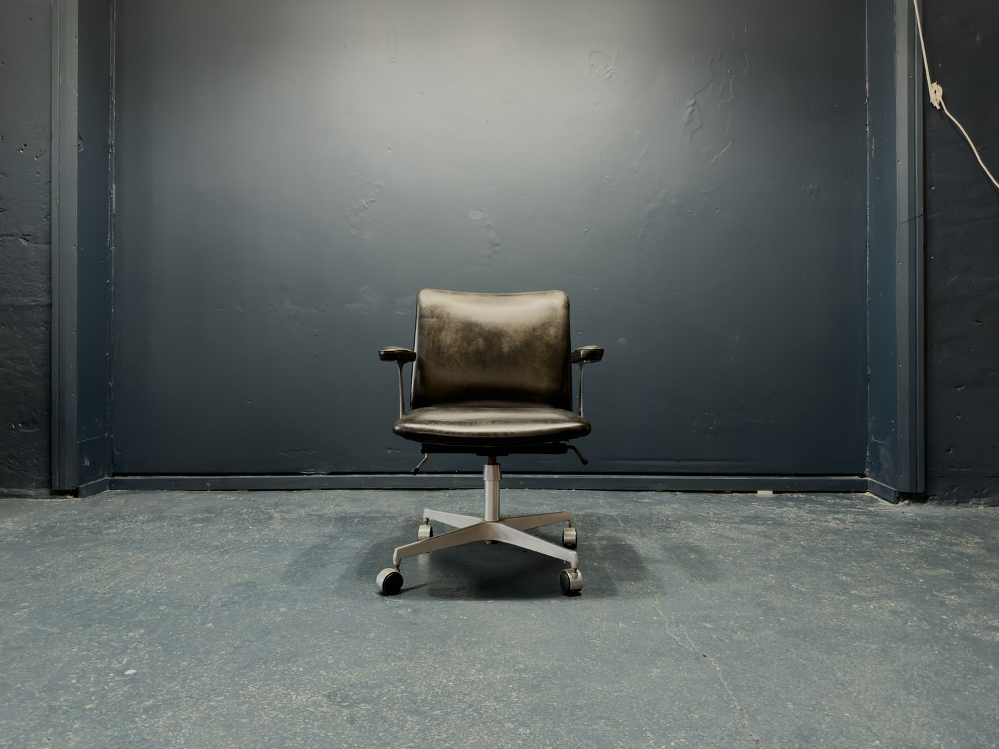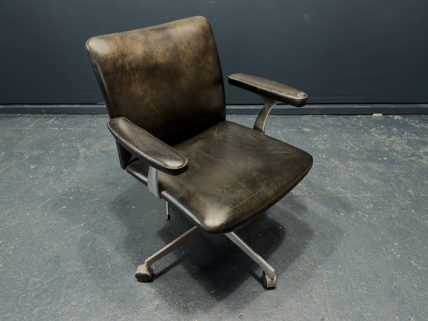 This 'Model 209' swivel chair by France and Søn was created by Danish architect and designer Finn Juhl in the 1960s. The 'Model 209' chair was part of the Diplomat and Technocrat office series created by Juhl and France and Søn. This chair features the original gorgeous patinated black leather upholstery, that is perfectly complimented by the chrome frame and hardware. The height of the chair is adjustable.