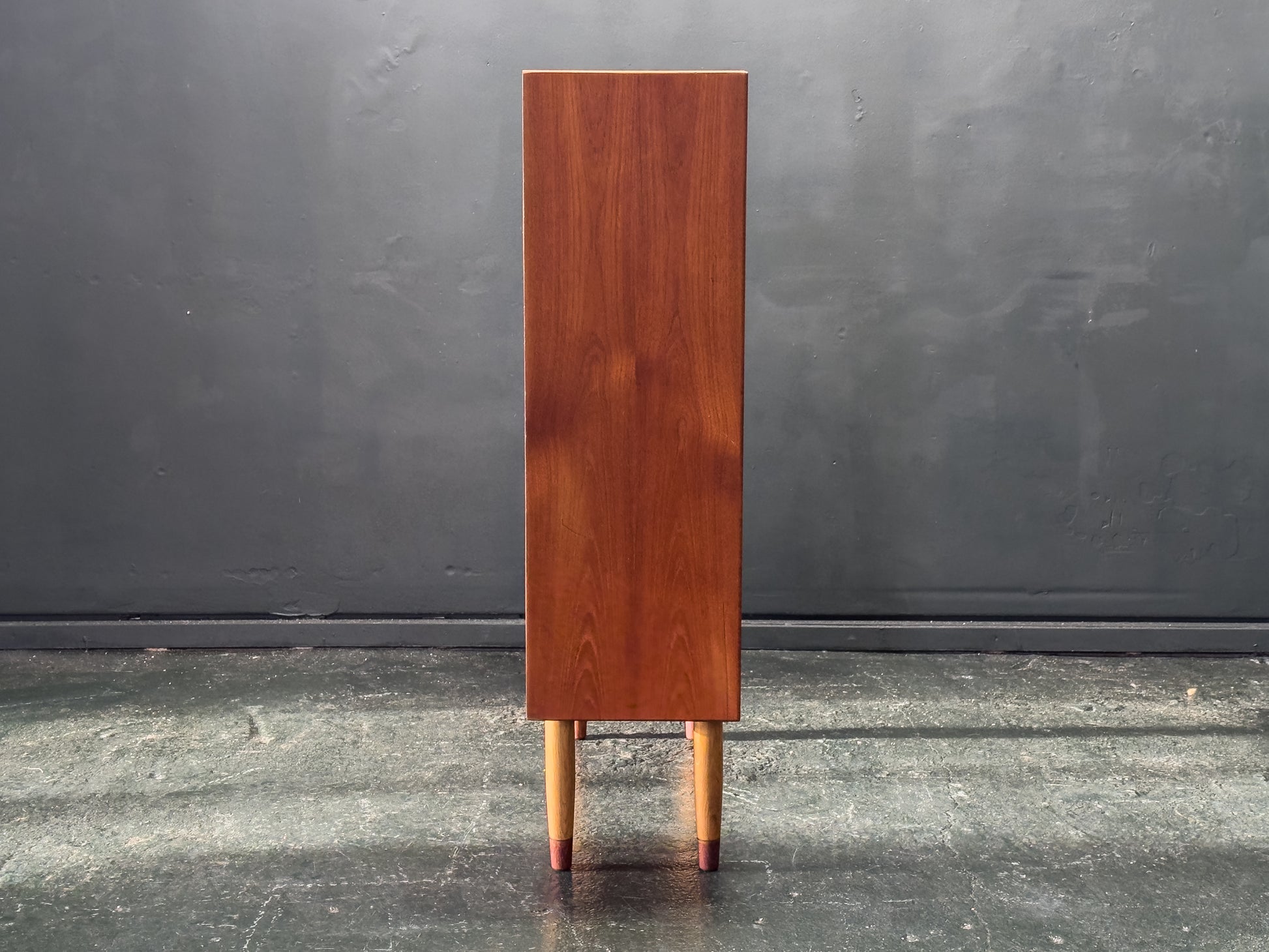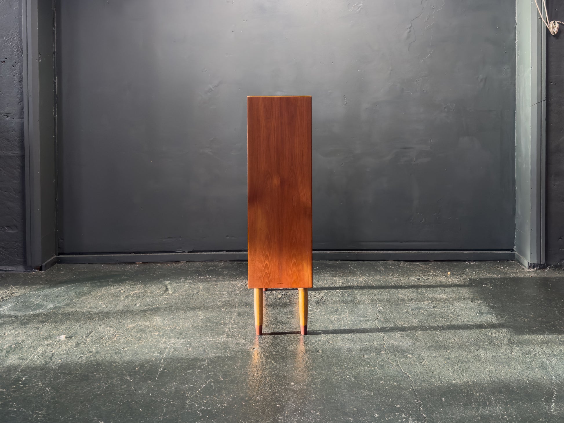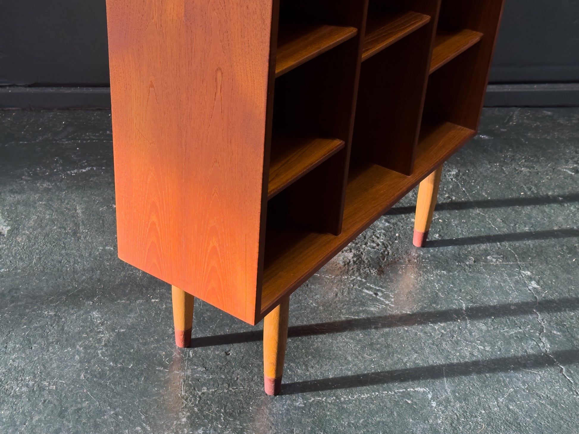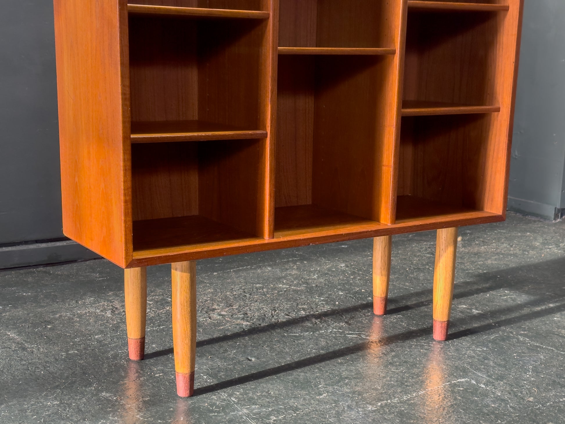 This 1960s Danish teak bookshelf is a masterclass in geometric storage, offering a sophisticated and highly organized display solution for the modern home. This piece combines the organic warmth of teak with a rigid, multi-compartment silhouette.