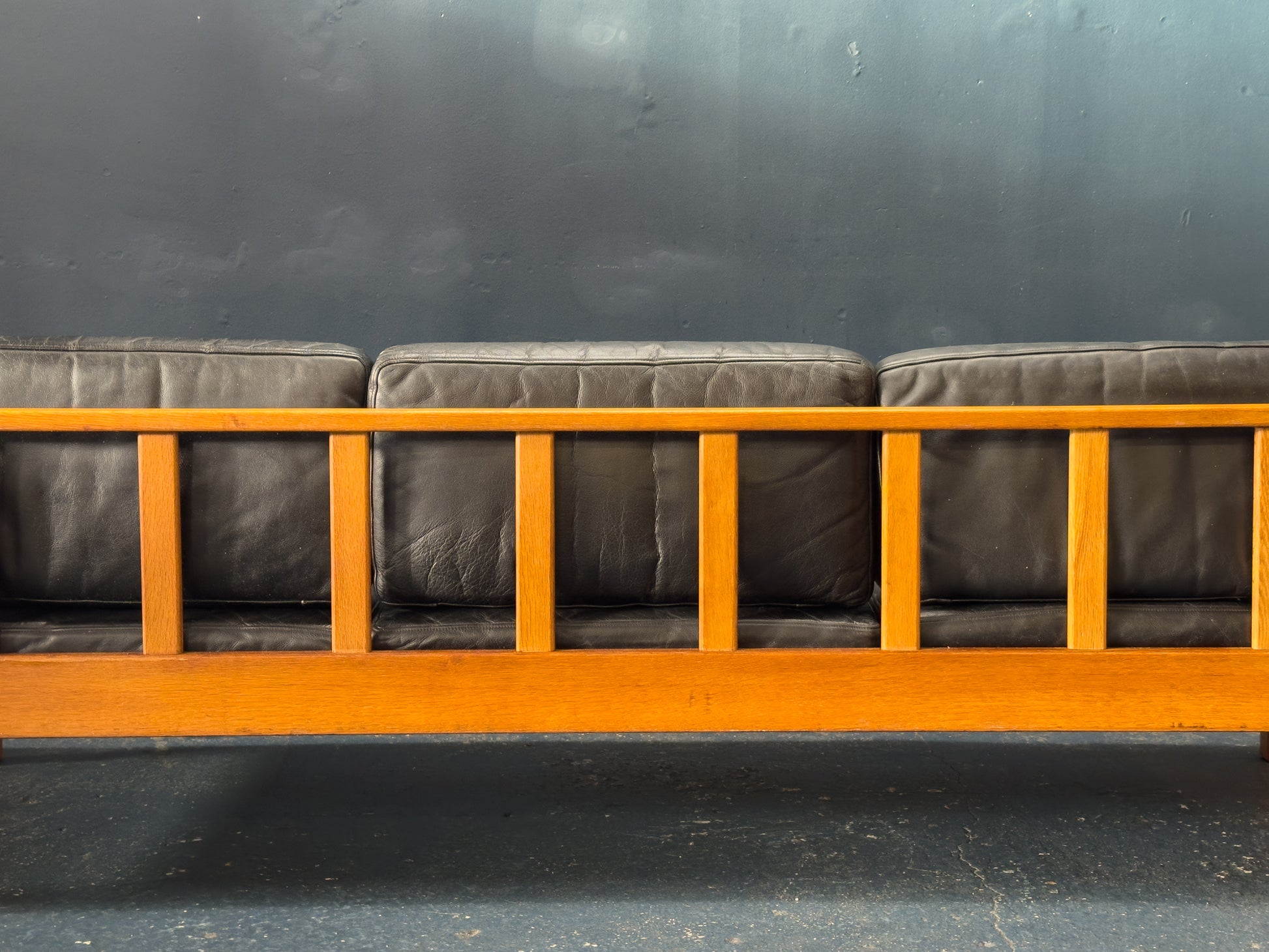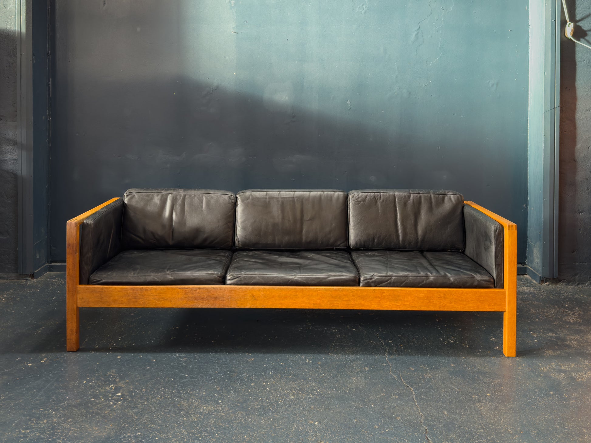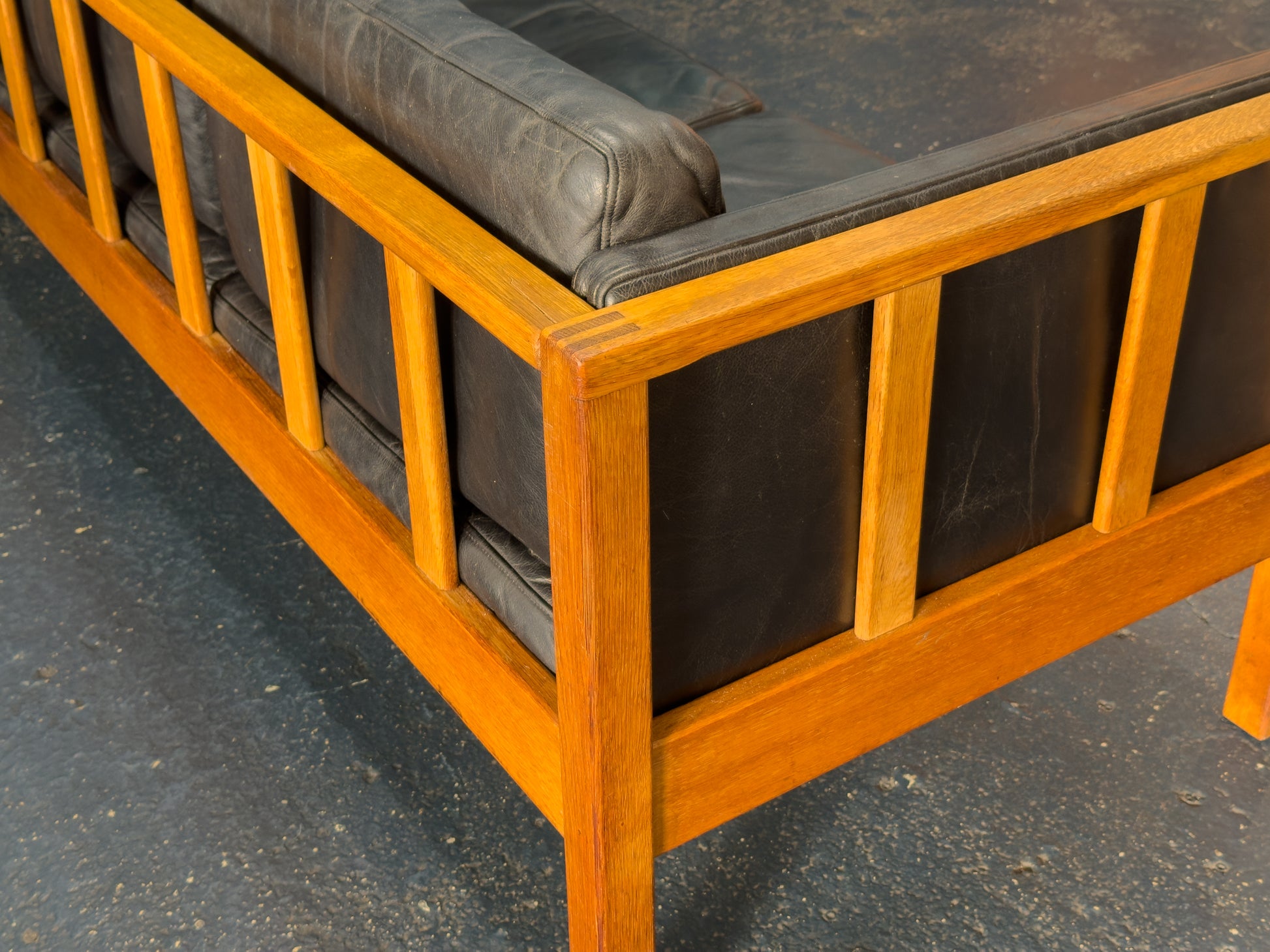 This oak and leather sofa presents a striking blend of sturdy craftsmanship and understated modernism. The frame is constructed from solid oak, showcasing warm, straight grain and clean architectural lines.