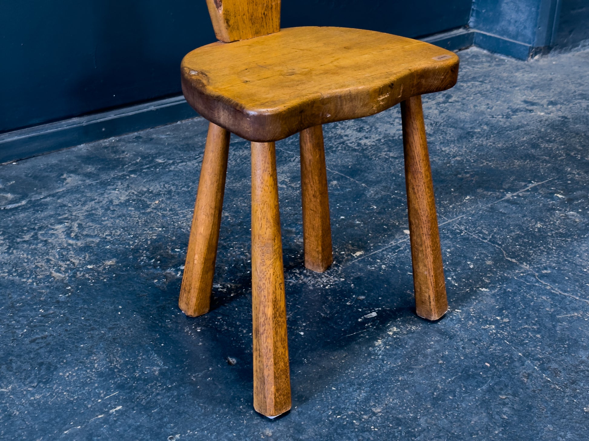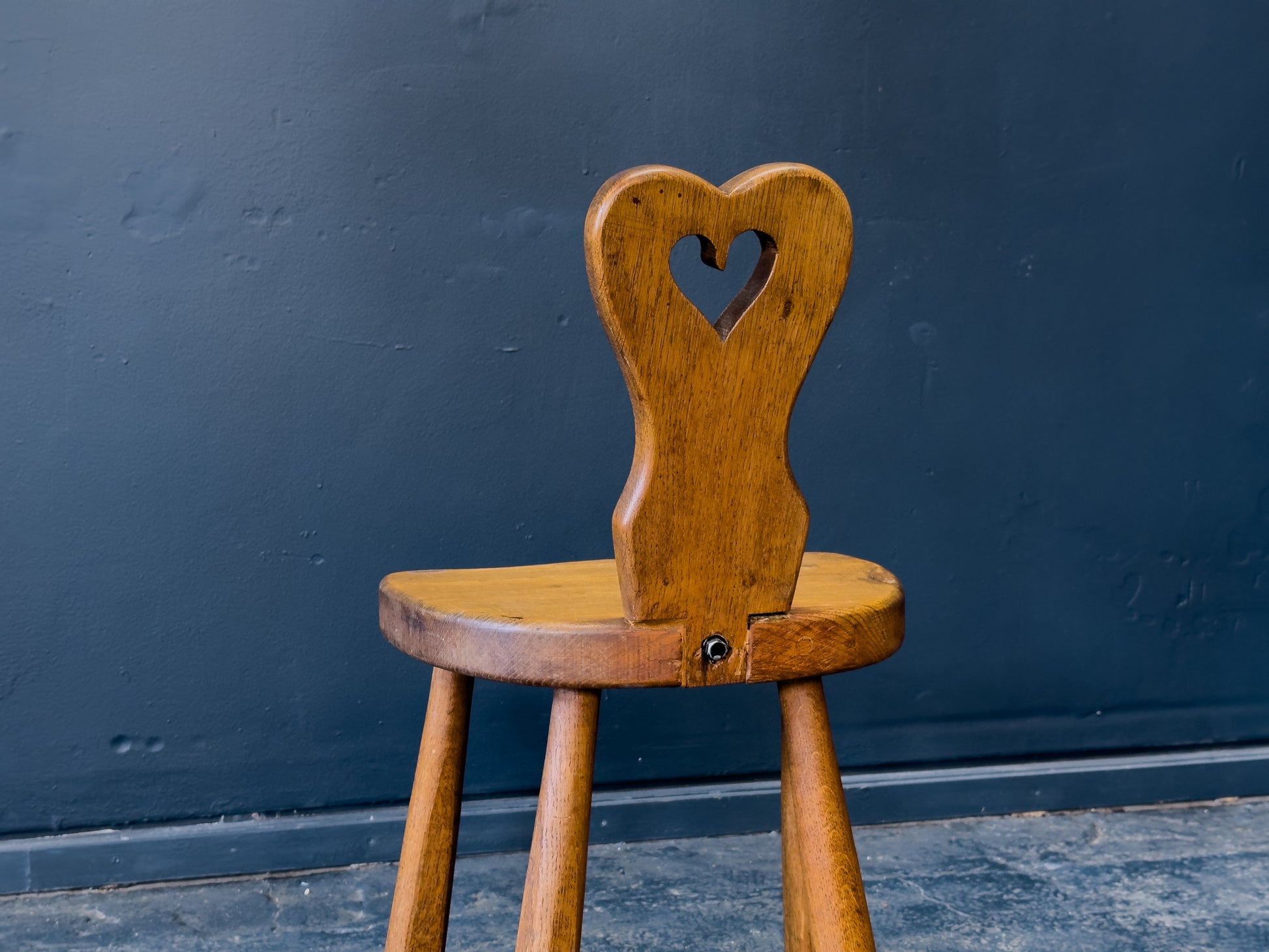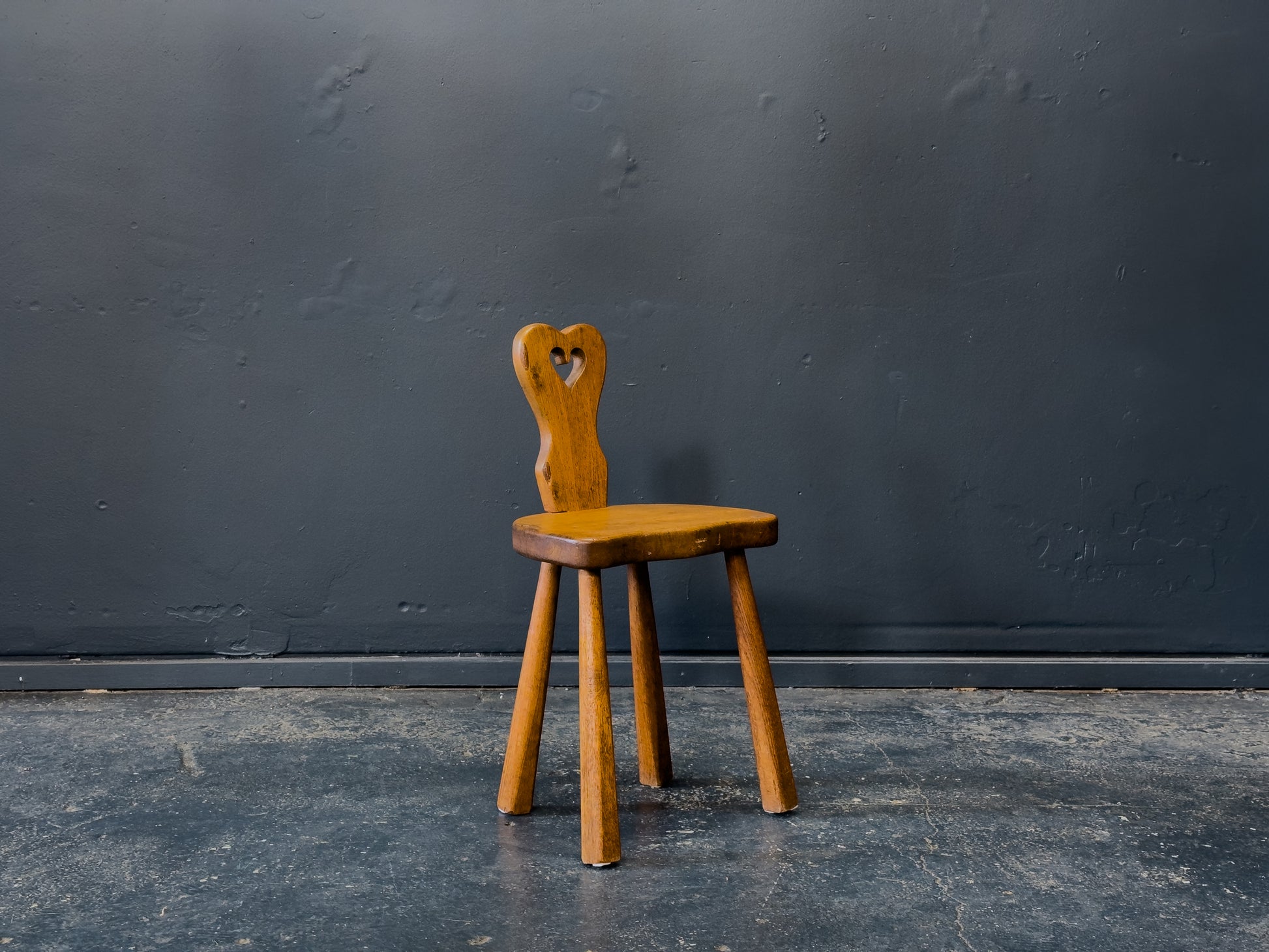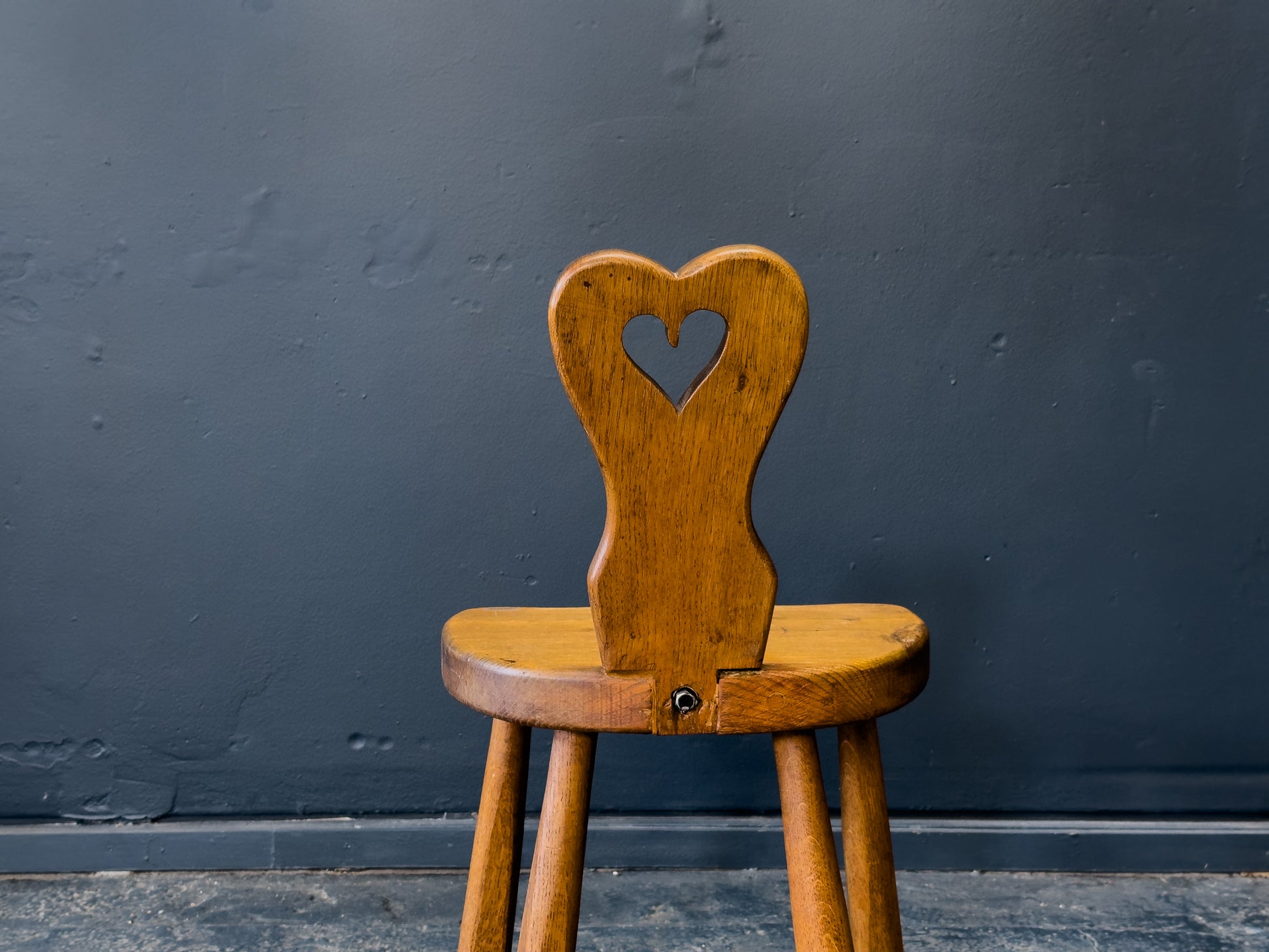 Charming and full of character, this solid oak folk chair captures the rustic beauty of traditional Nordic craftsmanship. Hand-shaped with soft, organic lines, it features a sculpted seat and a heart-shaped cut-out in the backrest.