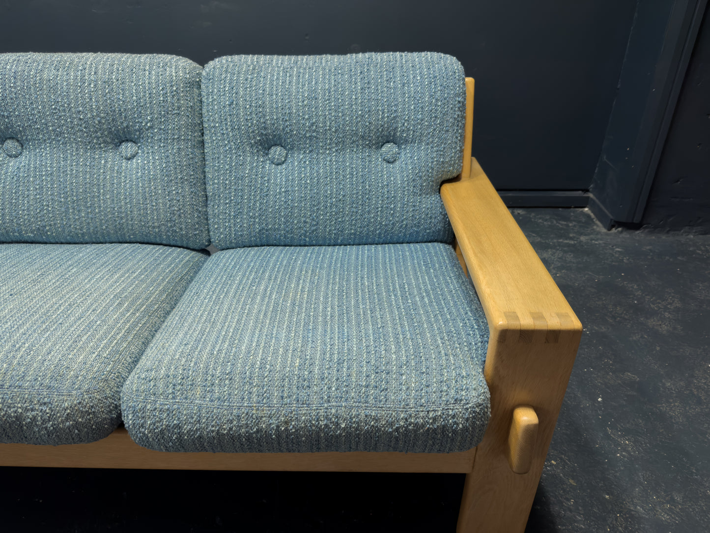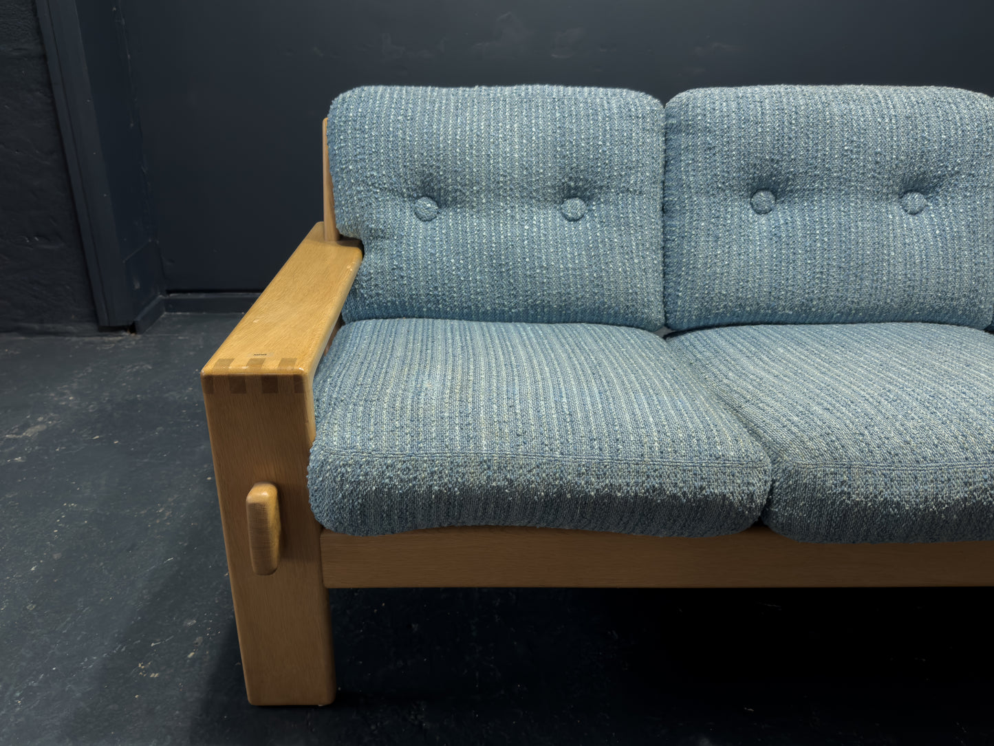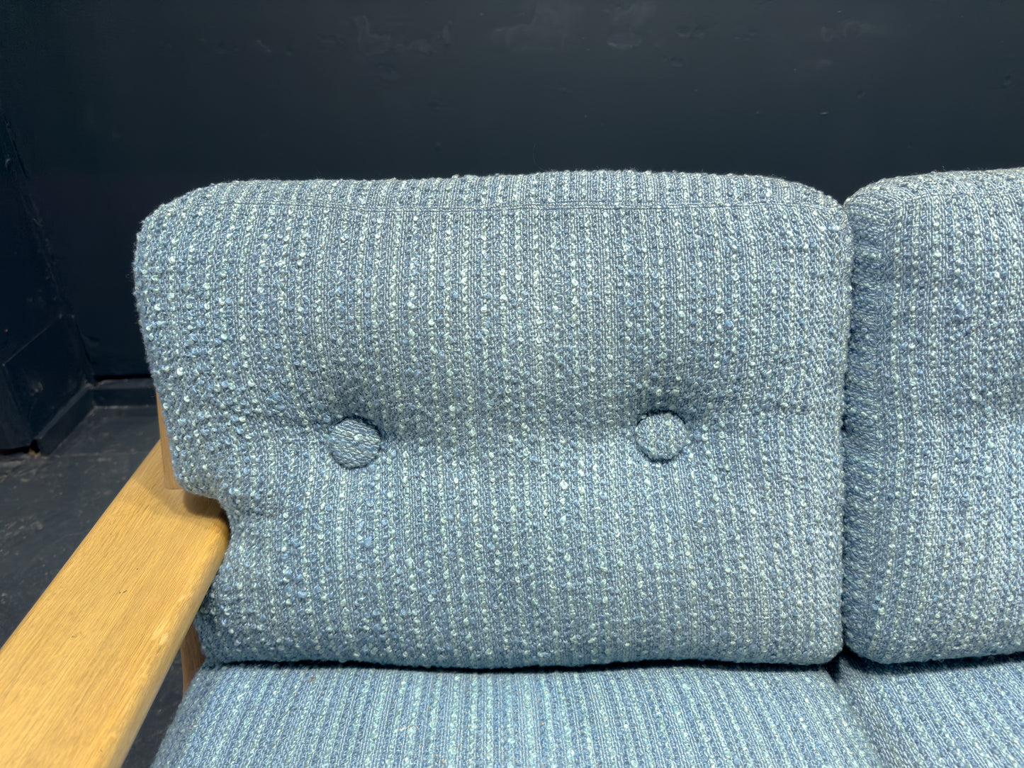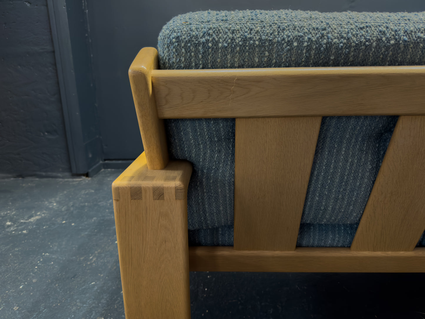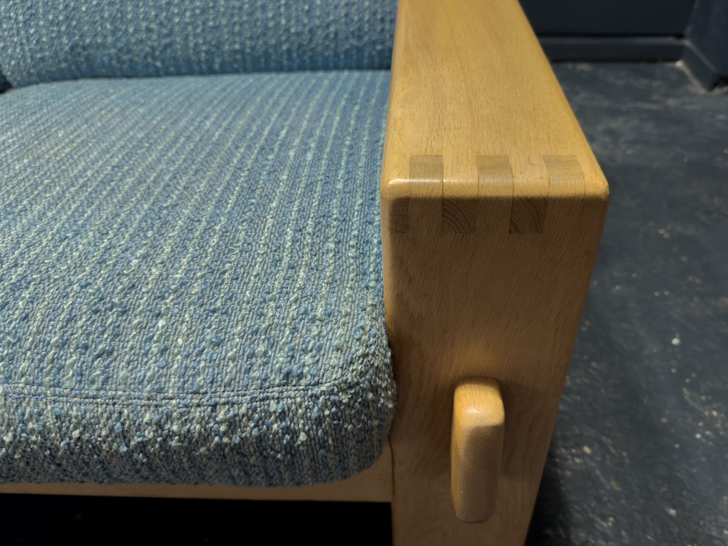 This incredible piece features a strong angled oak frame, it is expertly crafted utilising the necessary technical processes as unique design details. Emphasising the exposed box joints and celebrating the mortise and tenon joints. It is upholstered in a striking blue boucle fabric that pairs wonderfully with the light colouration of the wooden frame. This piece is stunningly crafted and a statement example of the essence of mid-century design.