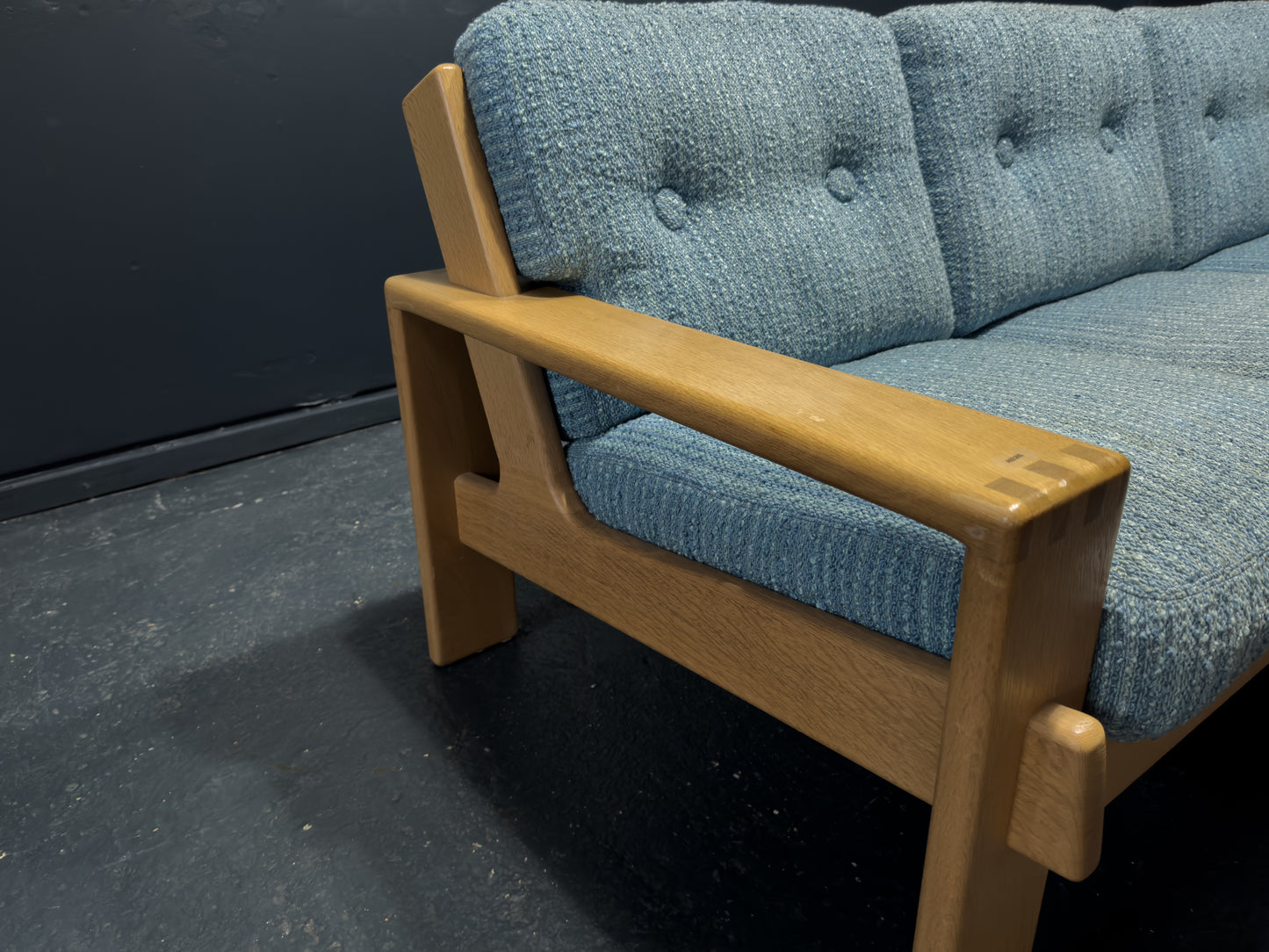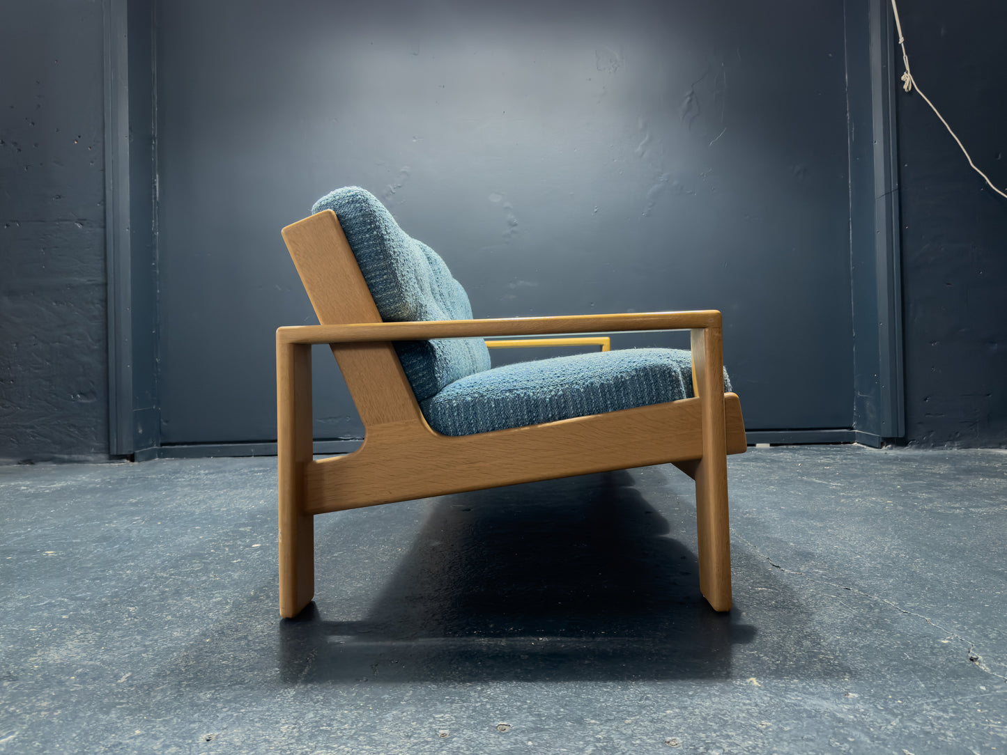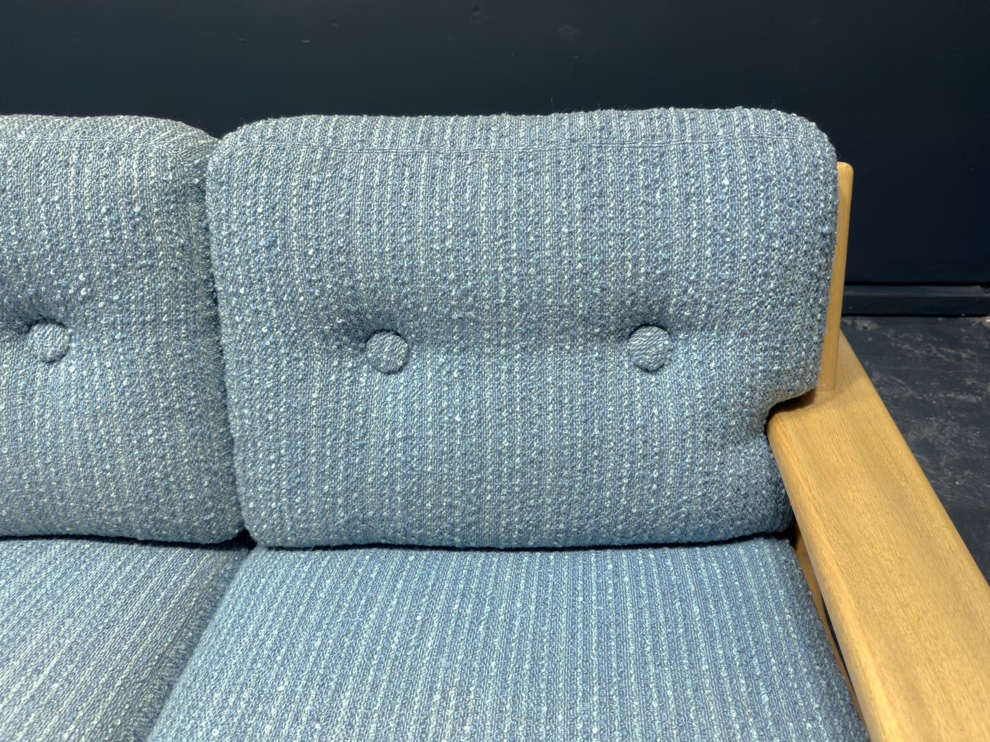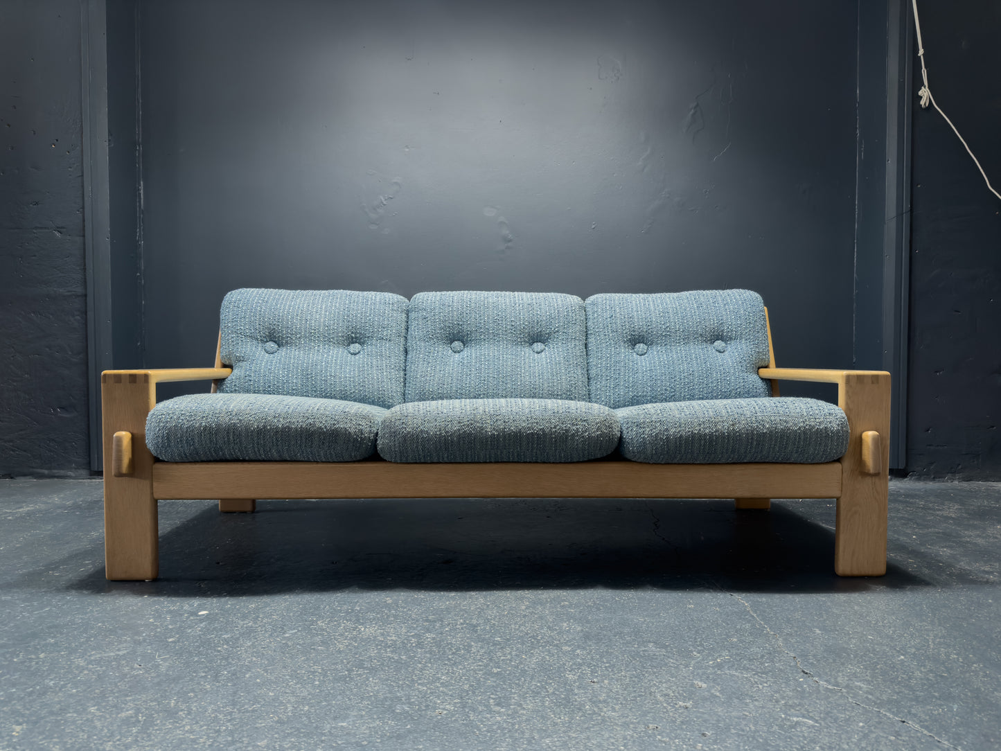This incredible piece features a strong angled oak frame, it is expertly crafted utilising the necessary technical processes as unique design details. Emphasising the exposed box joints and celebrating the mortise and tenon joints. It is upholstered in a striking blue boucle fabric that pairs wonderfully with the light colouration of the wooden frame. This piece is stunningly crafted and a statement example of the essence of mid-century design.