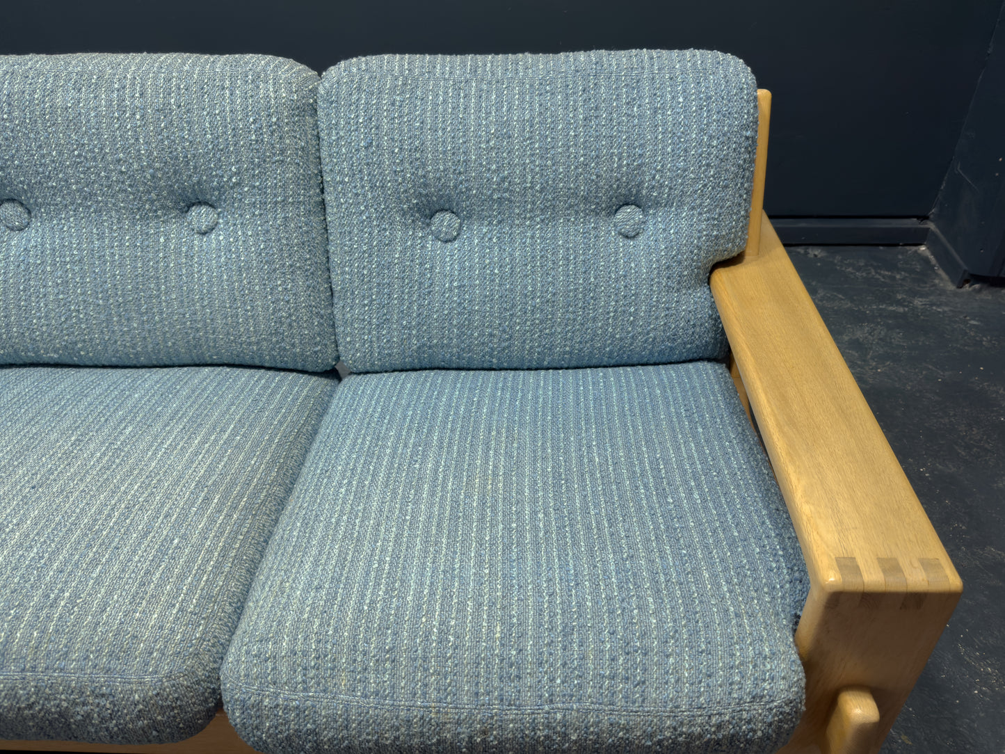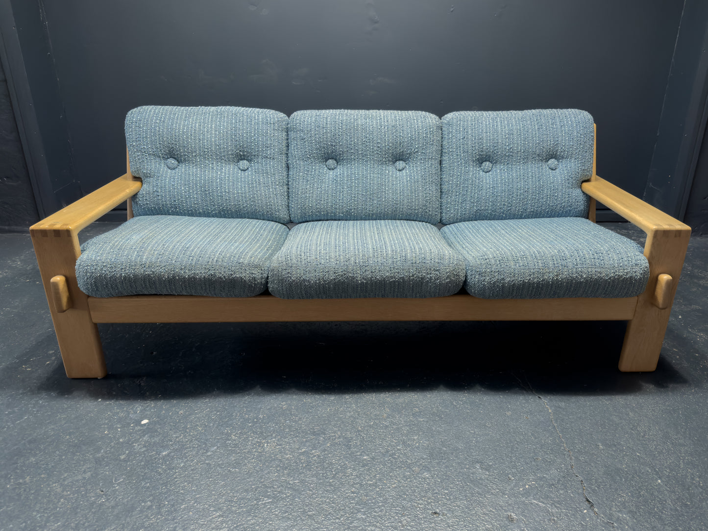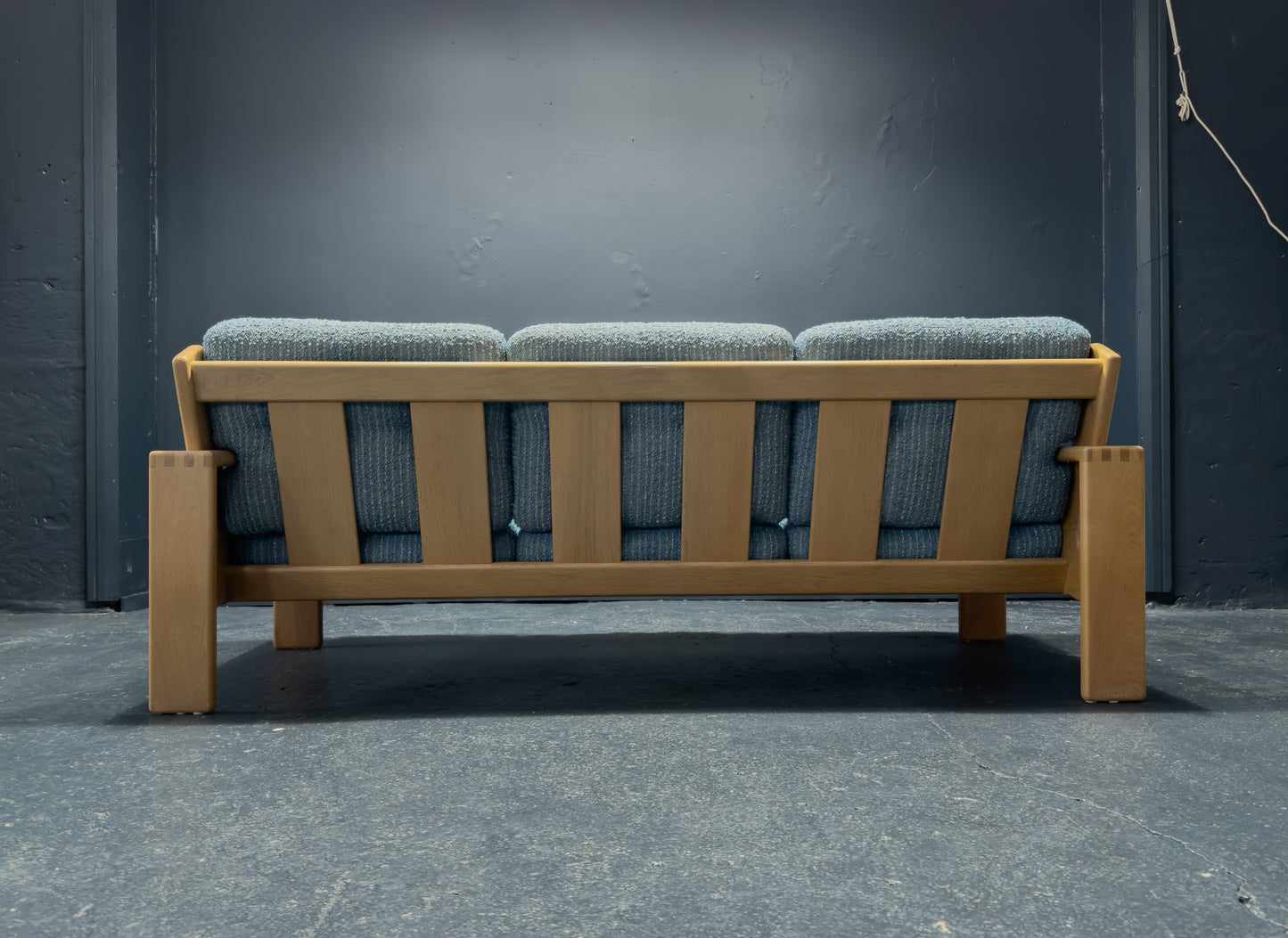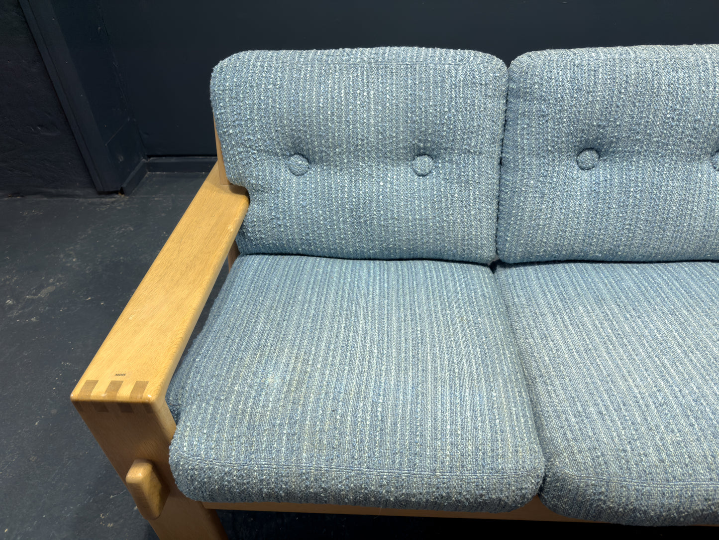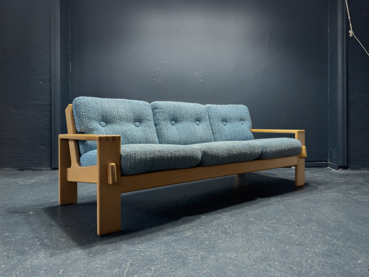 This incredible piece features a strong angled oak frame, it is expertly crafted utilising the necessary technical processes as unique design details. Emphasising the exposed box joints and celebrating the mortise and tenon joints. It is upholstered in a striking blue boucle fabric that pairs wonderfully with the light colouration of the wooden frame. This piece is stunningly crafted and a statement example of the essence of mid-century design.