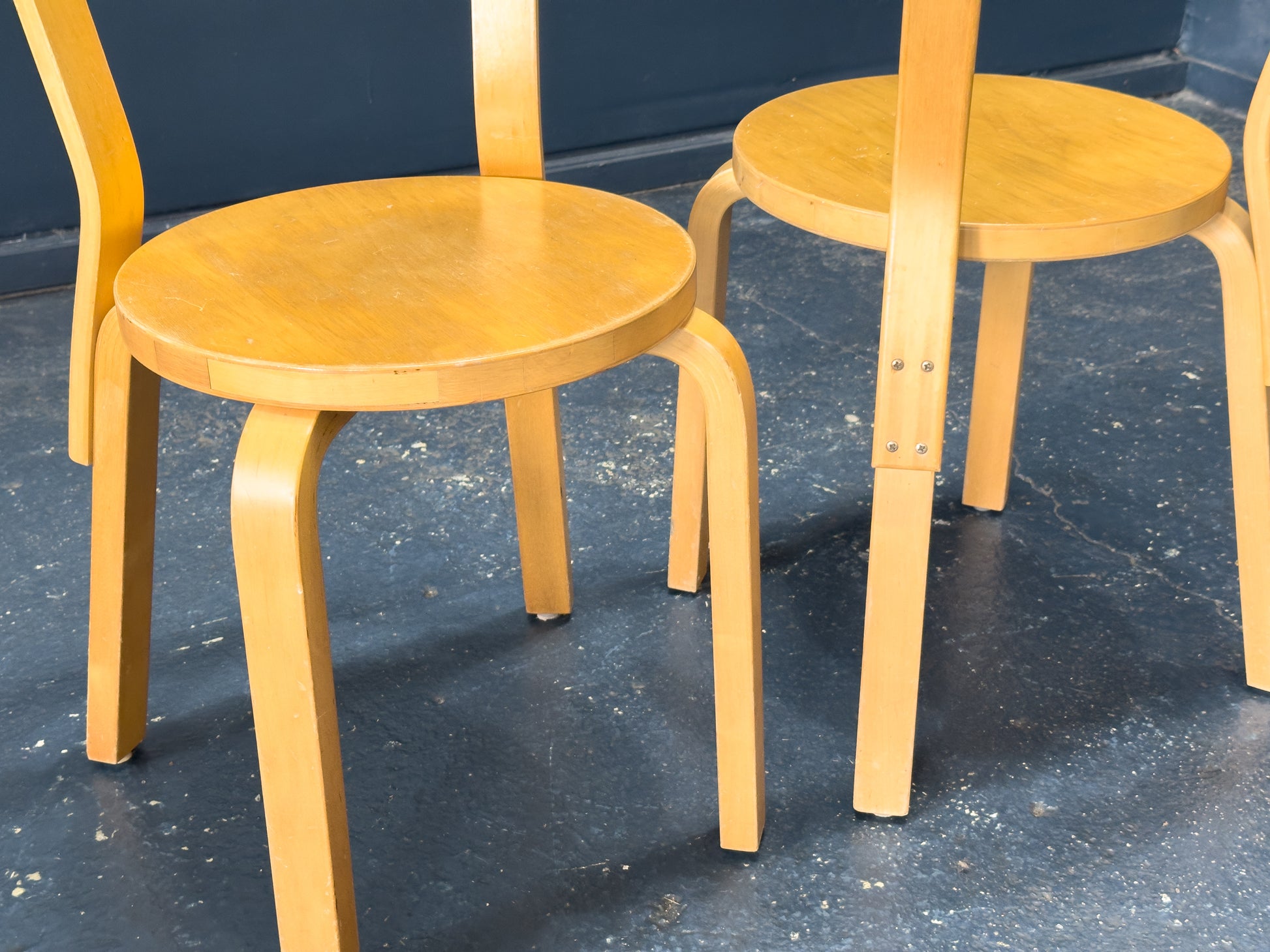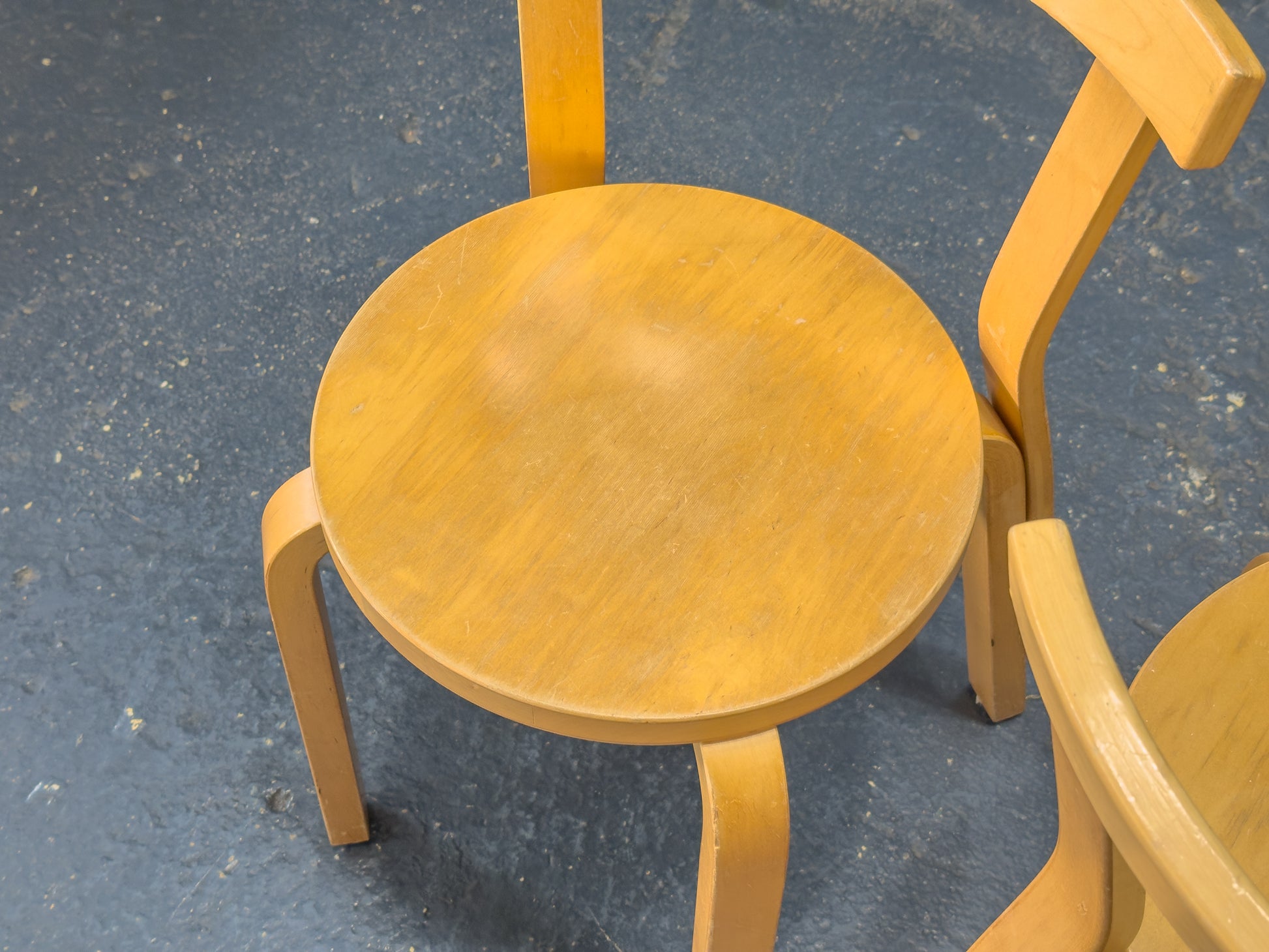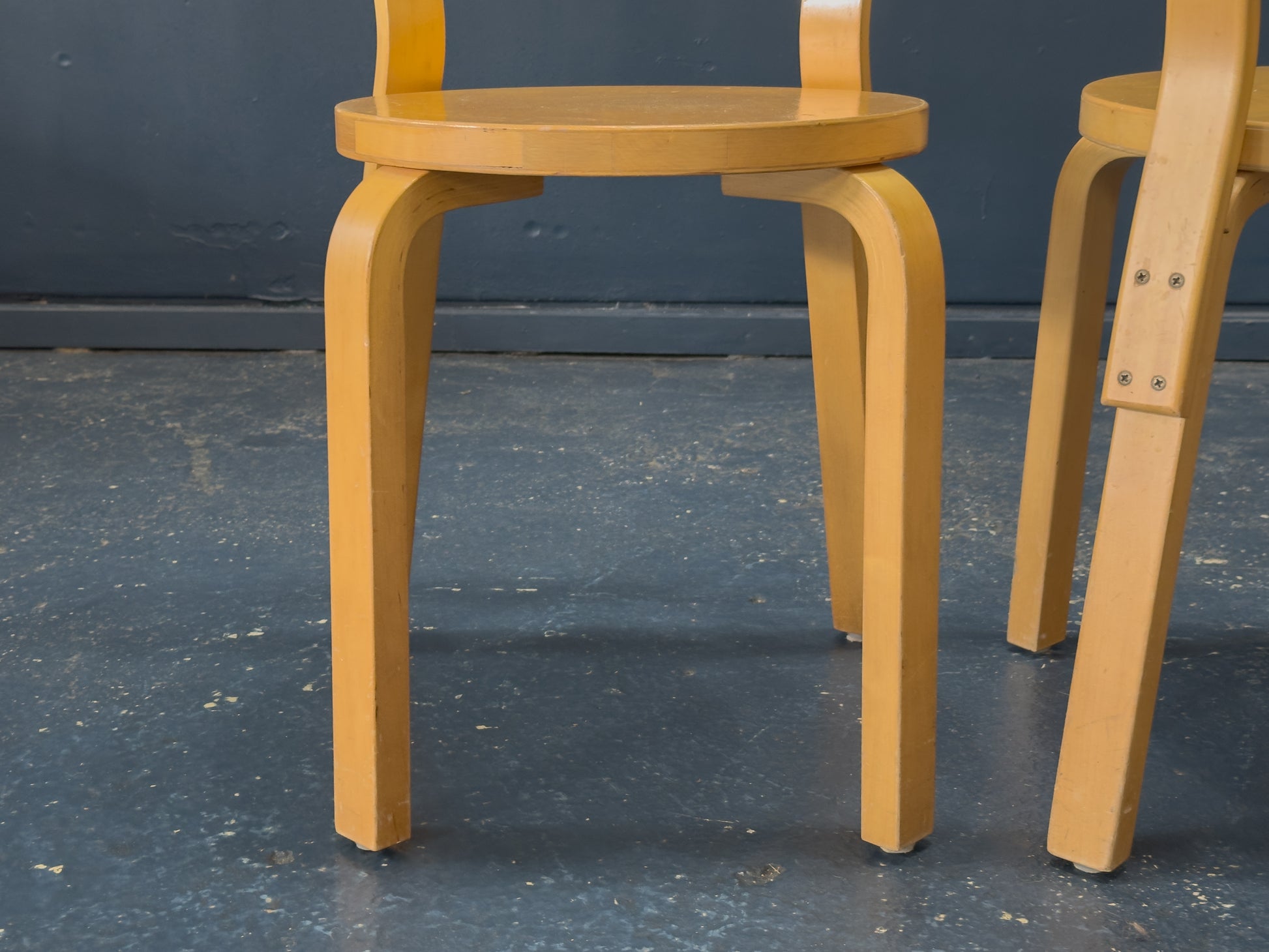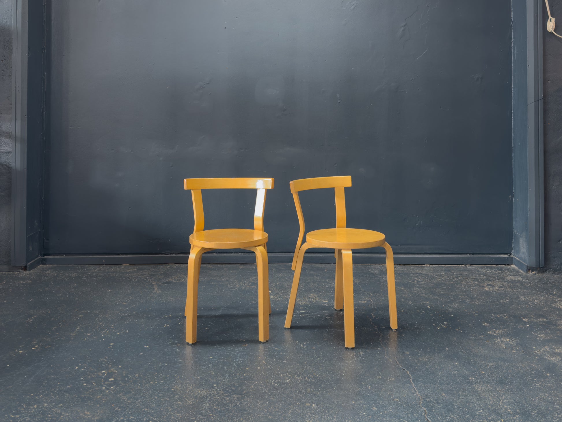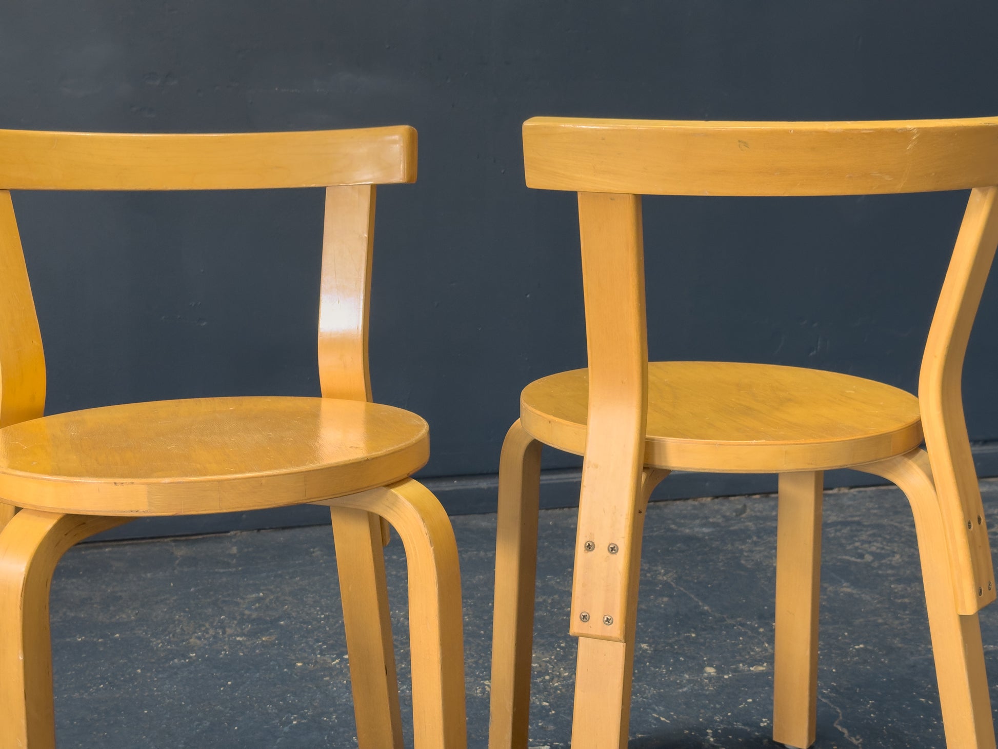 This pair of Alvar Aalto Model 68 chairs for Artek embody classic mid-century design, defined by clean geometry, thoughtful proportions, and the innovative use of bent birch plywood.