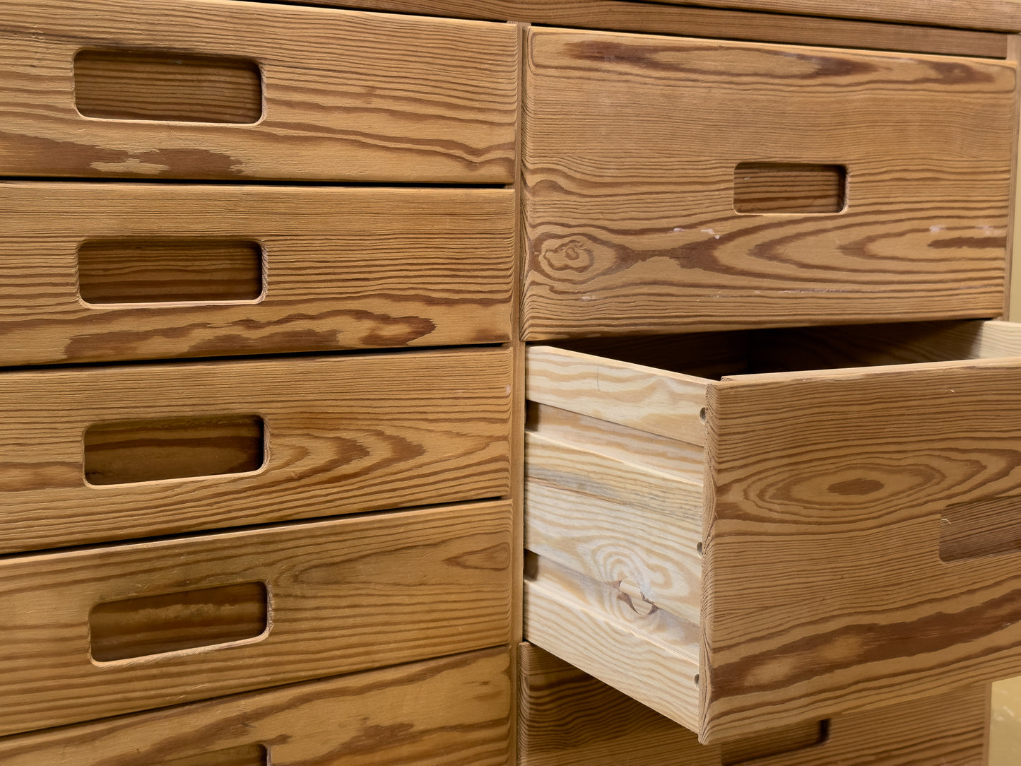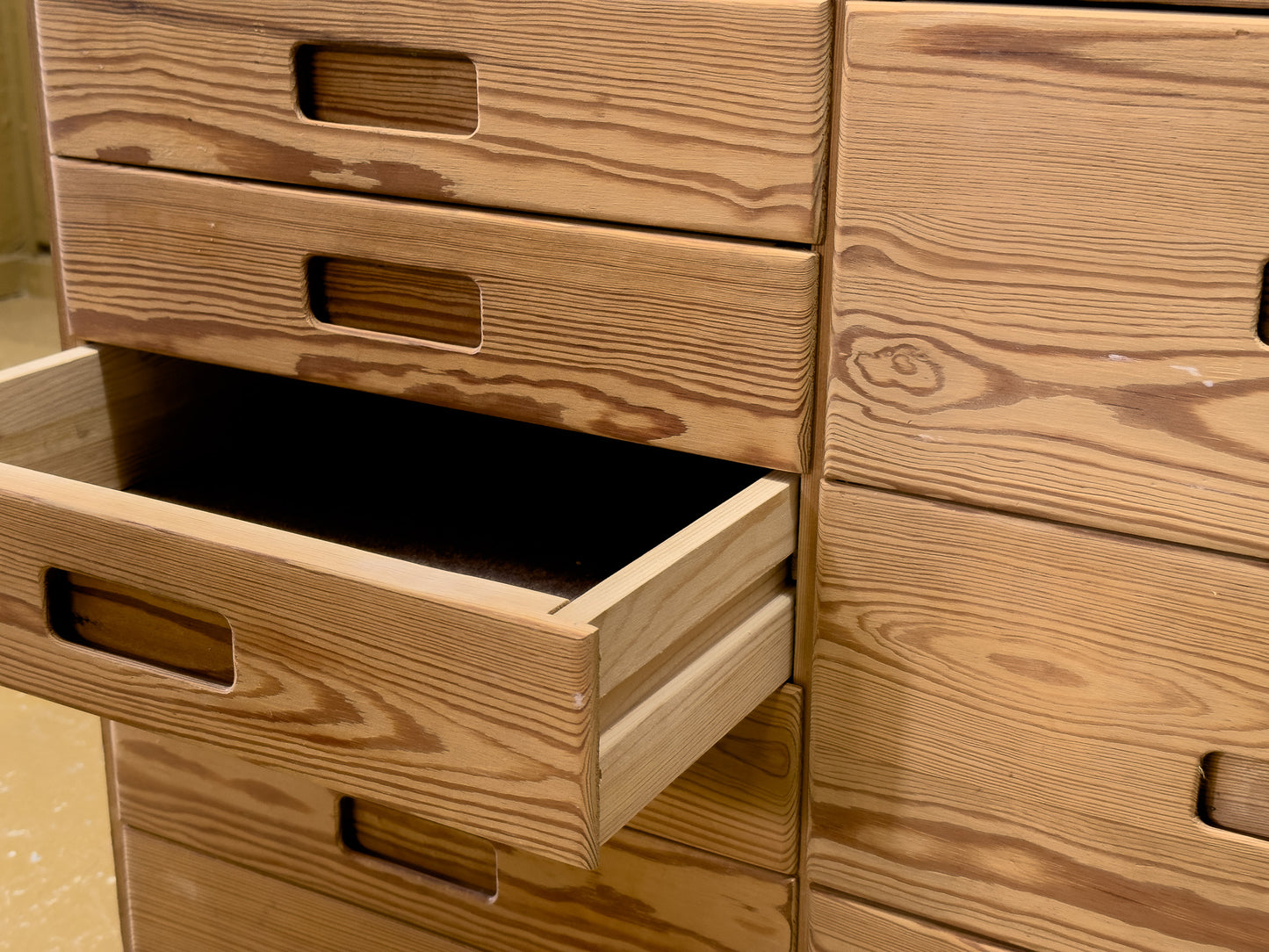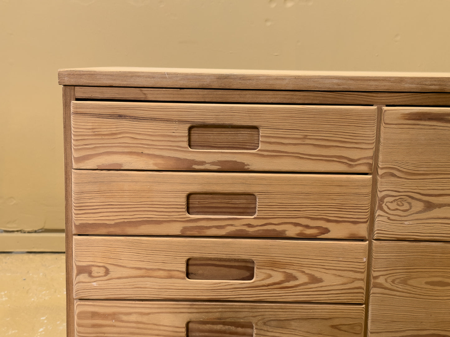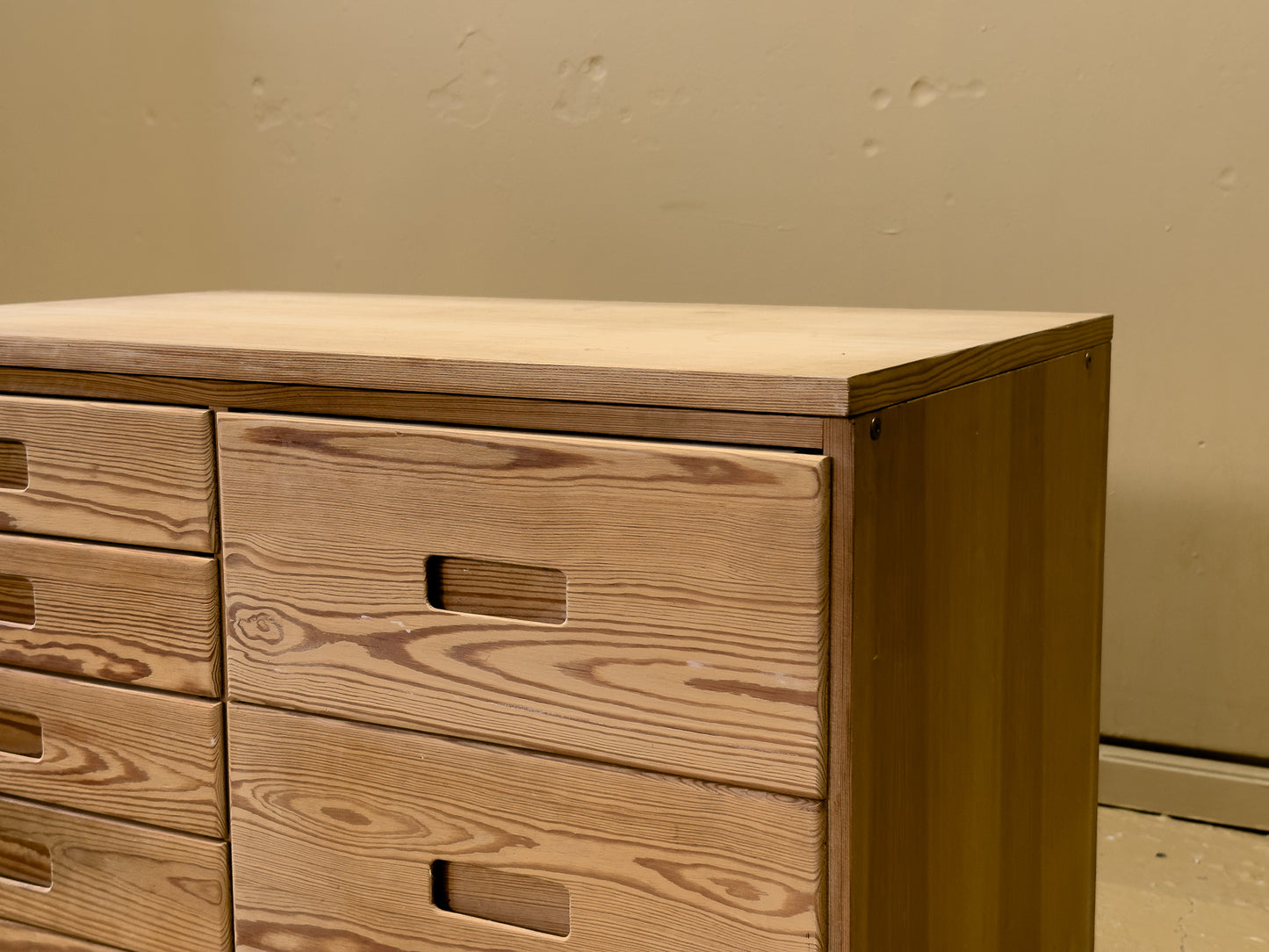 This Danish pine chest of drawers is a stunning example of mid-century craftsmanship, combining functionality with timeless natural beauty. Crafted from solid pine wood, the piece showcases a warm, honey-toned finish that highlights the organic grain patterns and knots, adding character and authenticity. The minimalist design is enhanced by integrated recessed handles, creating a seamless and understated aesthetic.