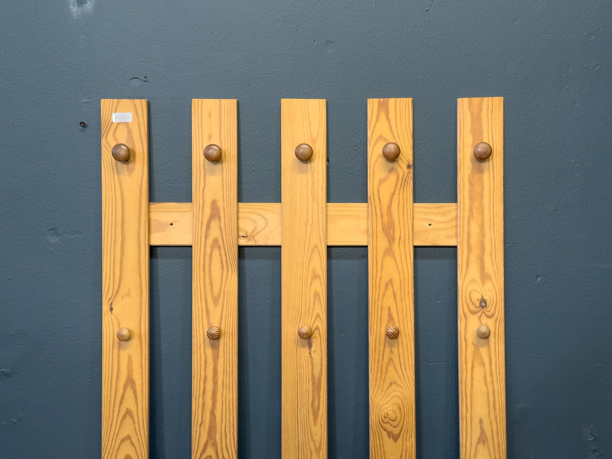 This minimalist wooden coat rack combines natural craftsmanship with practical design. Made from solid wood with a warm, natural finish, it features five vertical slats connected by three horizontal supports. The piece is fitted with a series of sturdy wooden pegs, providing ample space for coats, hats, scarves, or bags.