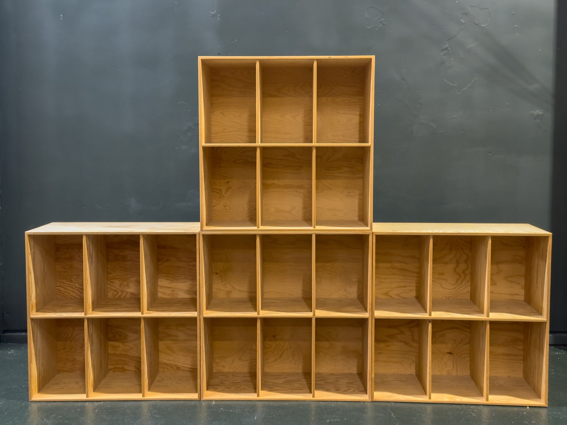 Each unit is lightweight yet sturdy, with a symmetrical open-shelving layout, allowing for effortless organisation and display. The modular construction means they can be arranged in various configurations, stacked, aligned, or used individually. With a clean-lined, raw aesthetic, these shelves are ideal for any storage need.