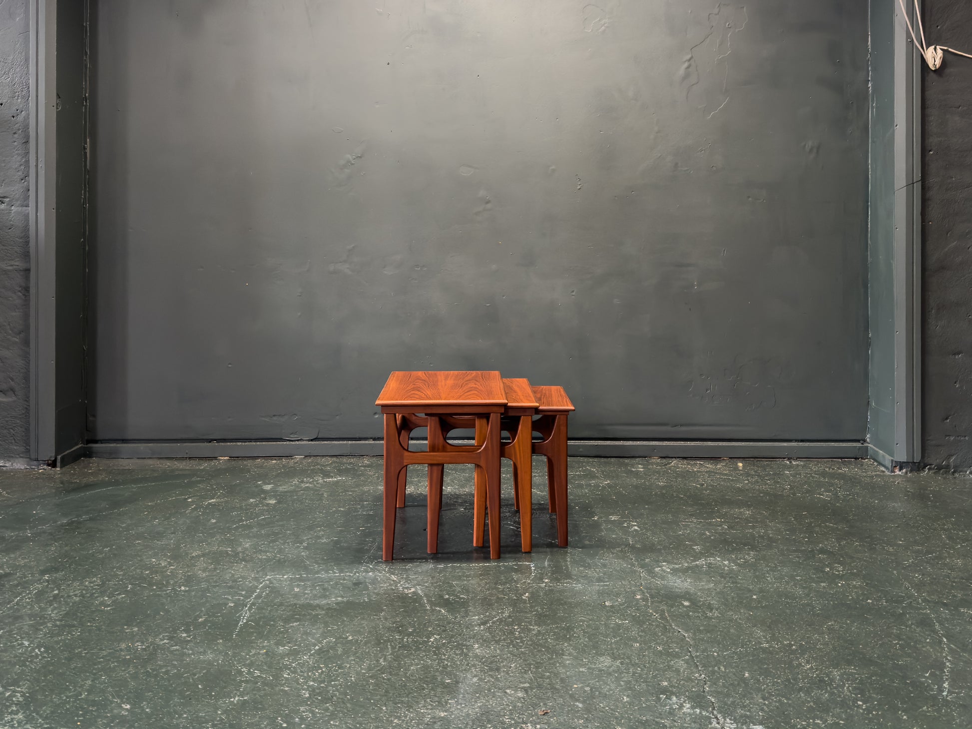 These teak nesting tables by Poul Hundevad are a masterclass in modular symmetry and the simplistic Scandinavian philosophy. The design is defined by a rhythmic, stepped silhouette, where three graduated rectangular tables slide seamlessly into one another to form a single, compact unit. Each table features a beautifully crafted frame with soft edges and incredible attention to detail, which provides a delicate visual frame. The golden teak wood offers a warmth to the tables while providing a tactility and durability.