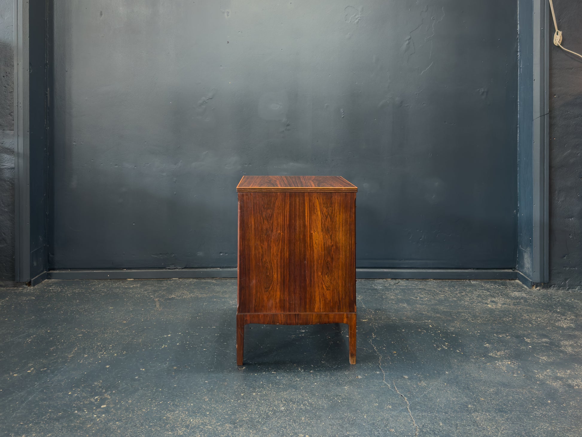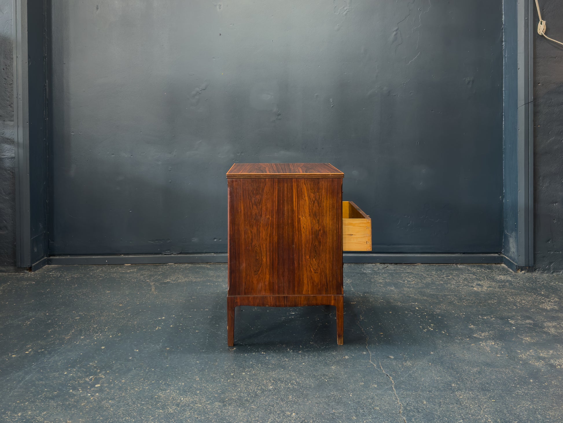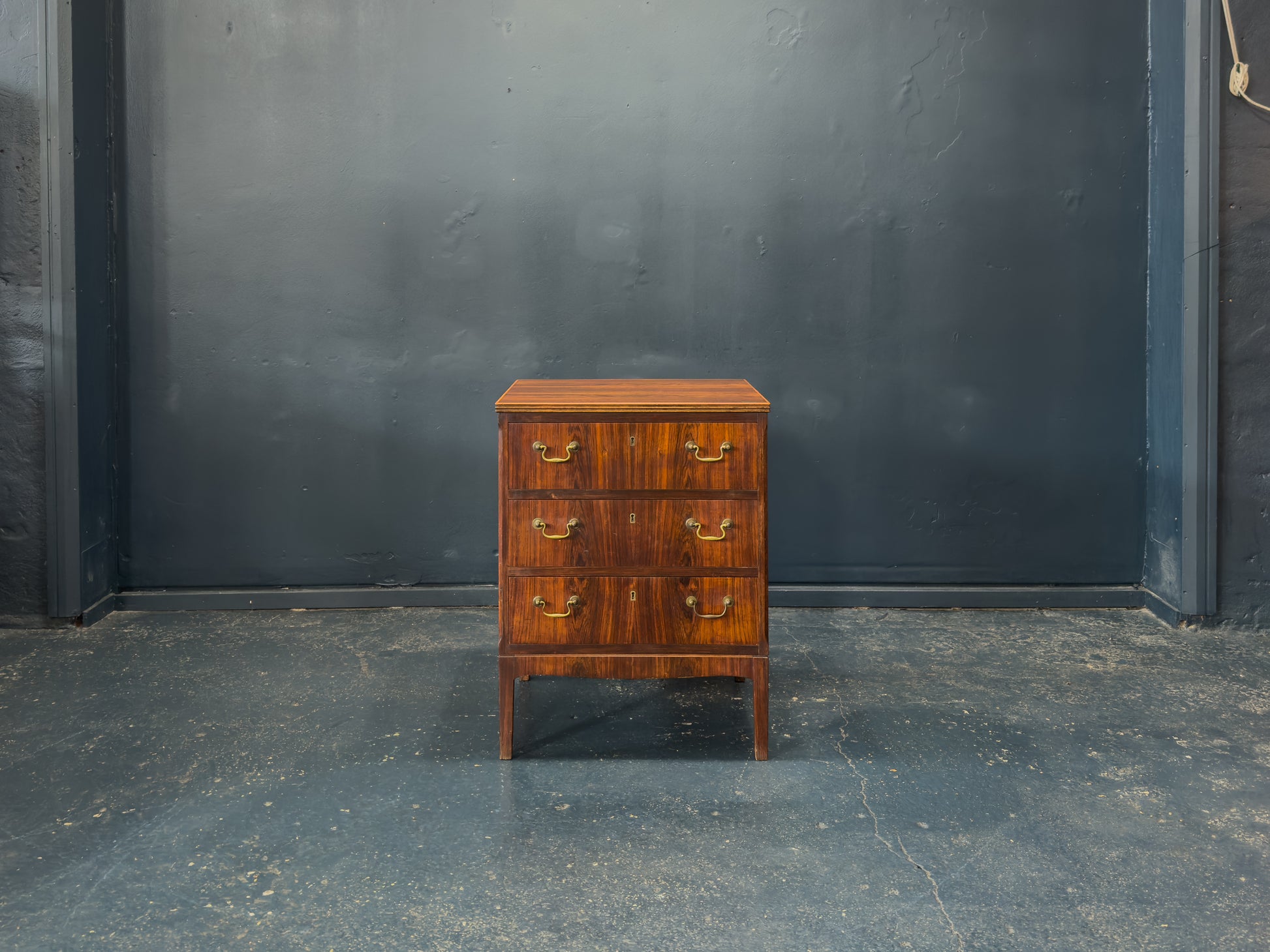 This rosewood chest of drawers features a balanced, rectilinear design that highlights both symmetry and craftsmanship. The piece is structured around three wide drawers, each framed by clean, straight edges that emphasise the vertical grain of the rosewood. Subtle brass pulls add a gentle curve to the otherwise geometric composition, creating a refined contrast in both shape and tone.