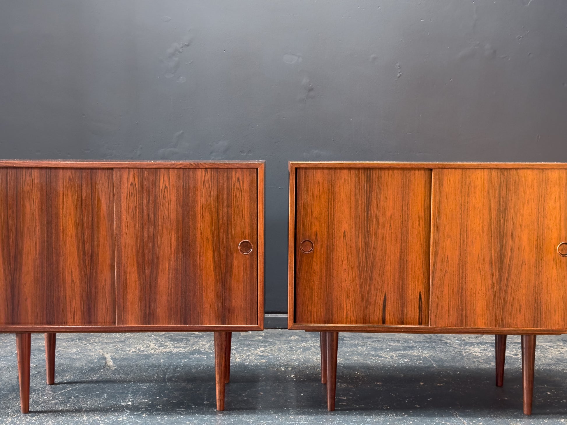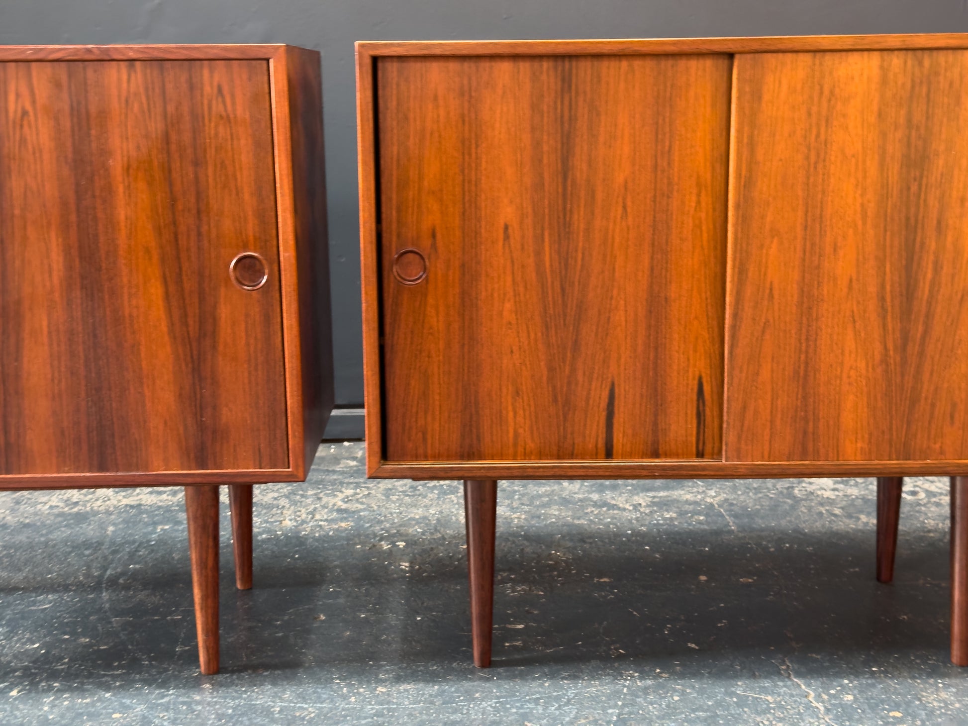 This sophisticated pair of rosewood cabinets are a sleek and functional addition. Each cabinet features beautifully matched rosewood veneers with striking natural grain patterns and rich tonal depth, highlighted by minimalist sliding doors that open to reveal adjustable shelving in both compartments.