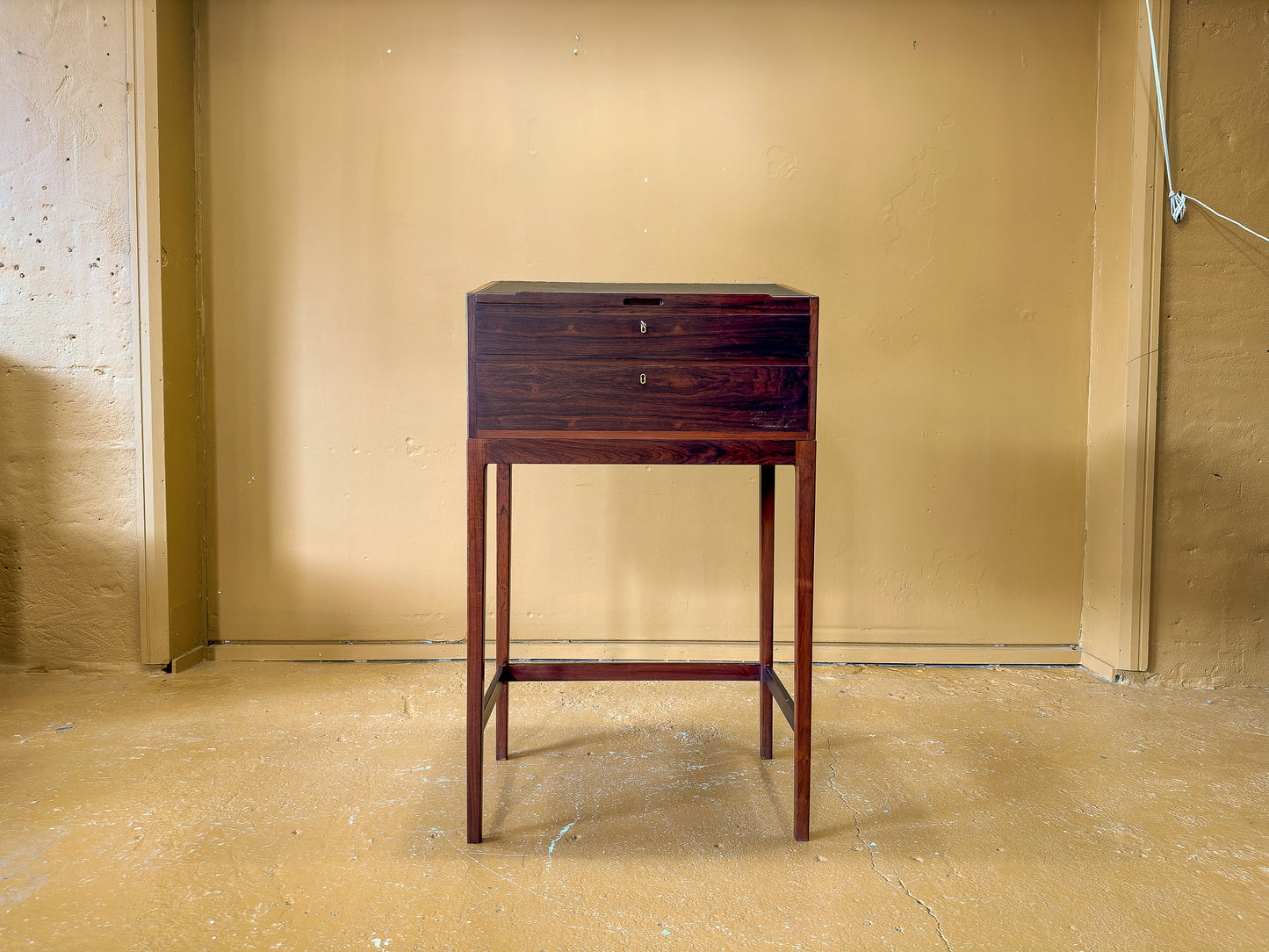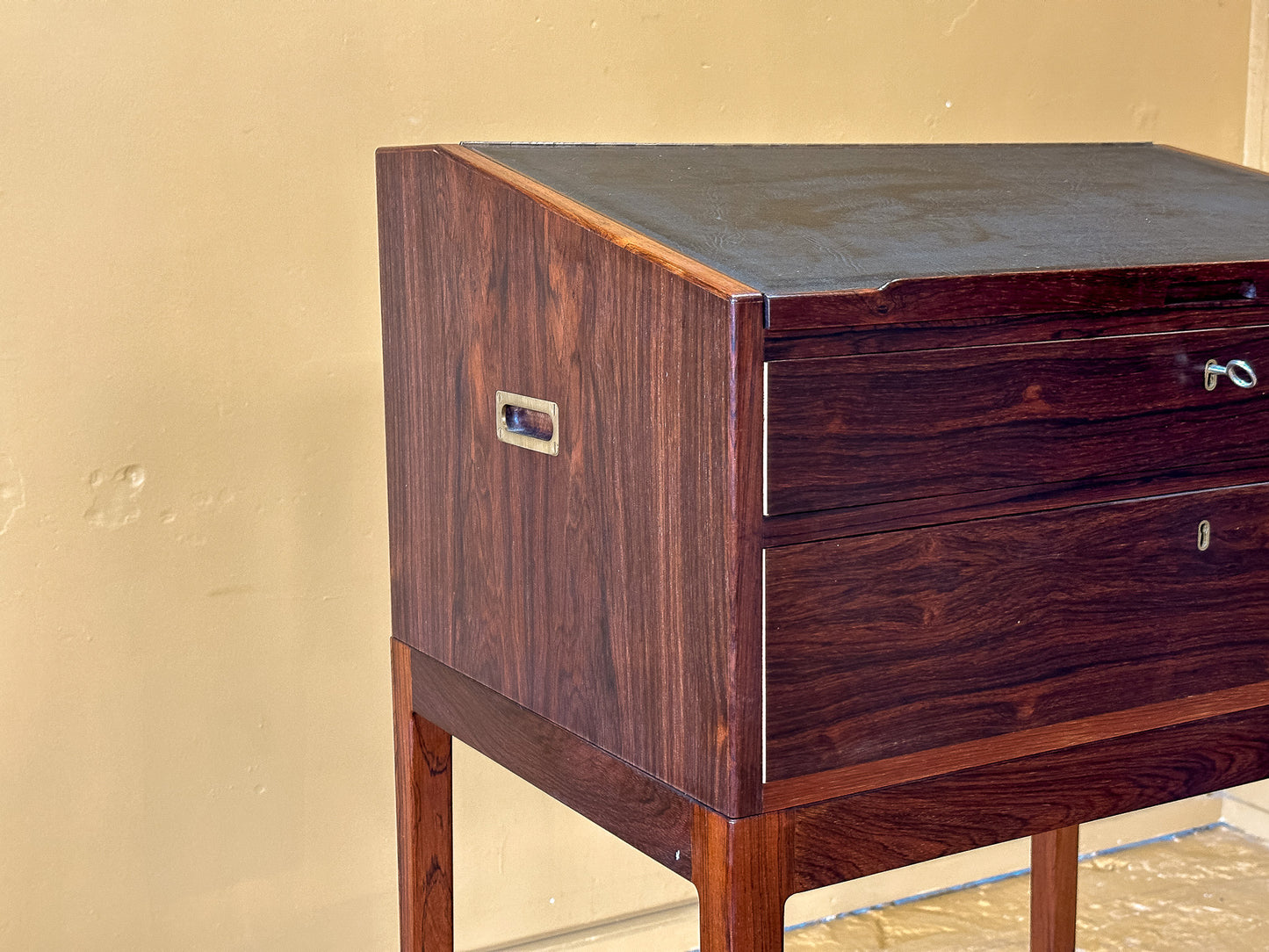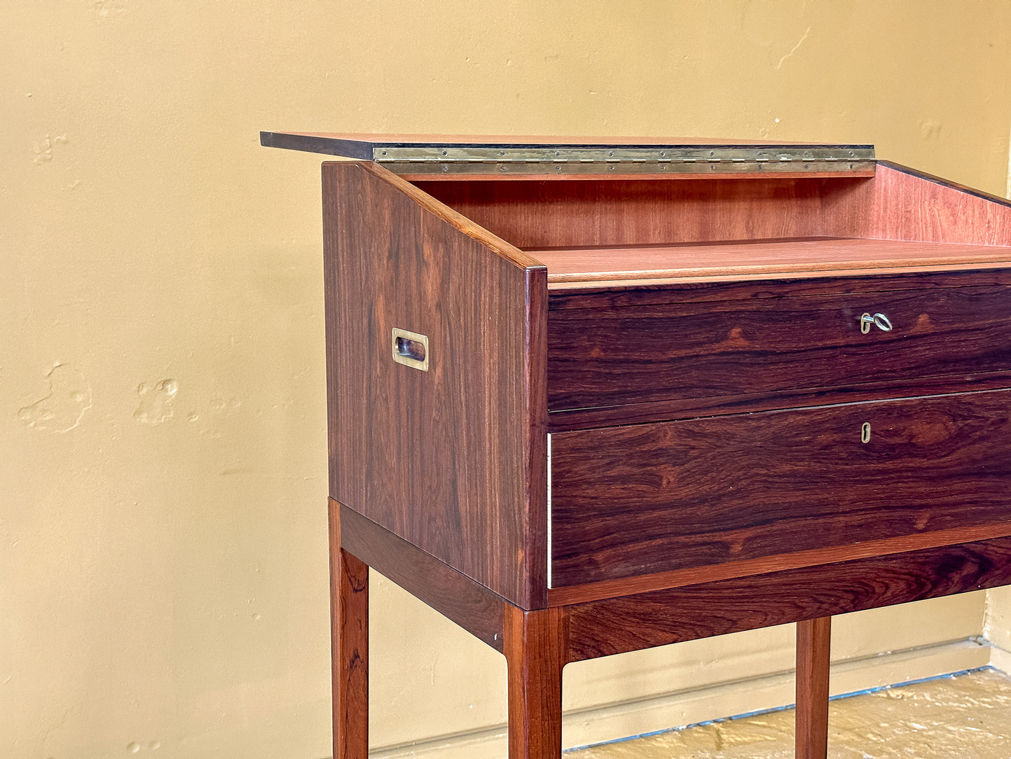 This Danish mid-century standing desk is a striking example of Scandinavian craftsmanship, combining functionality with a refined aesthetic. Made from richly grained rosewood, the piece showcases deep, warm tones with a lustrous finish that highlights the natural beauty of the wood. The slim, elegant profile and tall, tapered legs give it a light, sophisticated presence, making it an ideal addition to modern and vintage-inspired interiors alike.