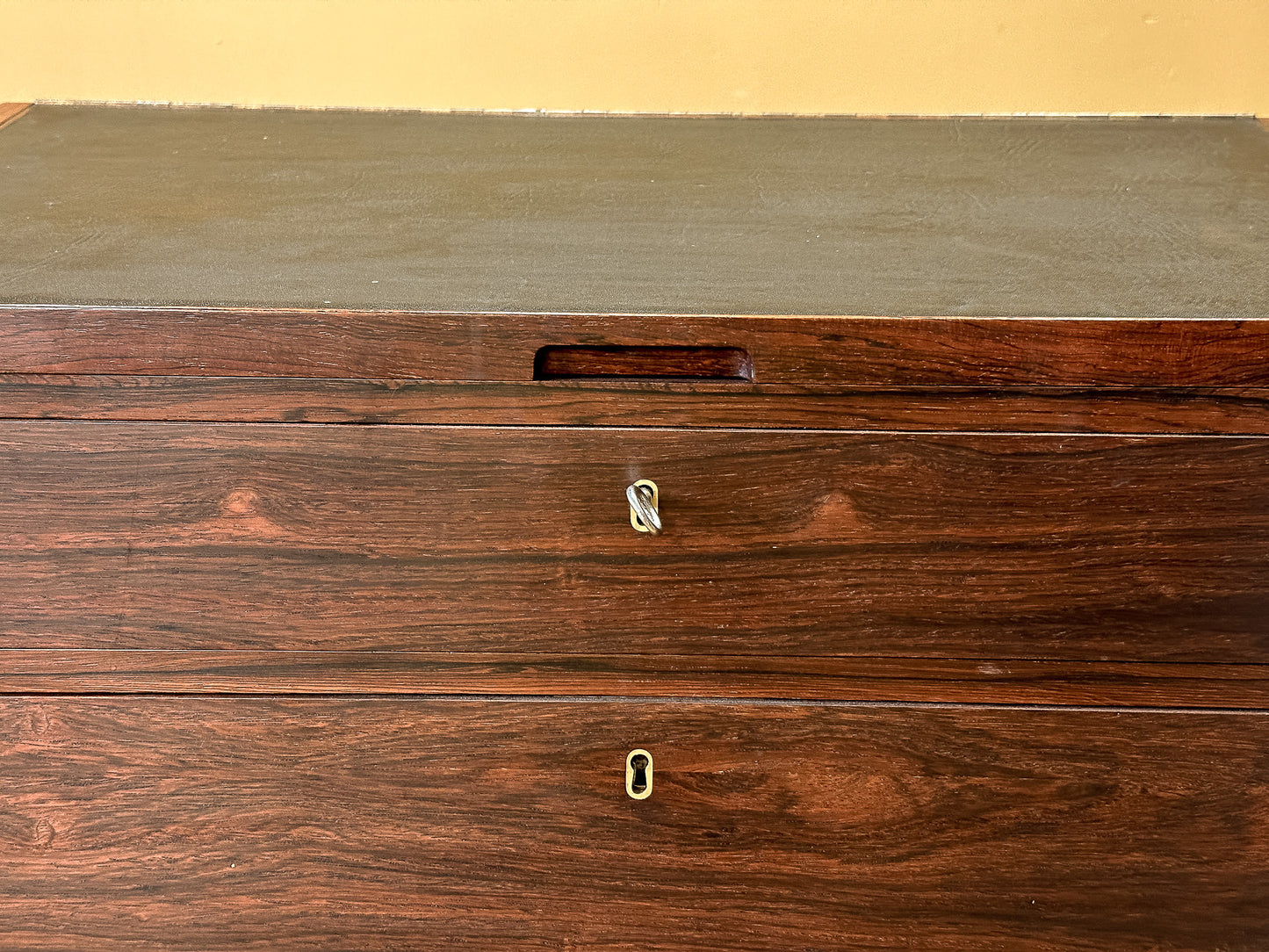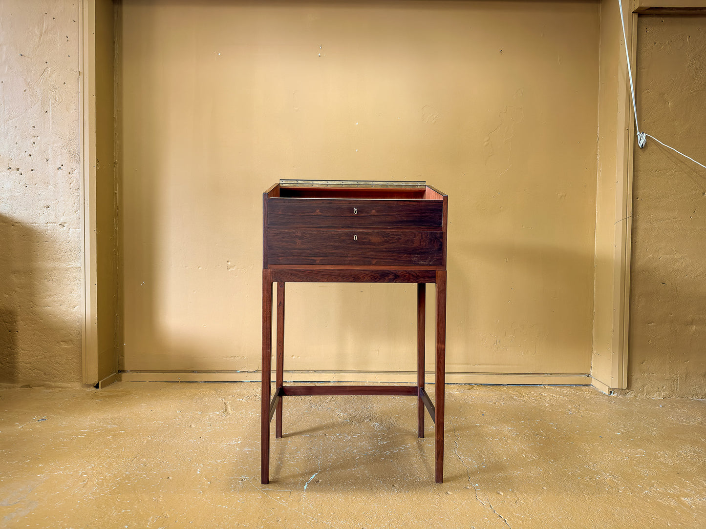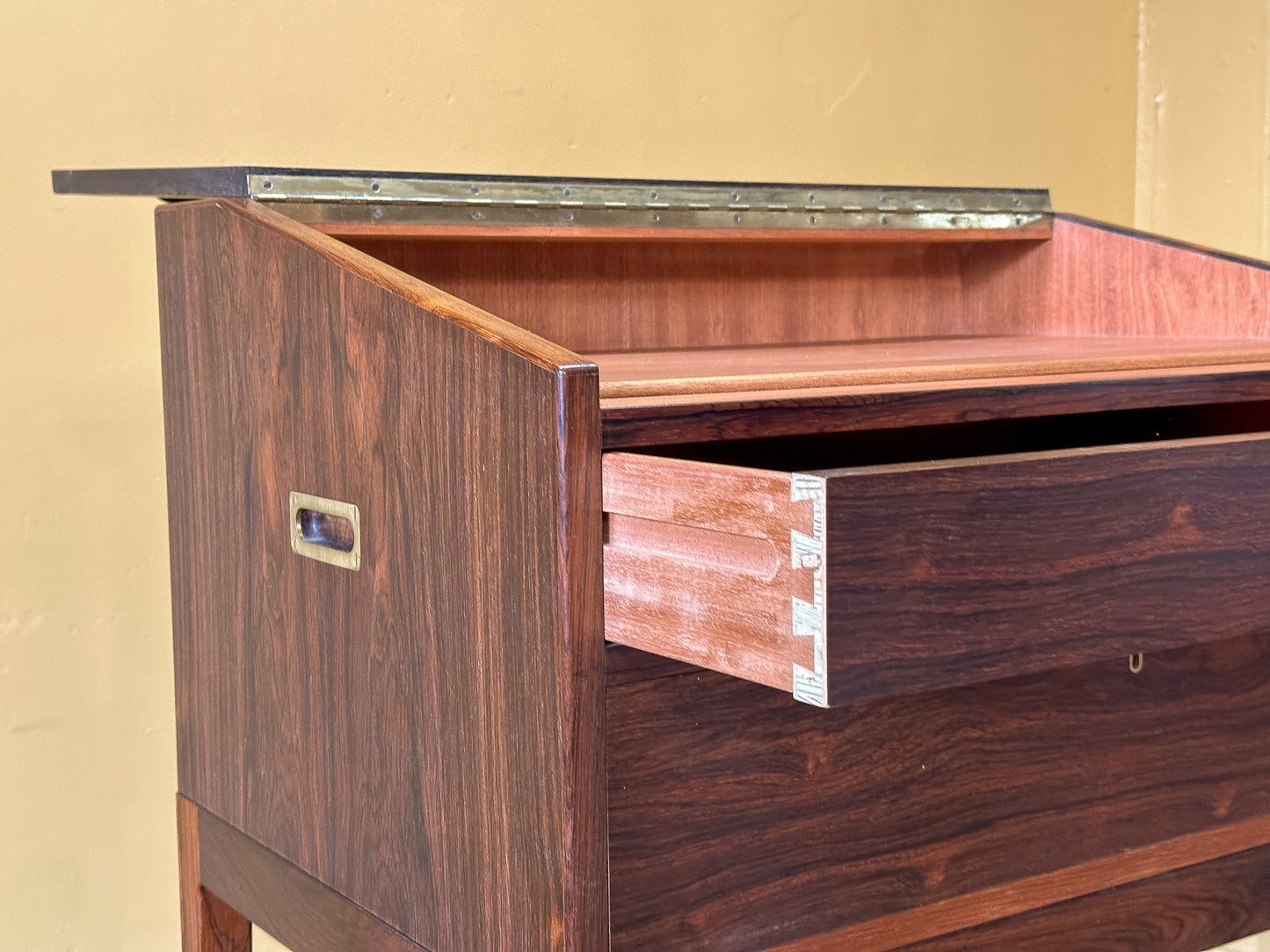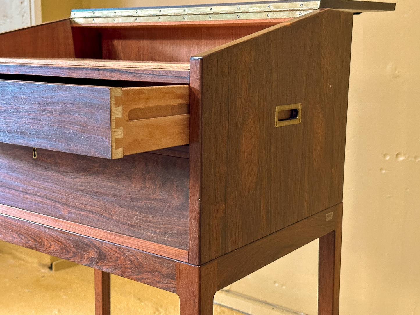 This Danish mid-century standing desk is a striking example of Scandinavian craftsmanship, combining functionality with a refined aesthetic. Made from richly grained rosewood, the piece showcases deep, warm tones with a lustrous finish that highlights the natural beauty of the wood. The slim, elegant profile and tall, tapered legs give it a light, sophisticated presence, making it an ideal addition to modern and vintage-inspired interiors alike.