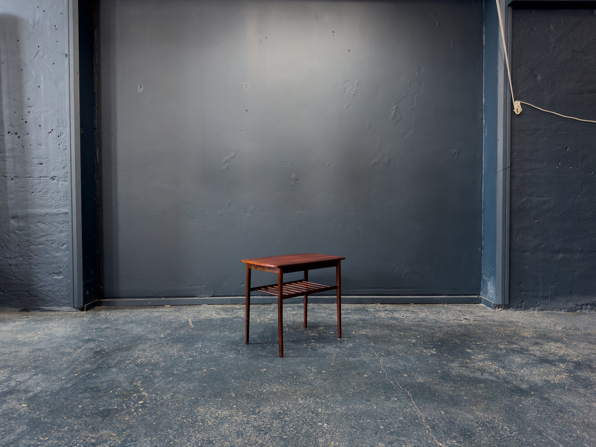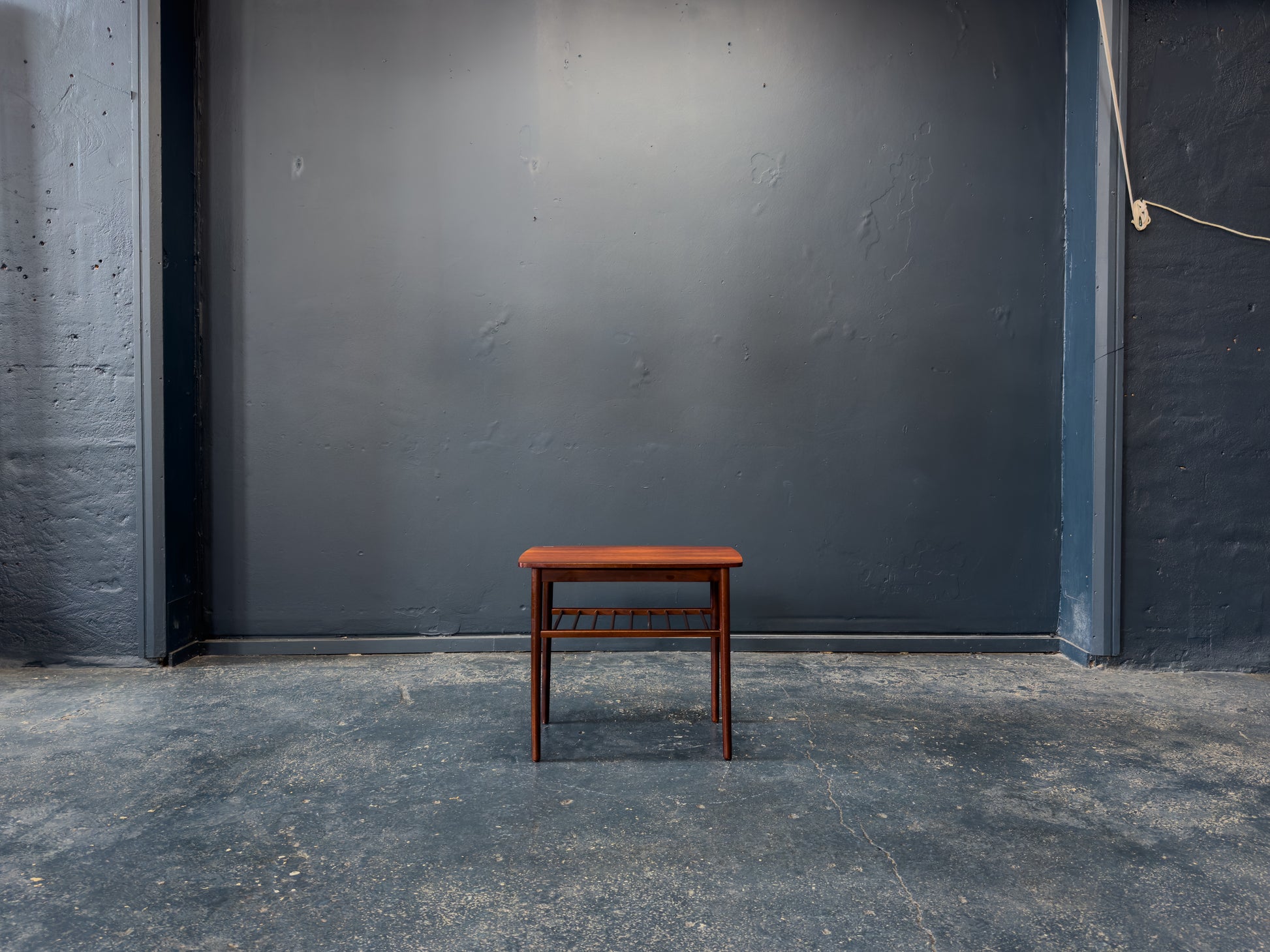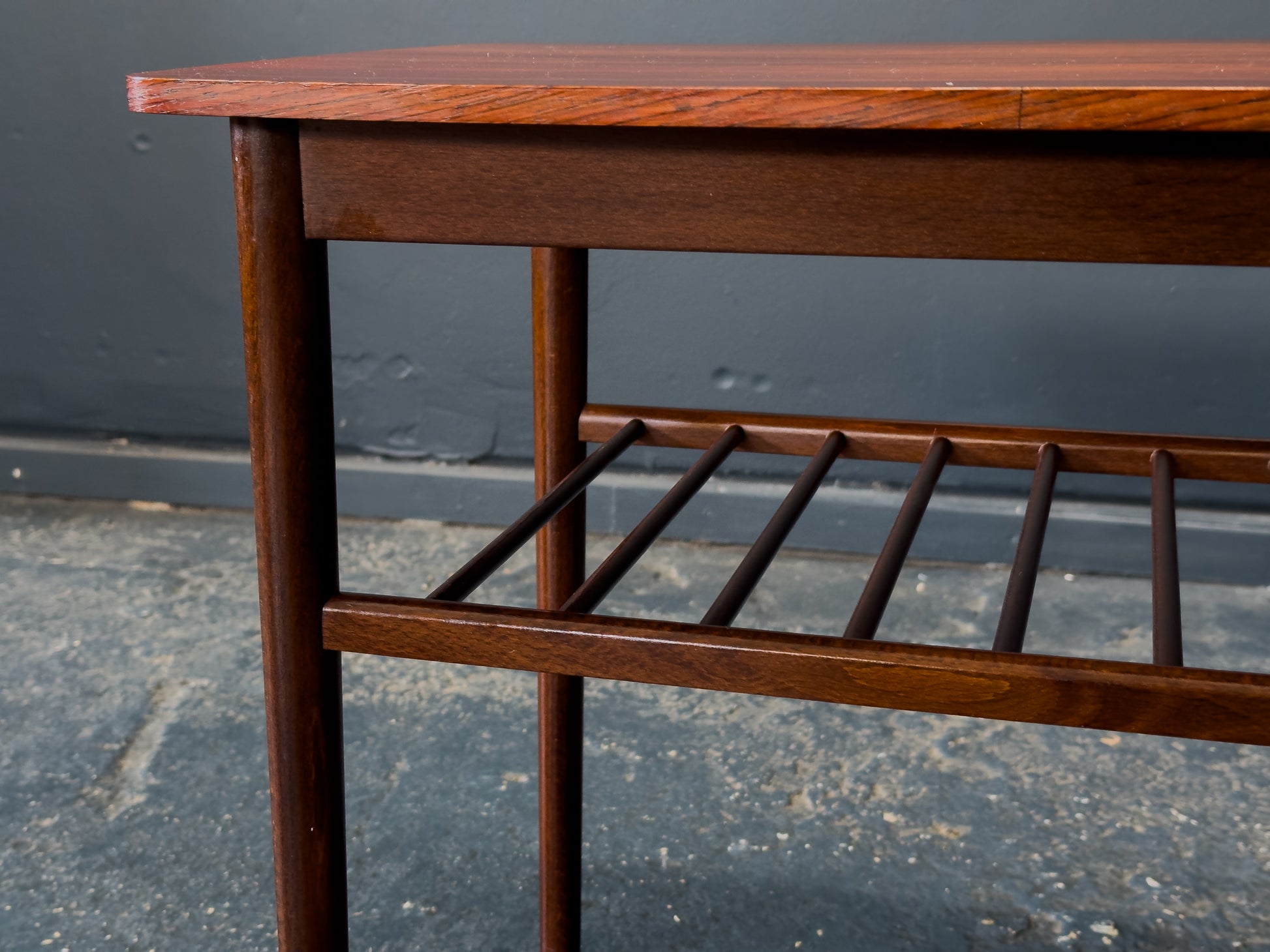 Below the tabletop sits a practical slatted shelf — ideal for magazines or books — adding both visual balance and functionality. The slim, tapering legs give the table a light and refined silhouette, typical of Danish modern craftsmanship.