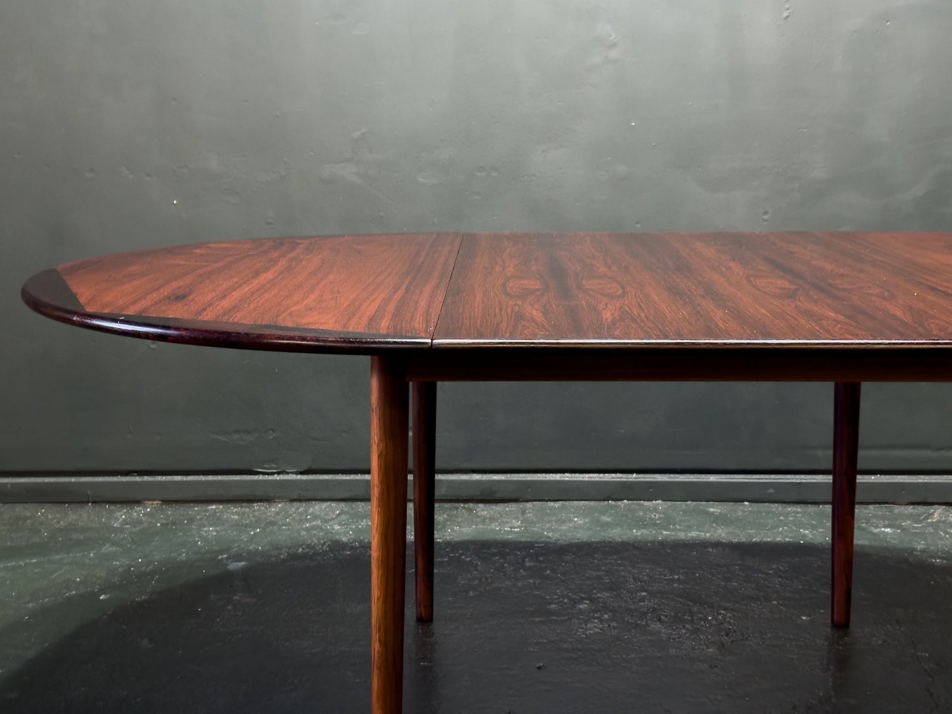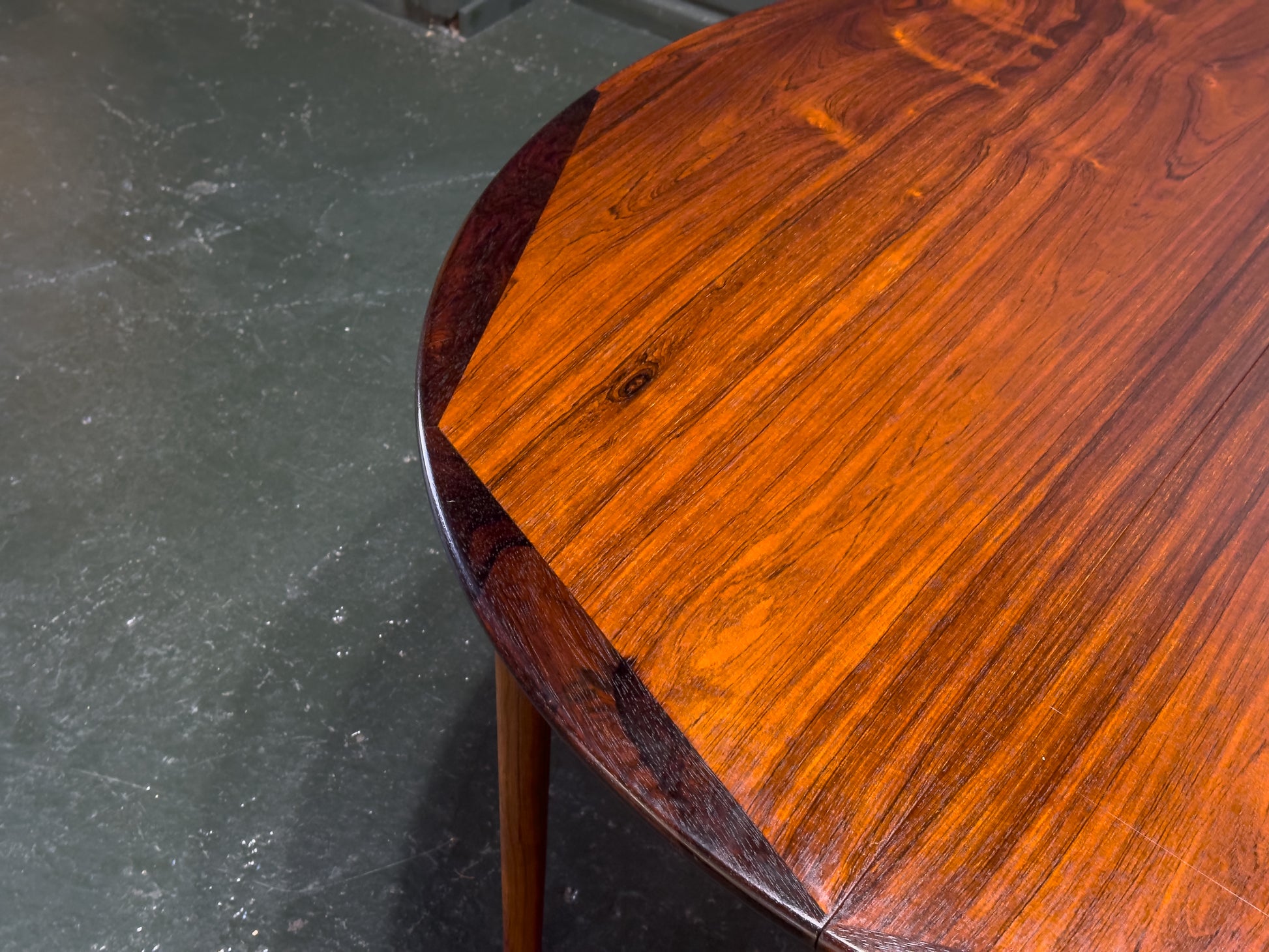 This extending rosewood dining table is a tour de force of Danish cabinetry, showcasing a masterful approach to geometric symmetry and material luxury. The circular tabletop showcases an extraordinary design highlighting the meticulous joinery and skilled craftsmanship of this piece. The central rosewood composition is framed by a darker rosewood perimeter with integrated curved joinery, ensuring a seamless transition between the primary surface and its elegantly beveled edges.