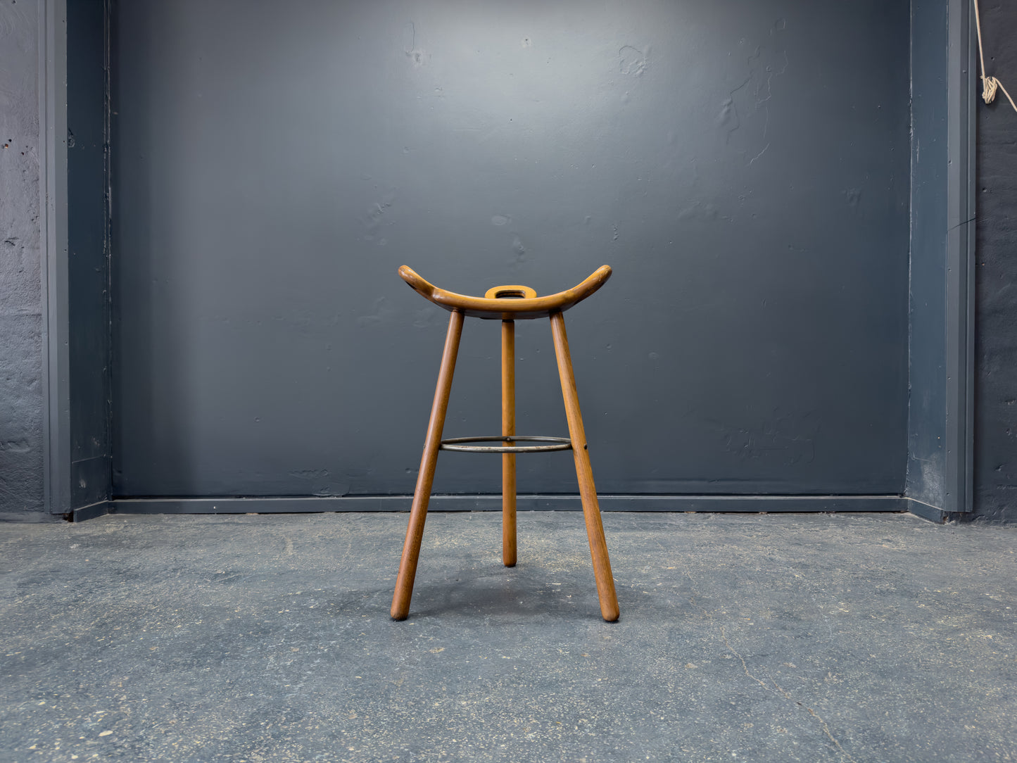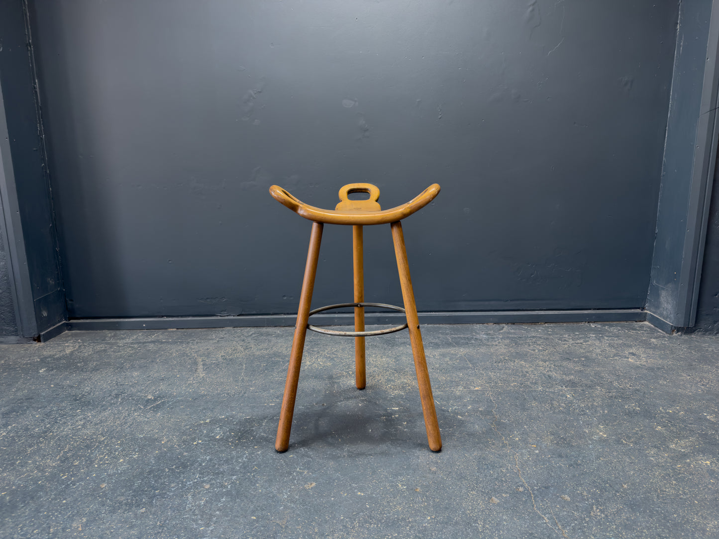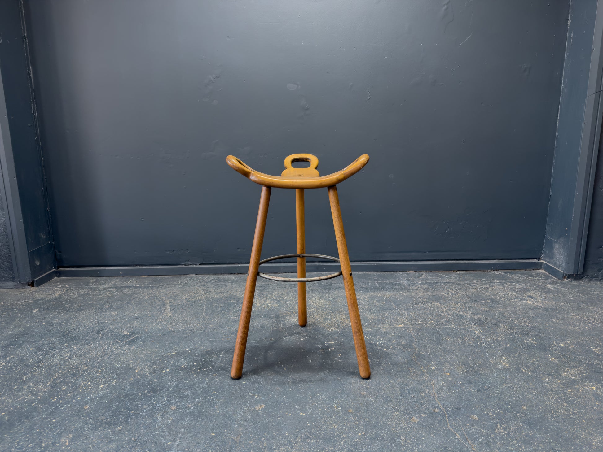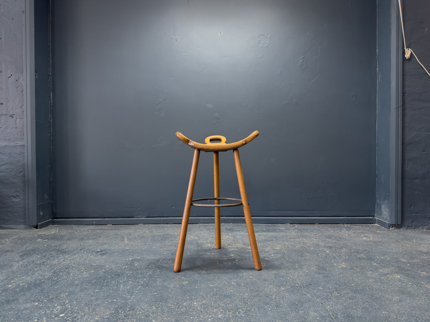 Crafted from solid wood with a distinctive saddle-shaped seat, the Merbella stool stands out with its expressive, organically carved form and exaggerated handle-like ends that invite interaction and visual curiosity. The gently curved seat is not only a visual signature but also offers comfort and support, making the stool as practical as it is expressive. The three-legged base is reinforced with a circular metal footrest, balancing structural integrity with graceful asymmetry.