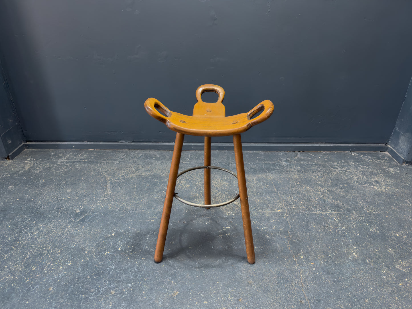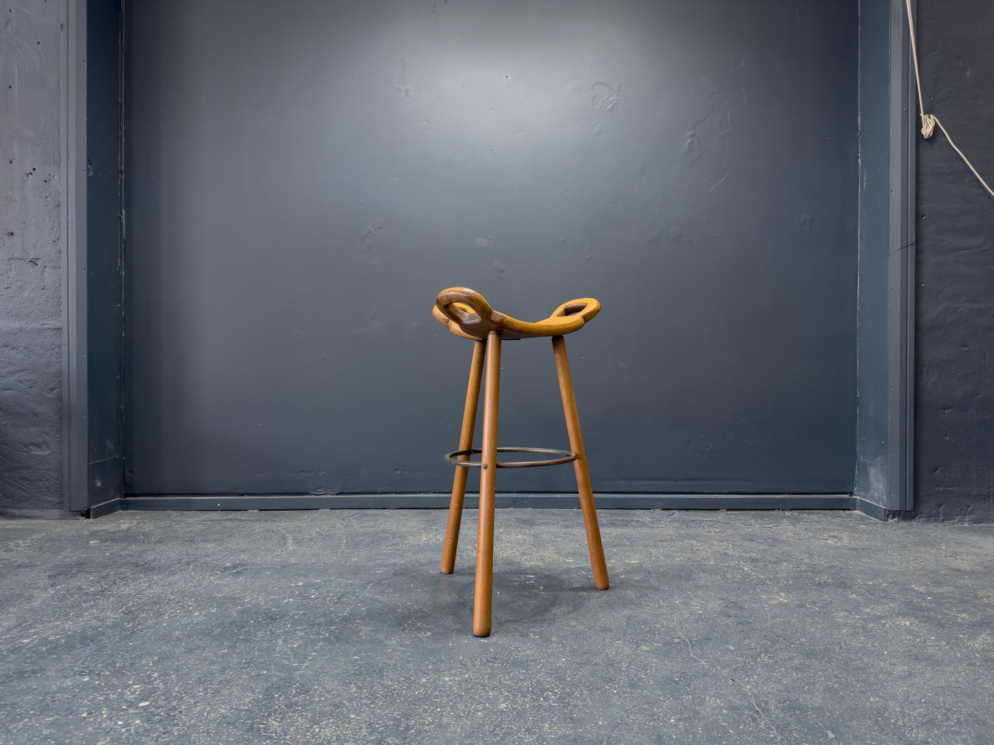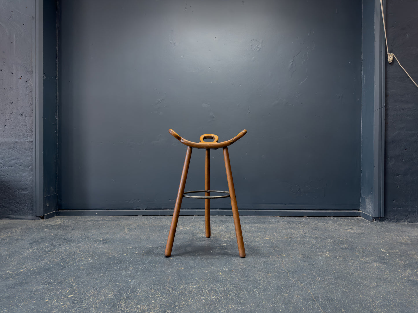 Crafted from solid wood with a distinctive saddle-shaped seat, the Merbella stool stands out with its expressive, organically carved form and exaggerated handle-like ends that invite interaction and visual curiosity. The gently curved seat is not only a visual signature but also offers comfort and support, making the stool as practical as it is expressive. The three-legged base is reinforced with a circular metal footrest, balancing structural integrity with graceful asymmetry.