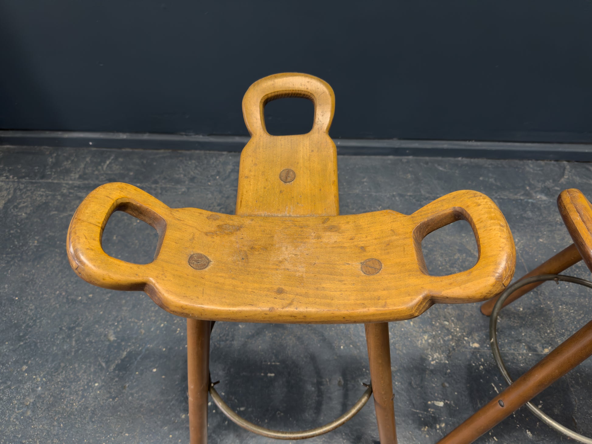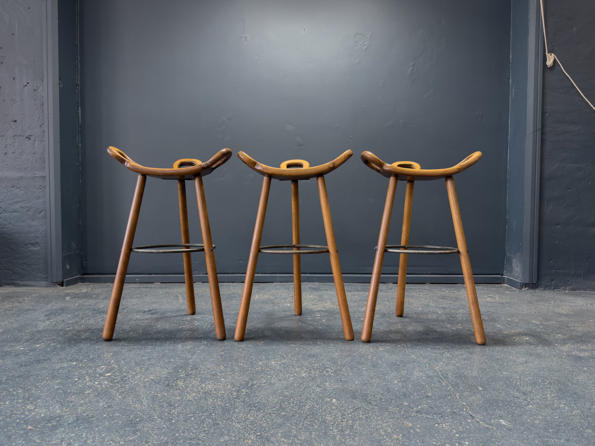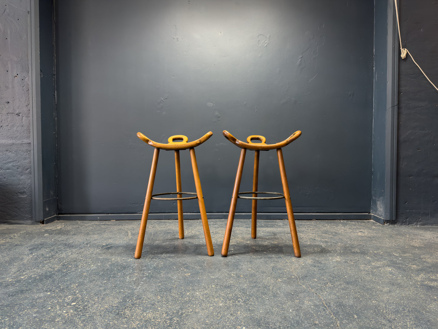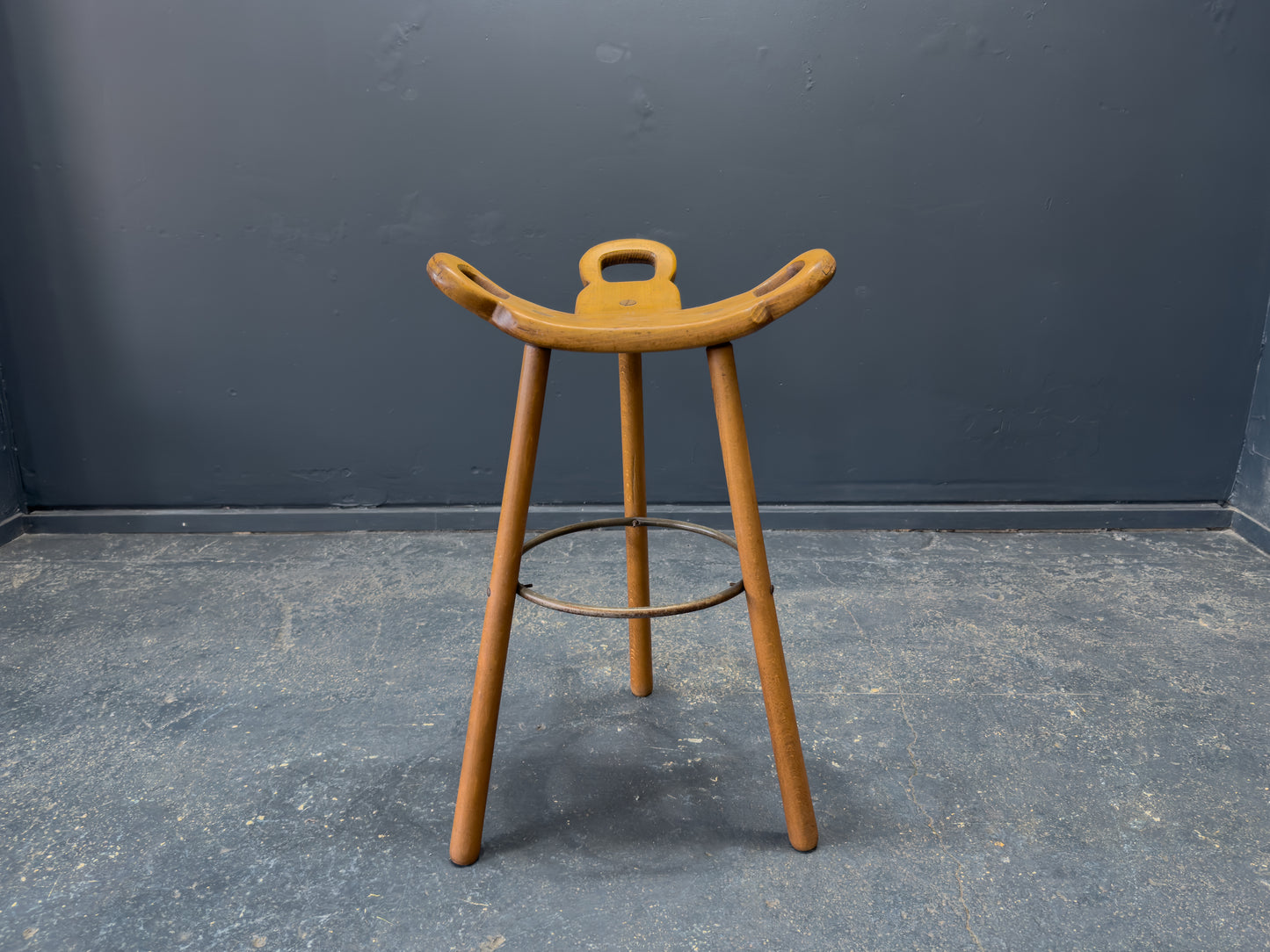 Crafted from solid wood with a distinctive saddle-shaped seat, the Merbella stool stands out with its expressive, organically carved form and exaggerated handle-like ends that invite interaction and visual curiosity. The gently curved seat is not only a visual signature but also offers comfort and support, making the stool as practical as it is expressive. The three-legged base is reinforced with a circular metal footrest, balancing structural integrity with graceful asymmetry.
