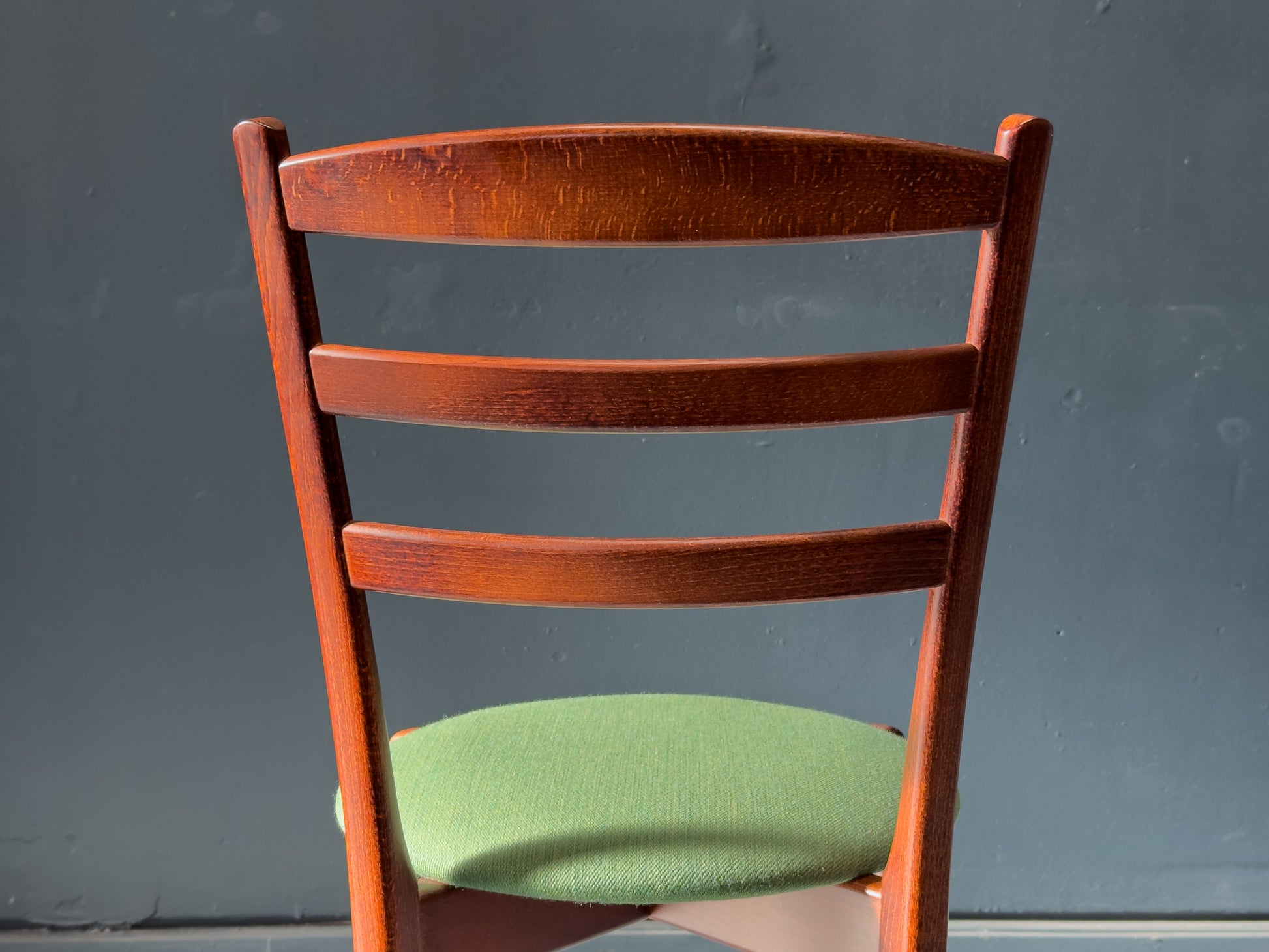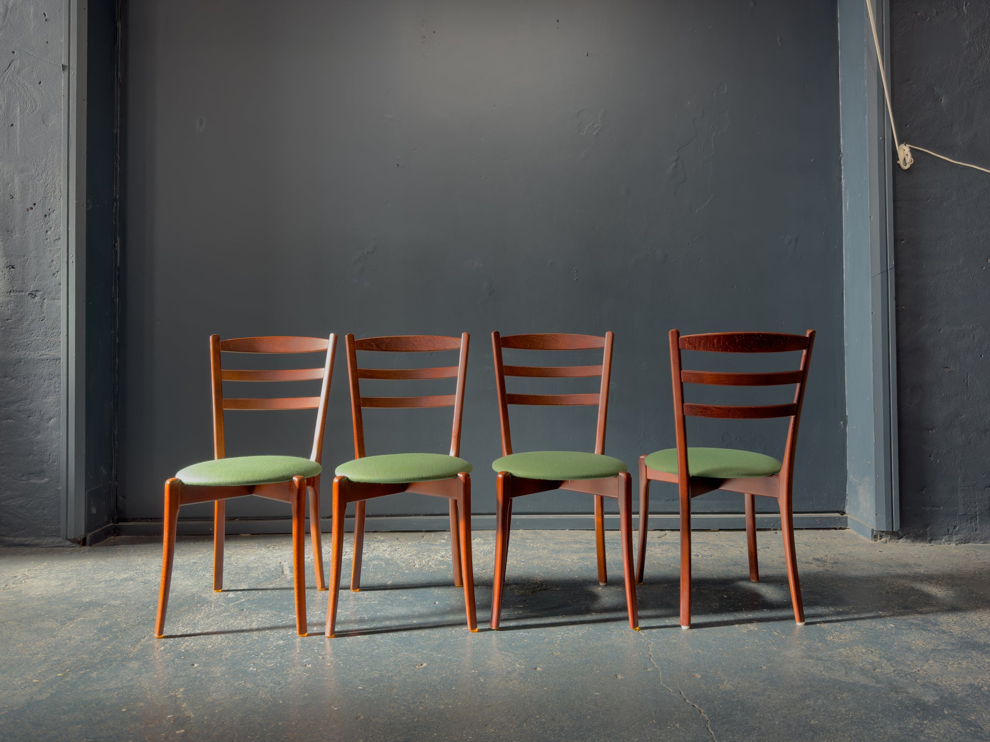 This gorgeous set of four mid-century dining chairs are a must have edition round any table. Crafted from warmly toned wood, each chair features a gently curved ladder-back frame paired with slender, tapered legs that lend a light and balanced silhouette.
