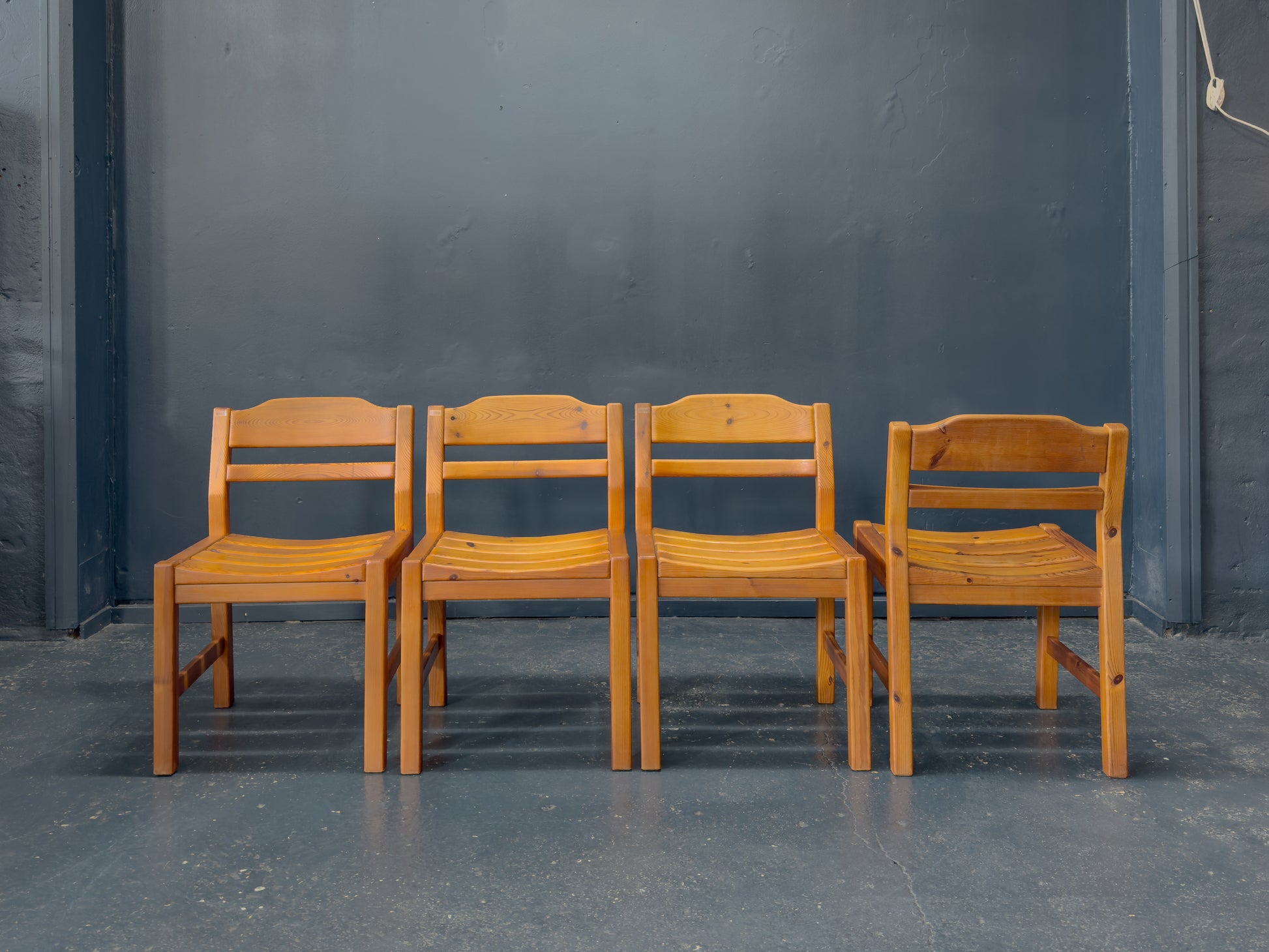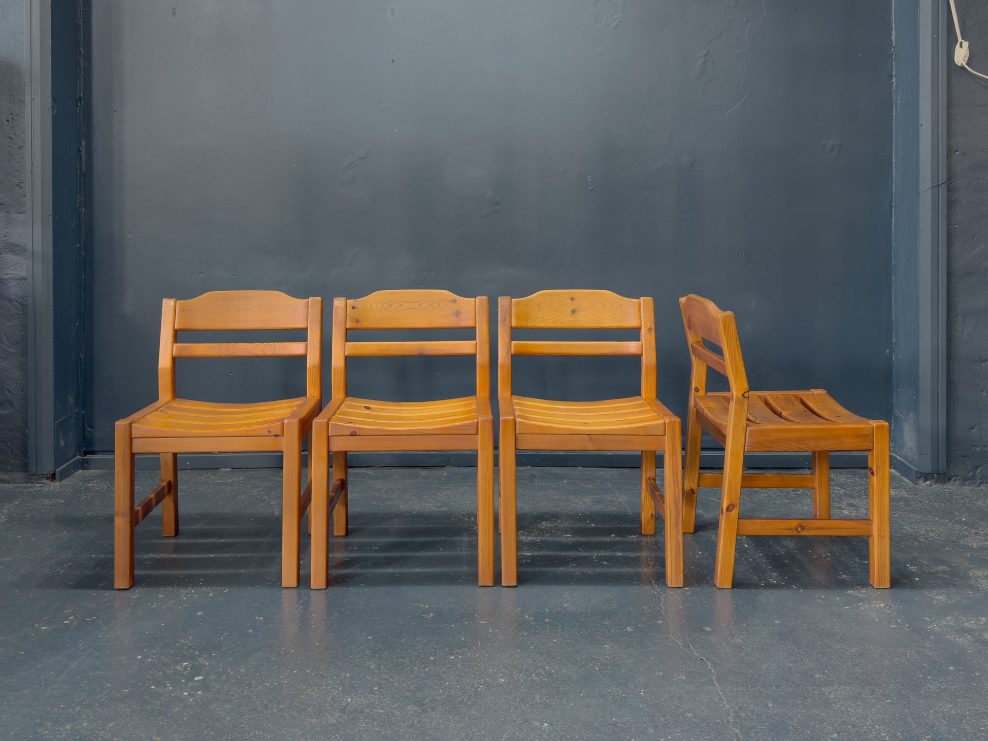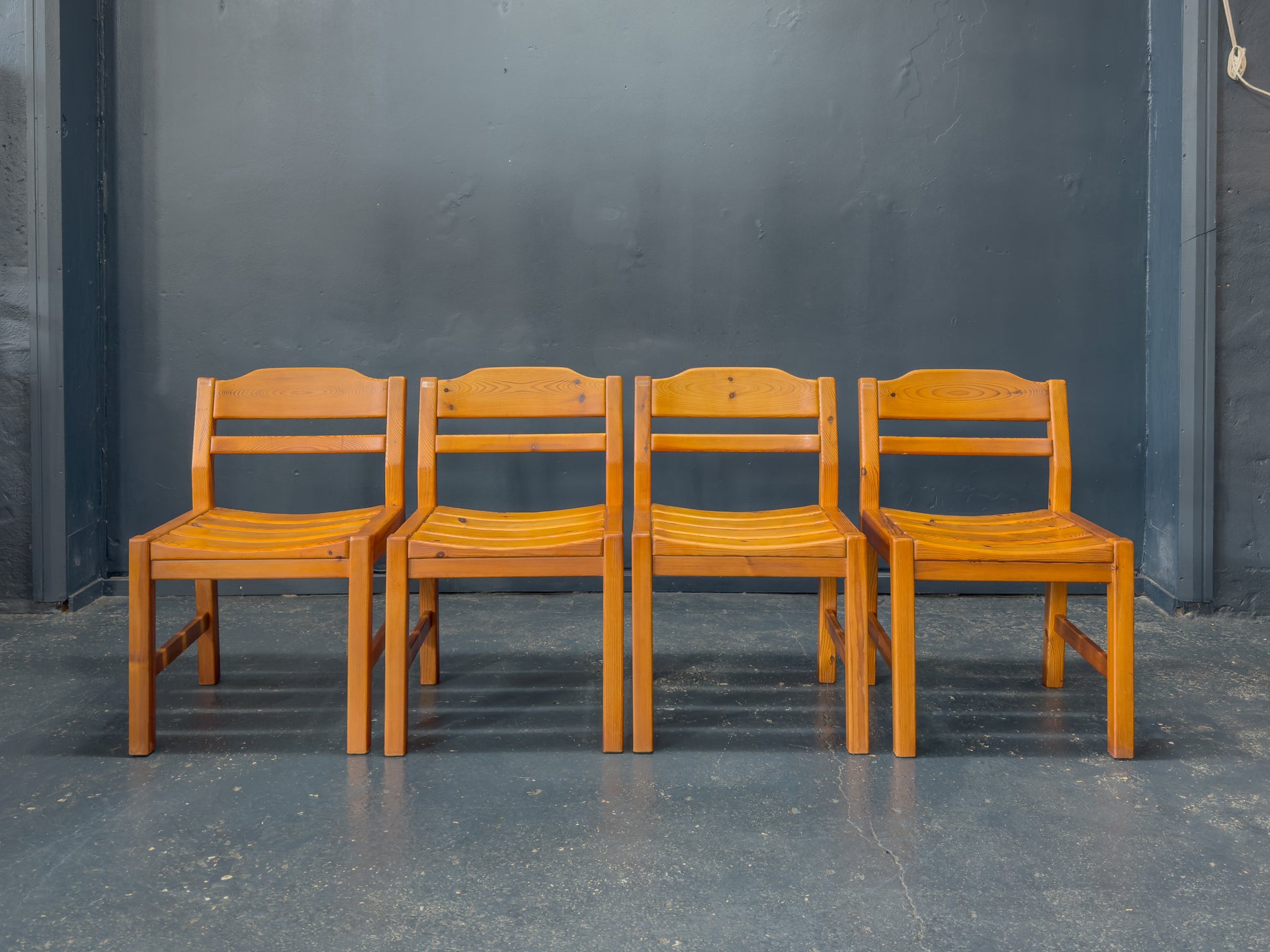 This set of four pine dining chairs features a solid, straightforward design built around strong geometric lines and gentle shaping. Each chair has a slightly contoured seat made from individual curved slats, giving the surface a soft wave that enhances comfort while adding subtle visual rhythm.