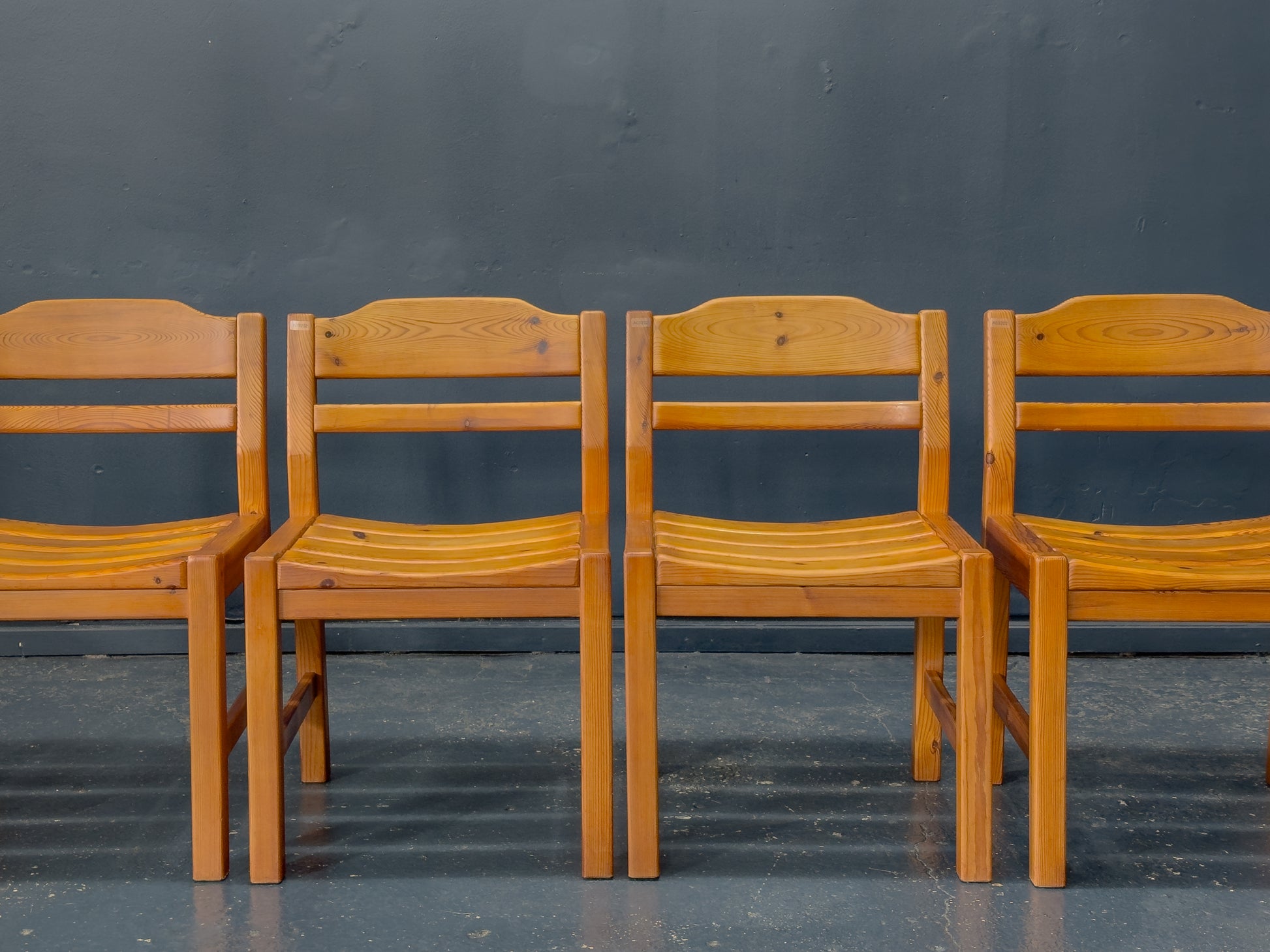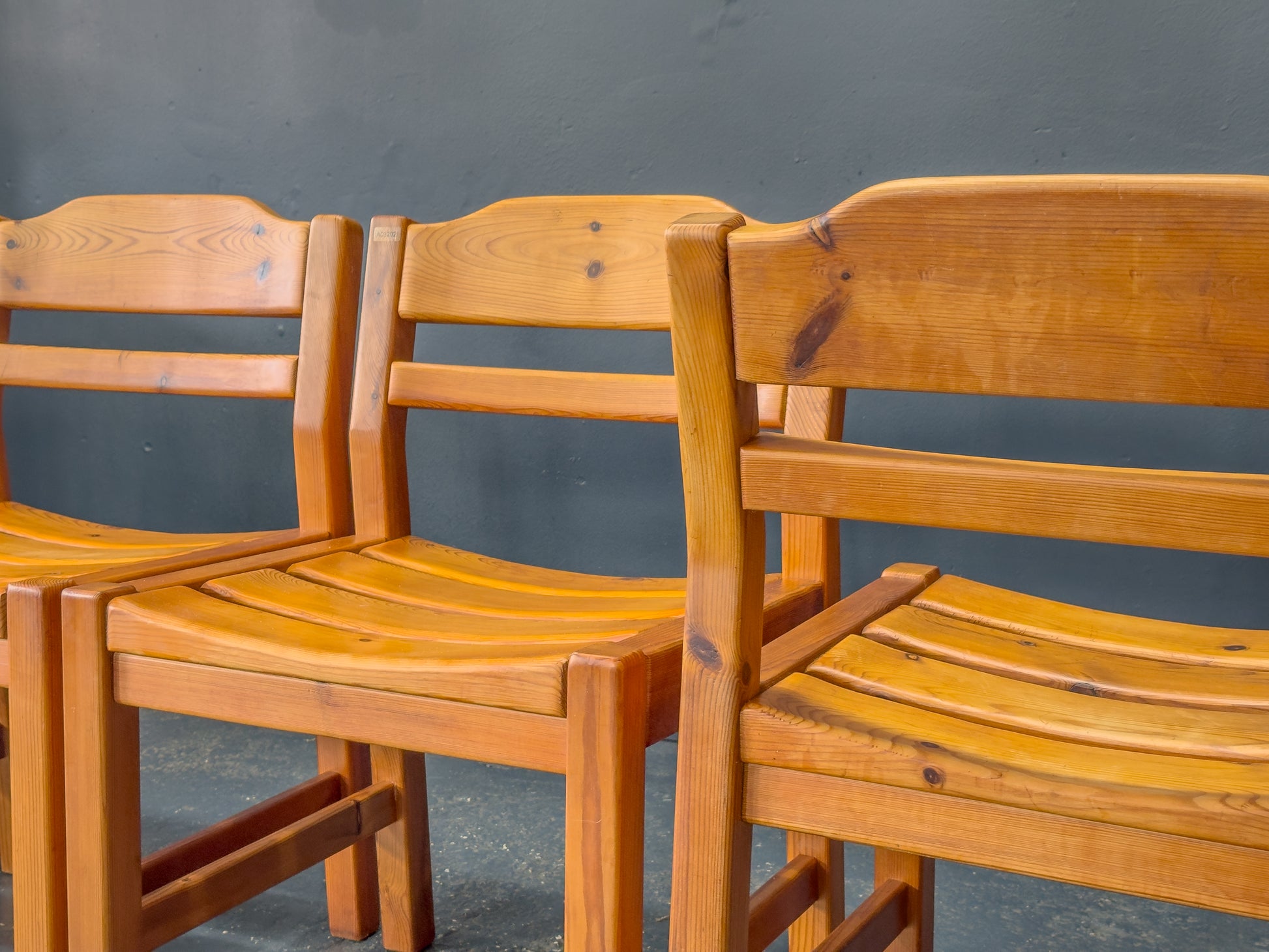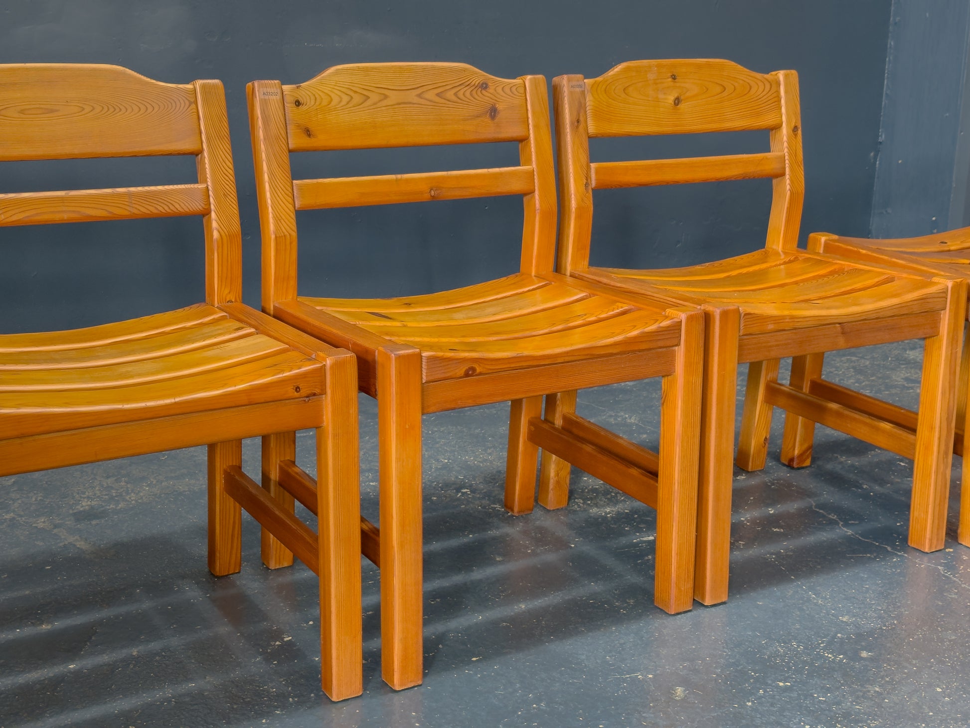 This set of four pine dining chairs features a solid, straightforward design built around strong geometric lines and gentle shaping. Each chair has a slightly contoured seat made from individual curved slats, giving the surface a soft wave that enhances comfort while adding subtle visual rhythm.