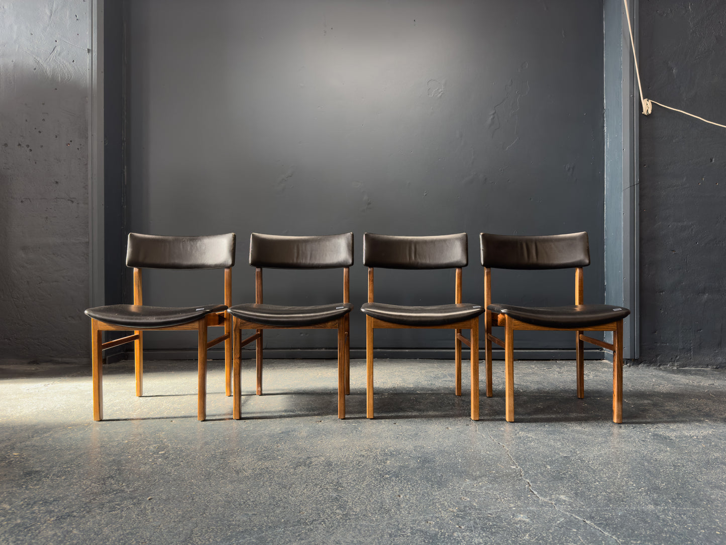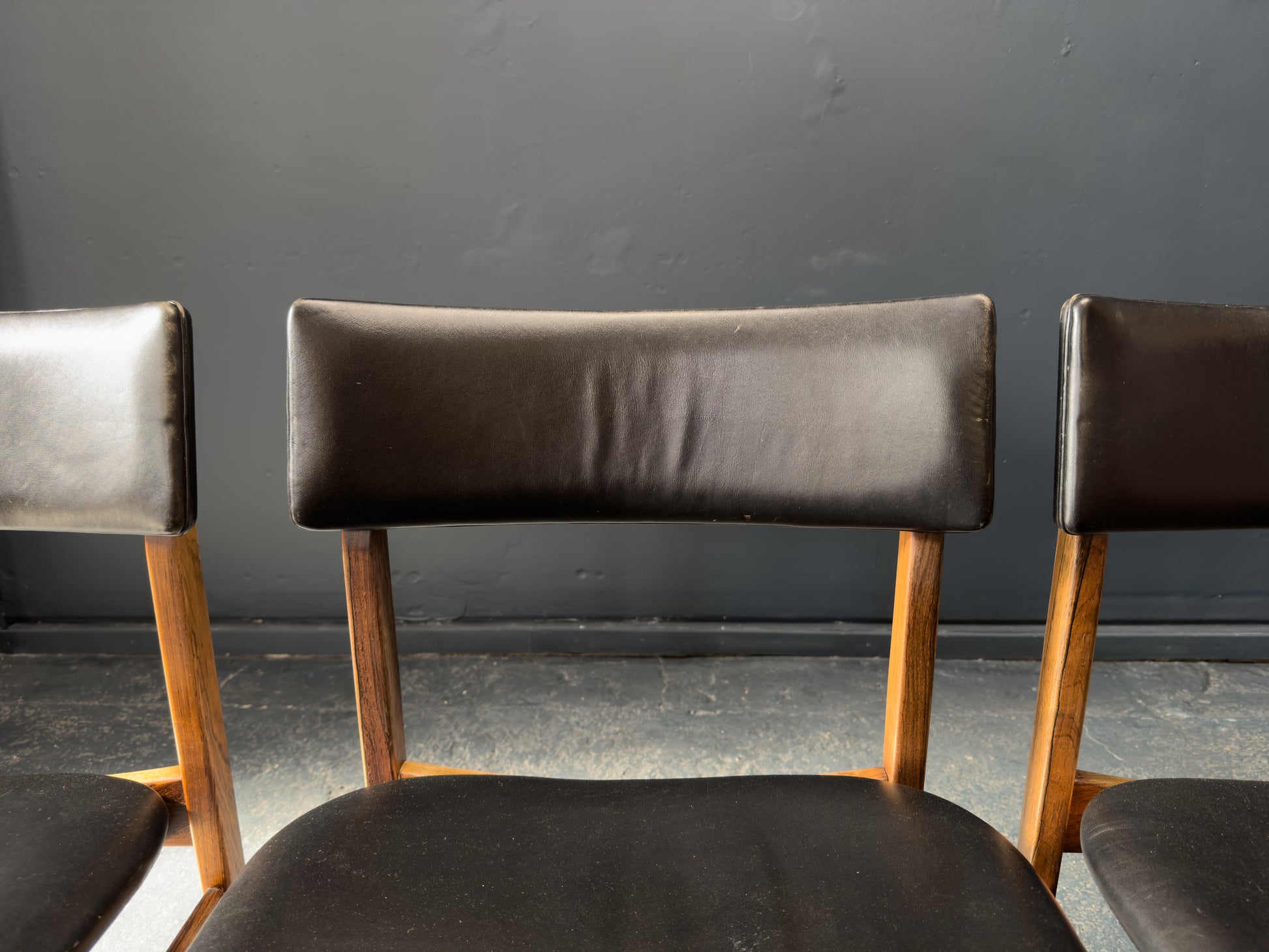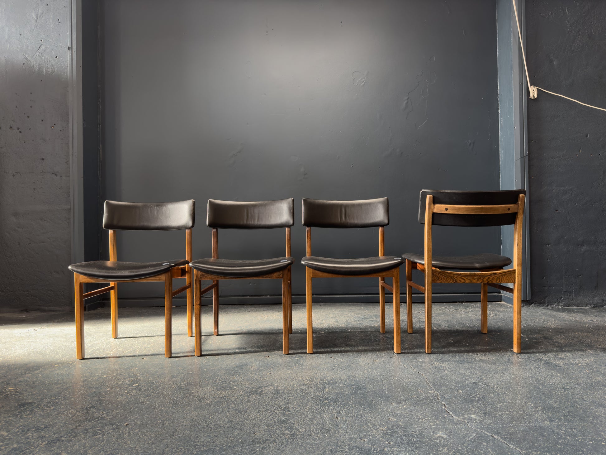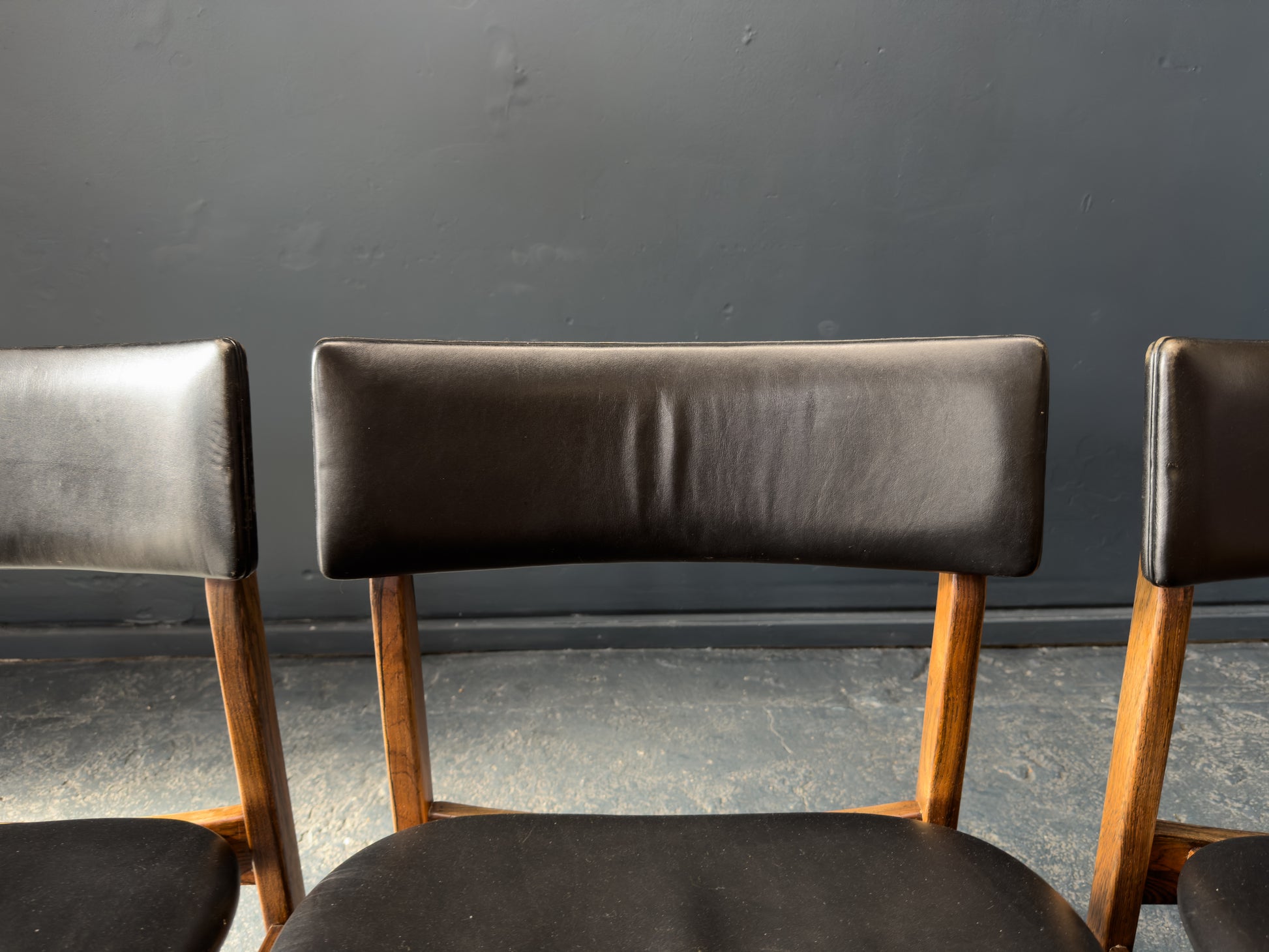 The chairs are upholstered in supple black leather, offering a luxurious contrast to the rosewood and providing lasting comfort. The gently curved backrests are designed for ergonomic support while maintaining a light, floating appearance. Their clean, understated lines and timeless materials make them a staple set.